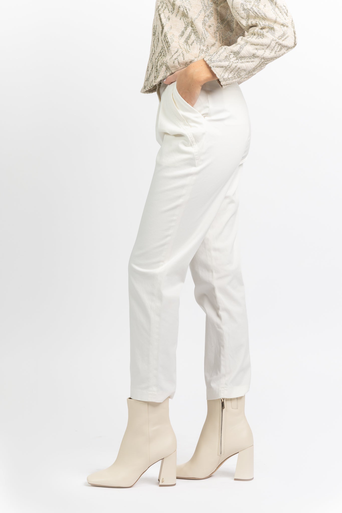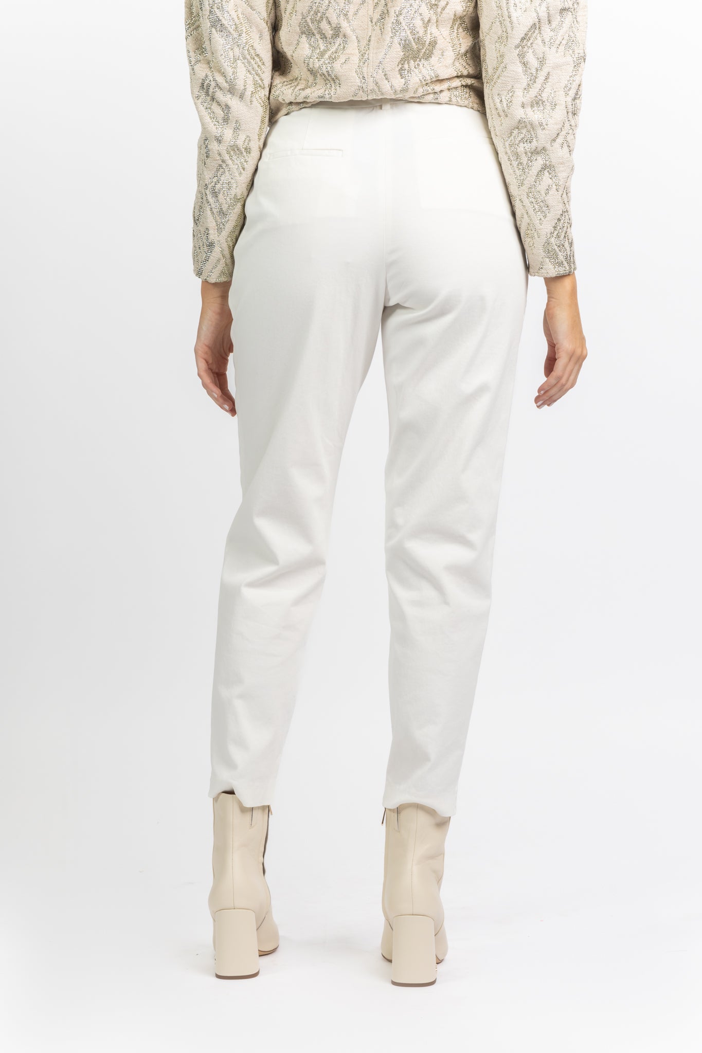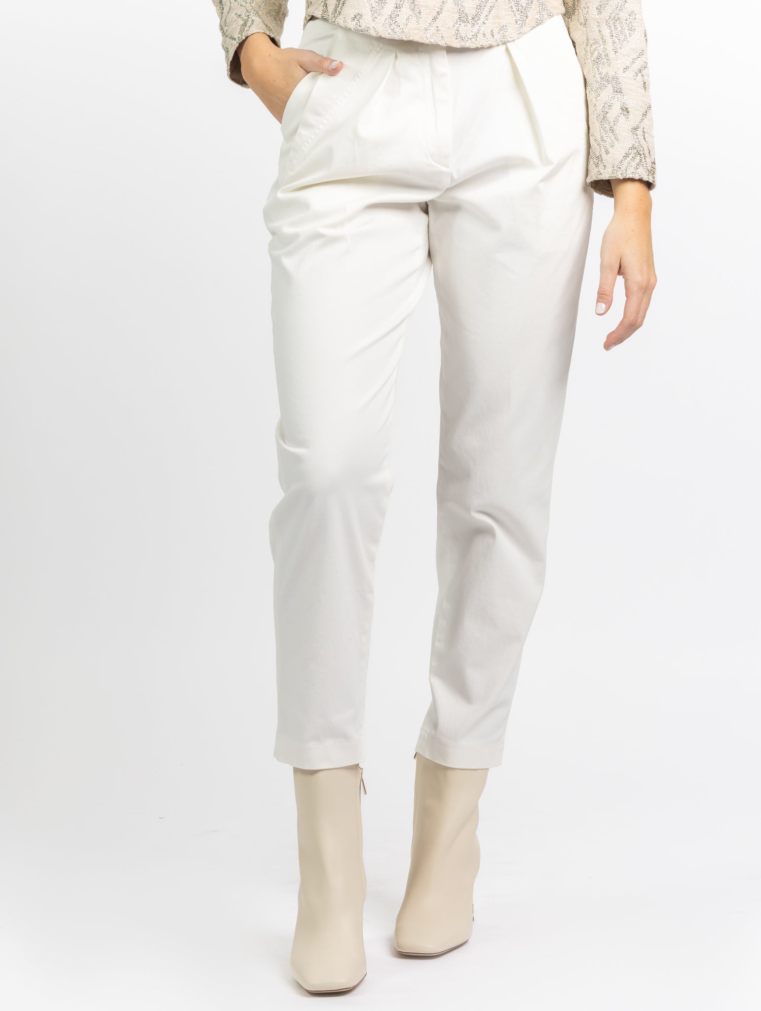 High-waisted pants • Pleats • Zip and hook closure • Side pockets • Back pockets • Main fabric: 97% Cotton, 3% Spandex • Lining: 51% Cotton, 49 % Viscose.
