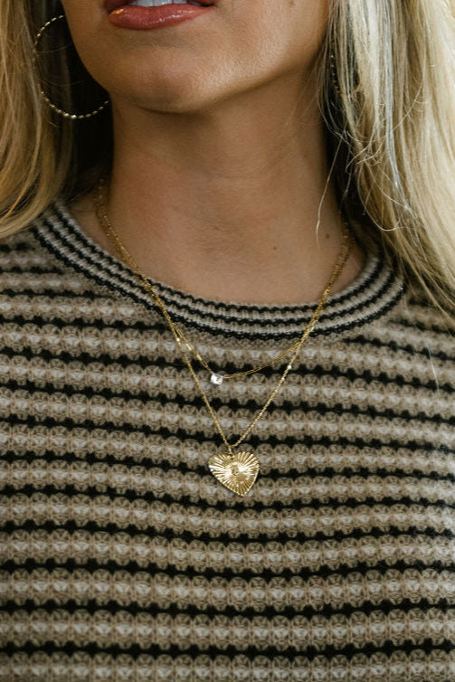 The Jennifer Zuener Sheldon Necklace captivates with its exquisite ridged, heart-shaped pendant adorned with dazzling diamonds at its center. This stunning piece doesn't just accessorize—it transforms your entire look with its radiant sparkle and elegant design. Make a statement that speaks volumes about your refined taste and elevate any outfit from ordinary to extraordinary.