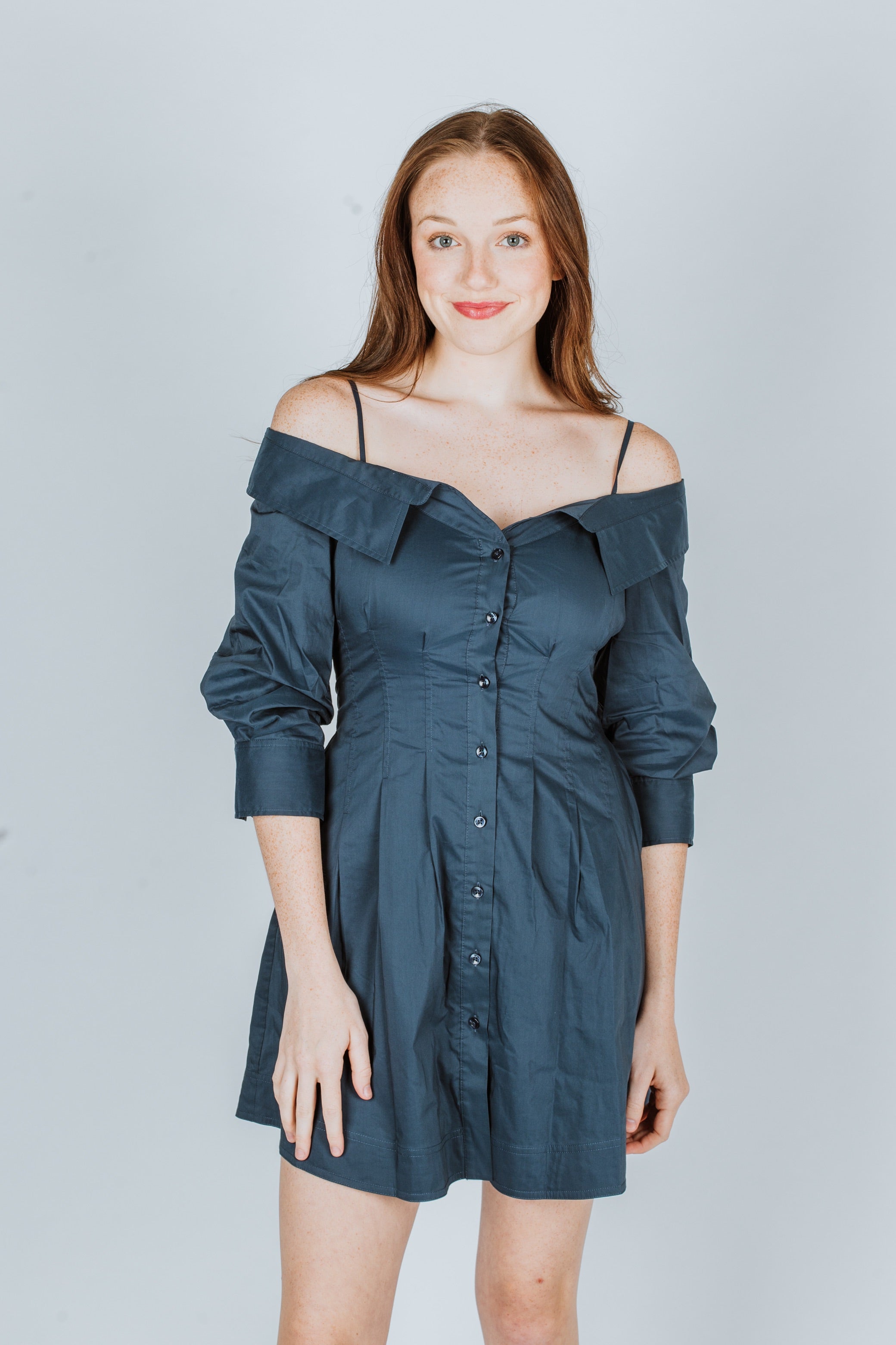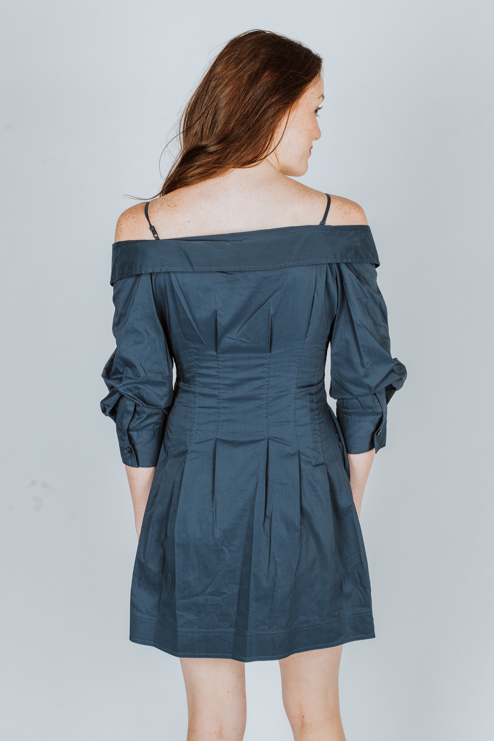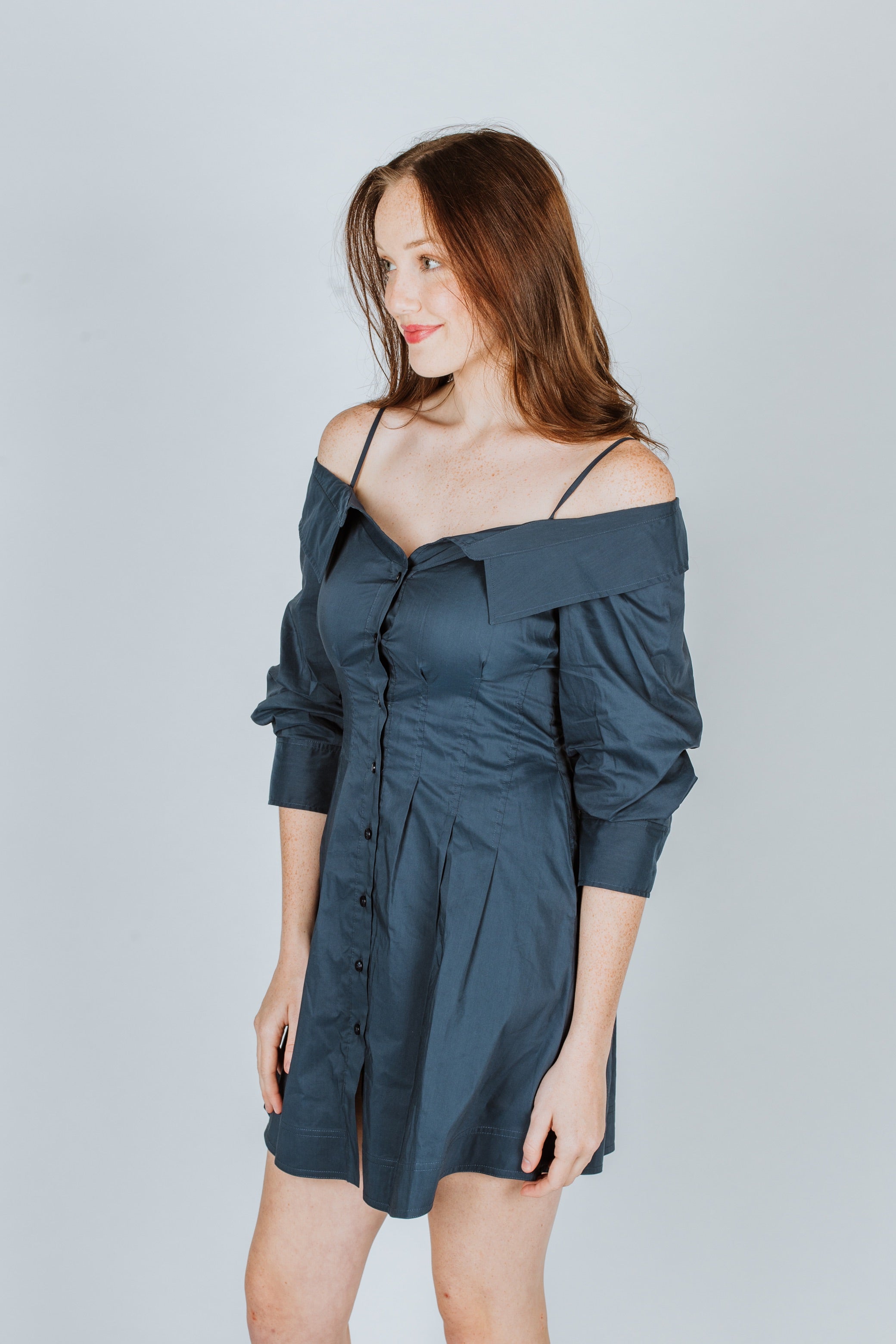 Bare shoulders define this comfy poplin shirtdress featuring an all-cotton lining and three-quarter sleeves with buttoned cuffs.