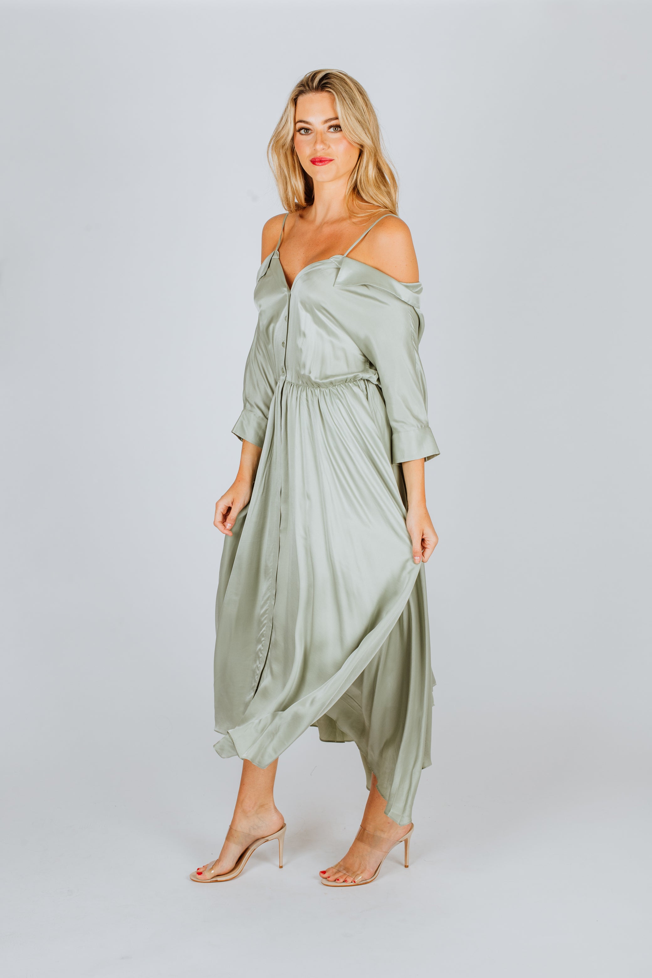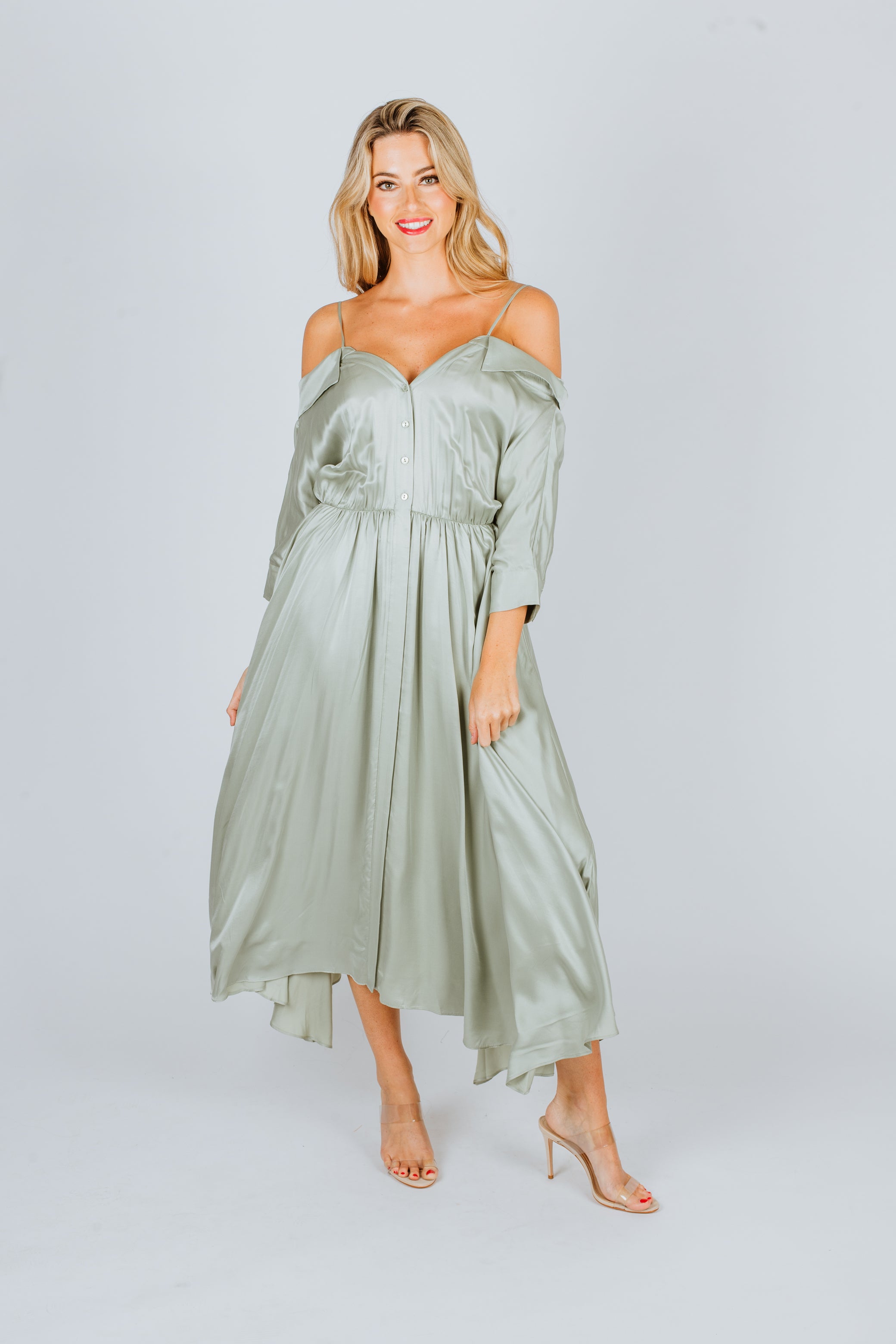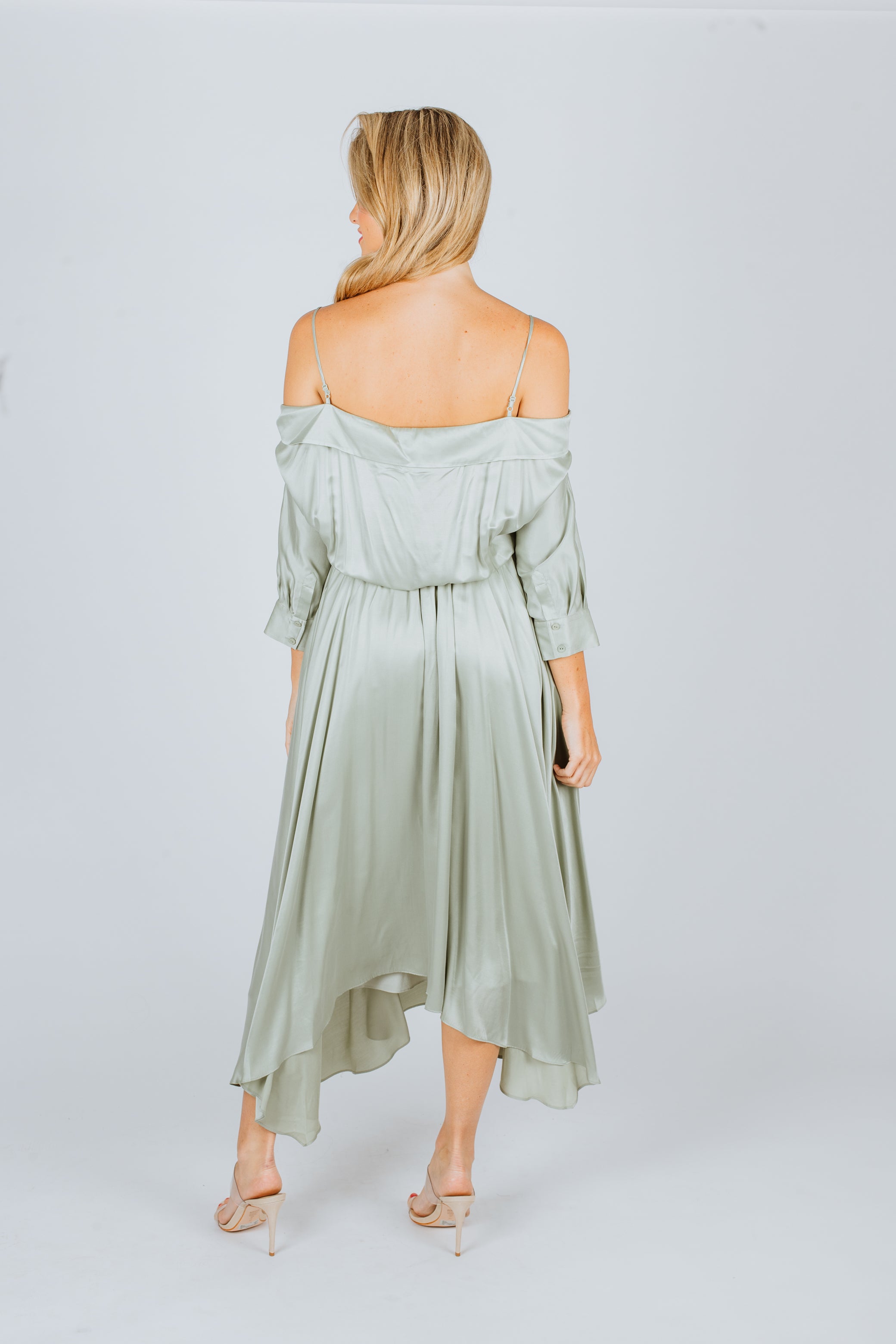 Cold shoulder half sleeves and a shirting inspired bodice crown a relax midi length skirt with high low hem.Â