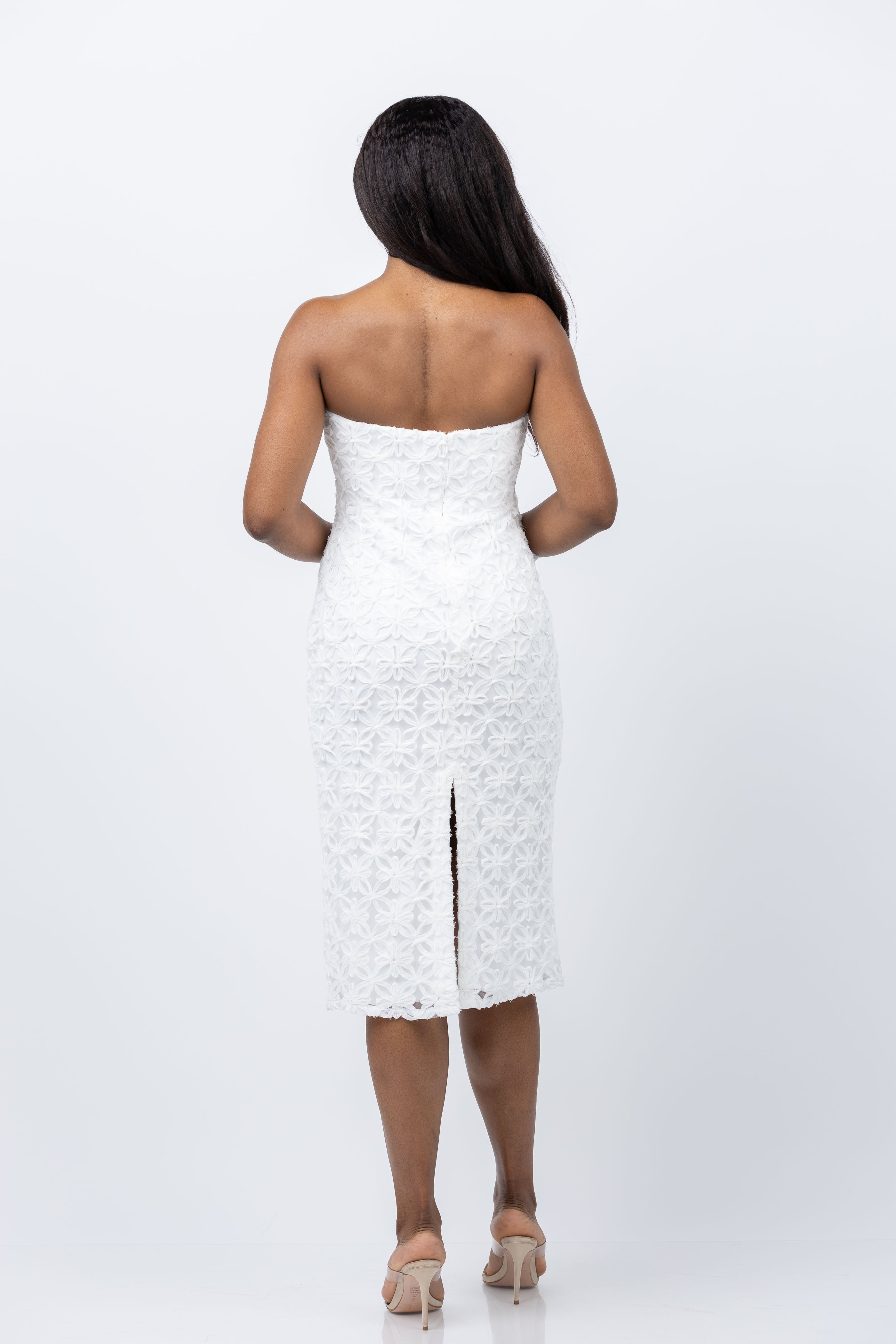 Jovani Strapless Bow-Front Applique Midi Dress in White
