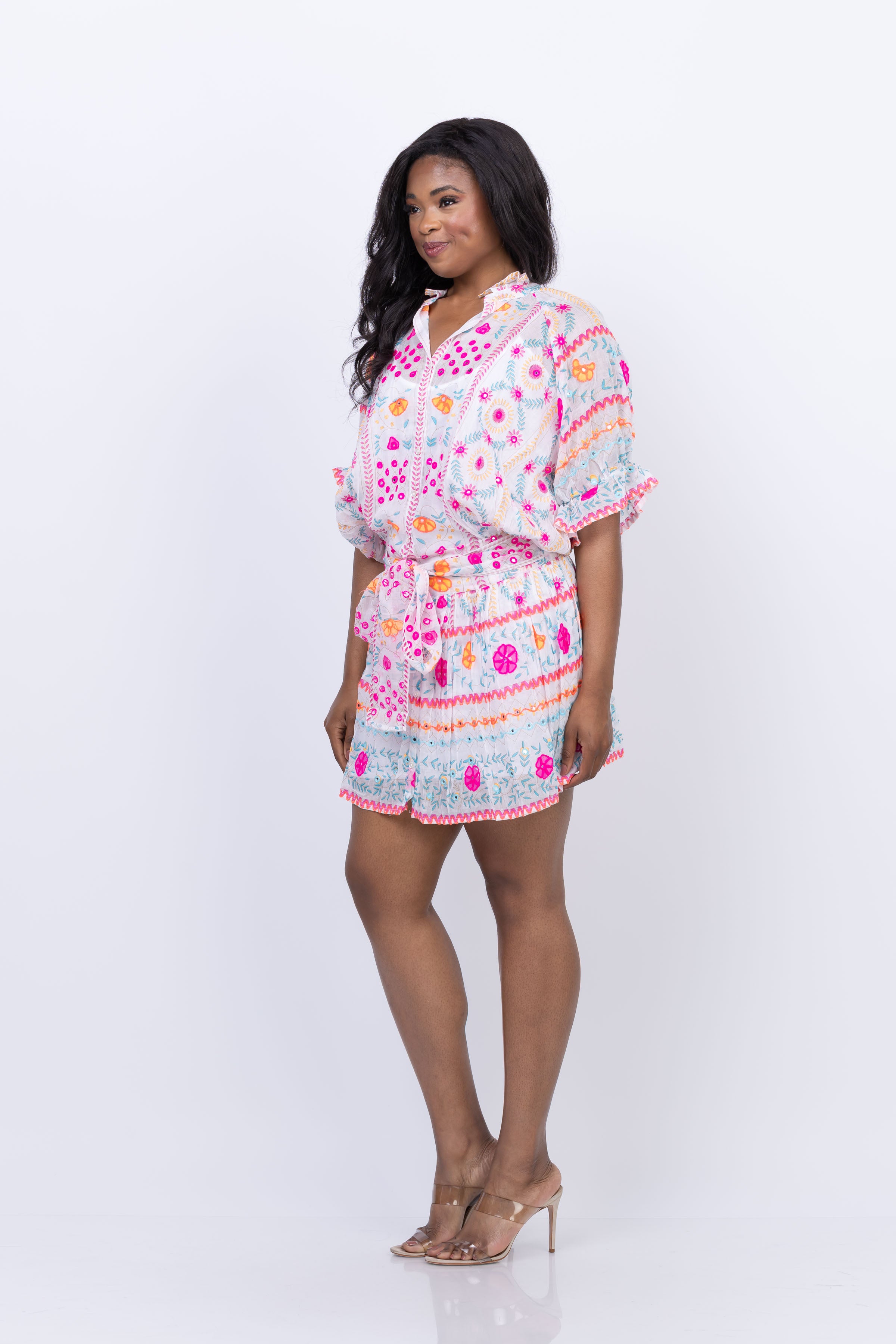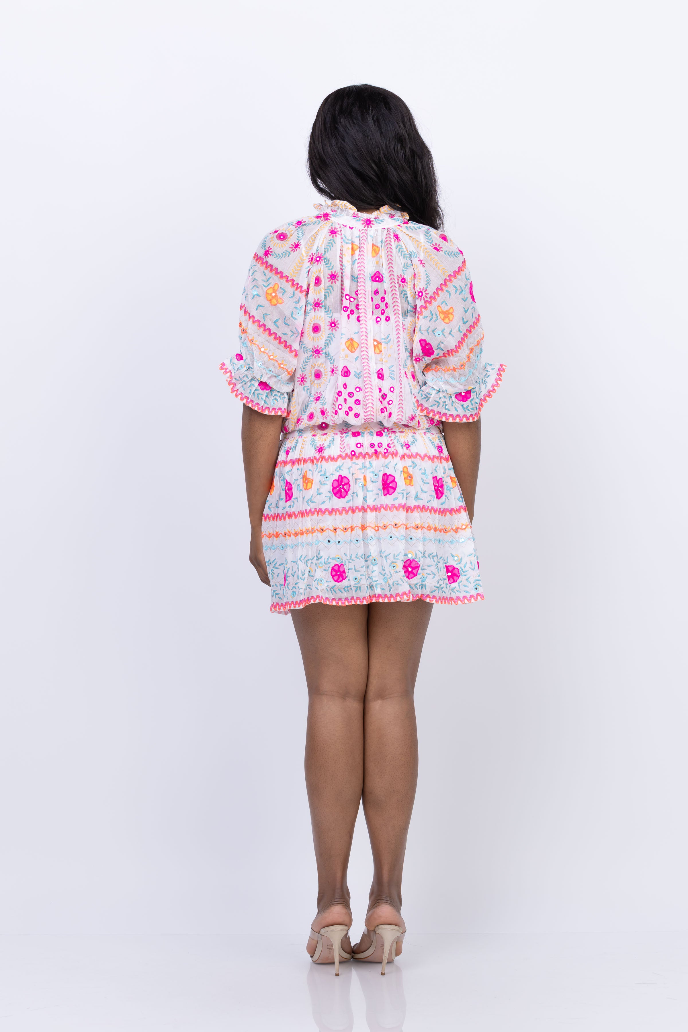 Indulge in the exquisite Juliet Dunn Blouson Dress, featuring a stunning Mexican-inspired print adorned with intricate mirror and embroidery details. With romantic frill sleeves, a charming Victoriana collar, and a versatile waistband, this dress is perfect for adding a touch of sparkle to your summer occasions.