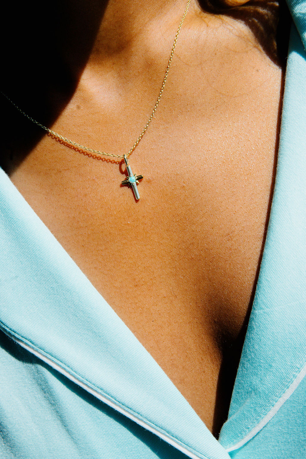 This elegant Kamaria Opal Cross Charm Necklace in Gold is the perfect addition to your jewelry collection. Its mini cross charm adds a pop of vibrant opal color, making it a great statement piece to layer with other opal necklaces. Its size is versatile and pairs perfectly with our opal butterfly necklace. Upgrade your style with this stunning necklace today!