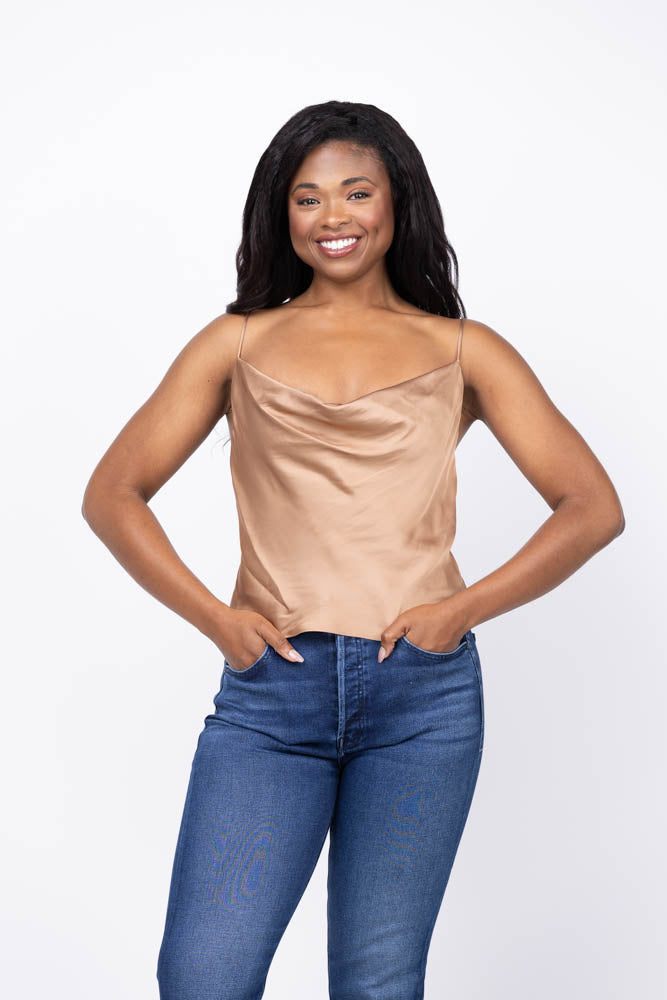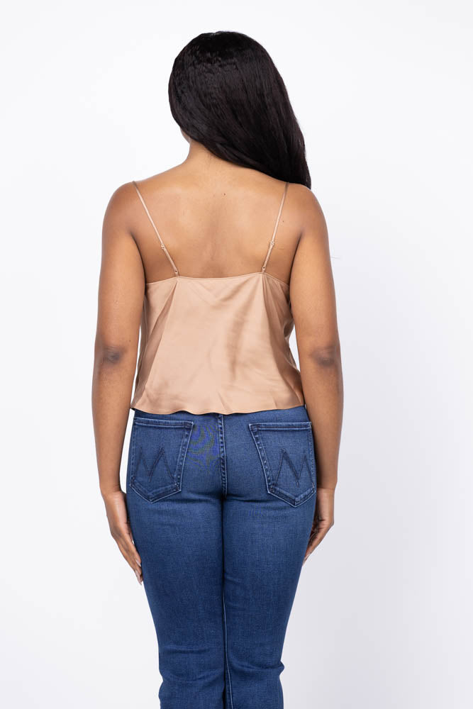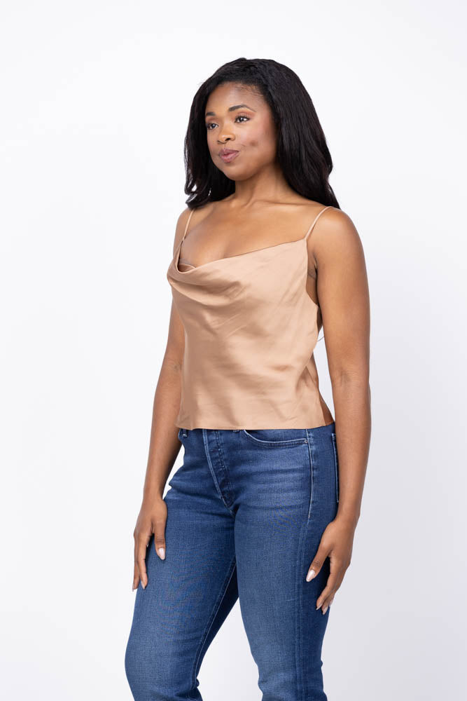 The L'Agence Calista Cowl Neck Cami in Ginger Snap features a weighted satin fabric that ensures elegant, secure draping with every wear. Its adjustable straps offer a perfect fit, while the cropped length adds a modern, flattering touch. This light brown cami effortlessly combines sophistication and comfort, making it a versatile piece for both day and night looks. Elevate your wardrobe with this chic and timeless staple.