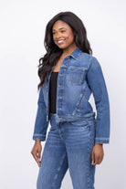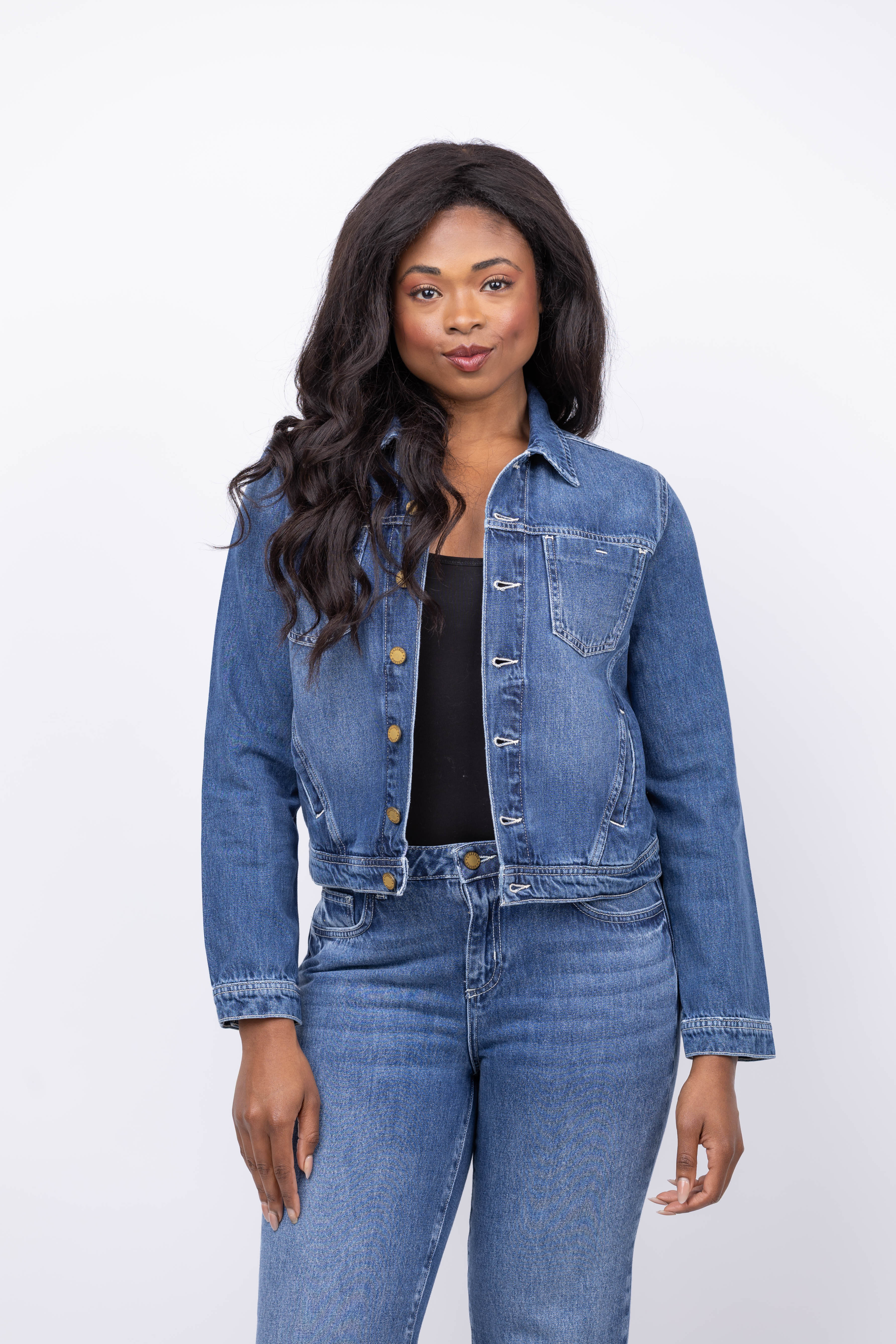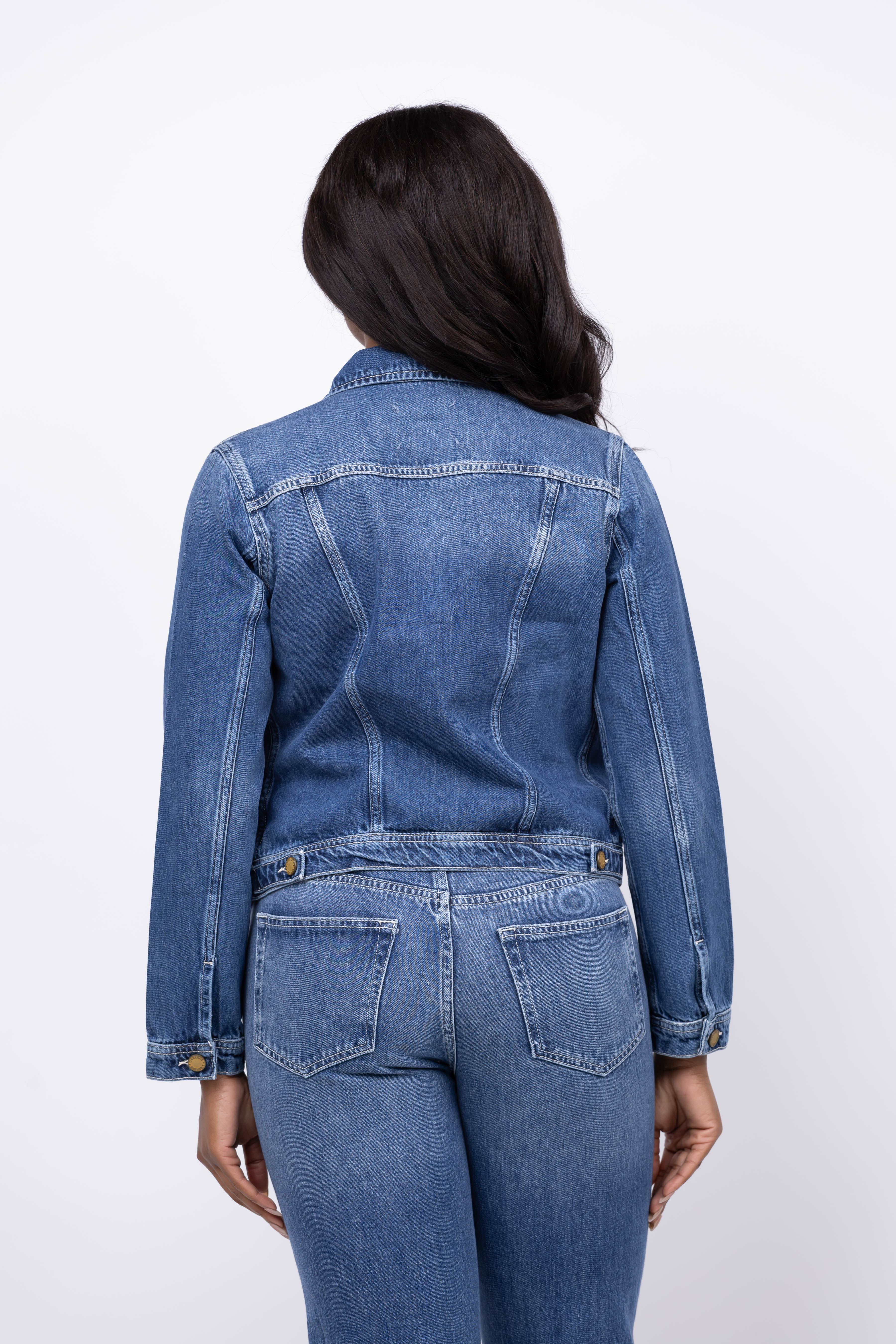 The L'Agence Celine Slim Femme Jacket in Kemp offers timeless style with a comfortable, all-cotton denim fabric. Its slim fit and tailored cut create a polished, feminine silhouette perfect for any season. Featuring practical patch and welt pockets alongside signature logo button closures, this classic blue jacket is an essential addition to elevate your wardrobe effortlessly.