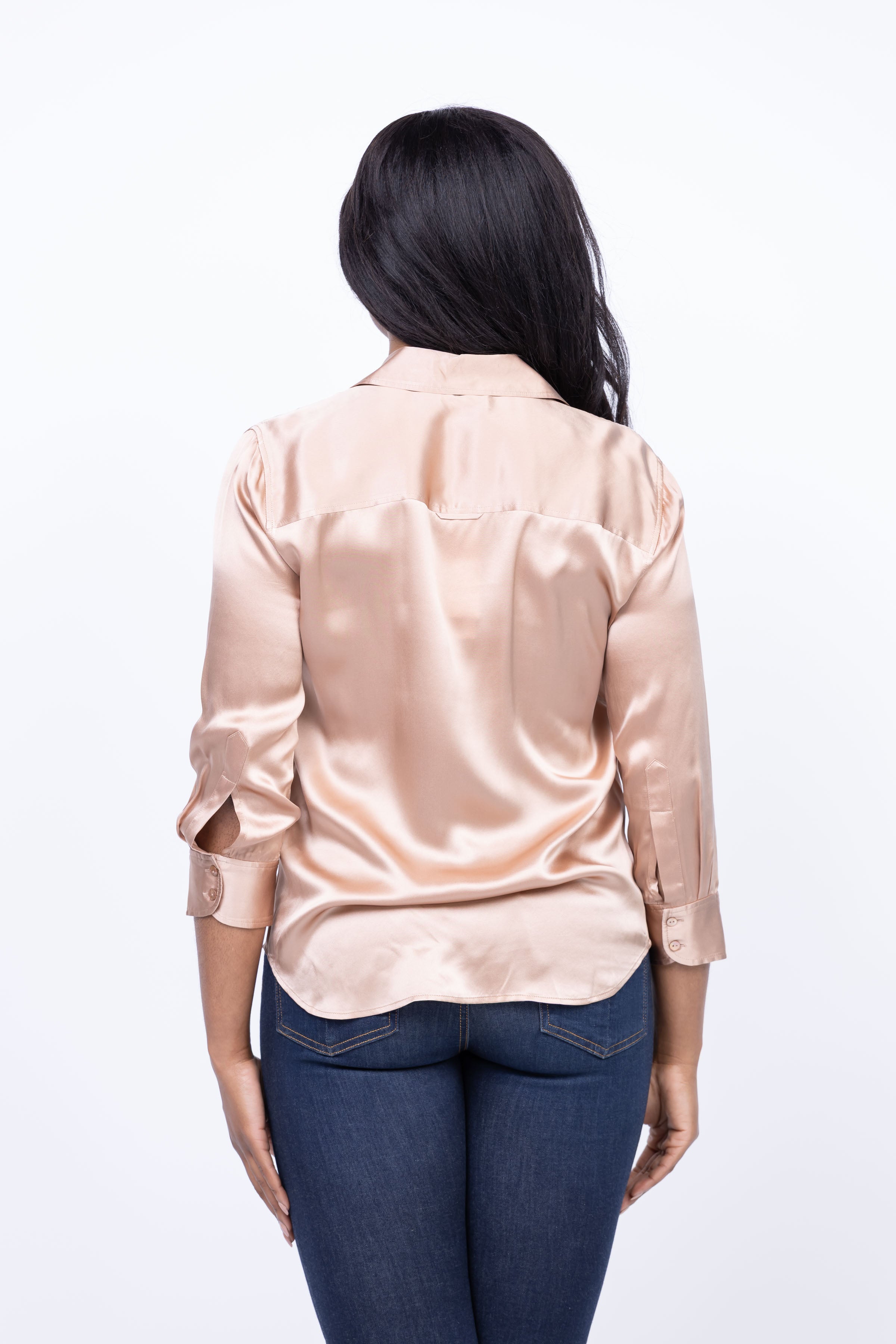 Elevate your wardrobe with the must-have L'Agence Dani 3/4 Sleeve Blouse in Pecan. Made of luxurious 100% silk charmeuse, this iconic button-down features a slim fit, button front closure, and a high-low shirttail hem. Perfect for any occasion, its three-quarter sleeves add a touch of sophistication to any outfit.