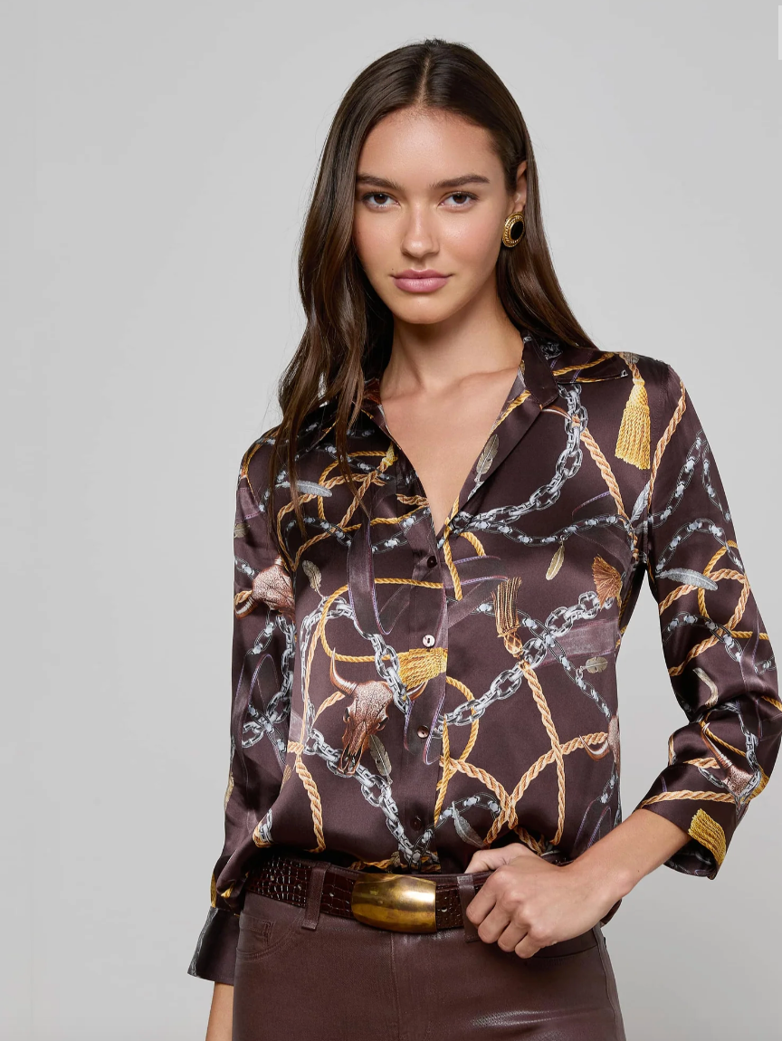 Elevate your wardrobe with the L'Agence Dani 3/4 Sleeve Blouse in Coffee Bean Multi Mix Western Chain. Crafted from luxurious silk, this iconic button-down combines timeless elegance with a bold Western-inspired chain print. Its flattering three-quarter sleeves offer both style and comfort, making it perfect for day-to-night wear. Add a sophisticated, standout piece to your collection that effortlessly blends classic design with a unique twist.