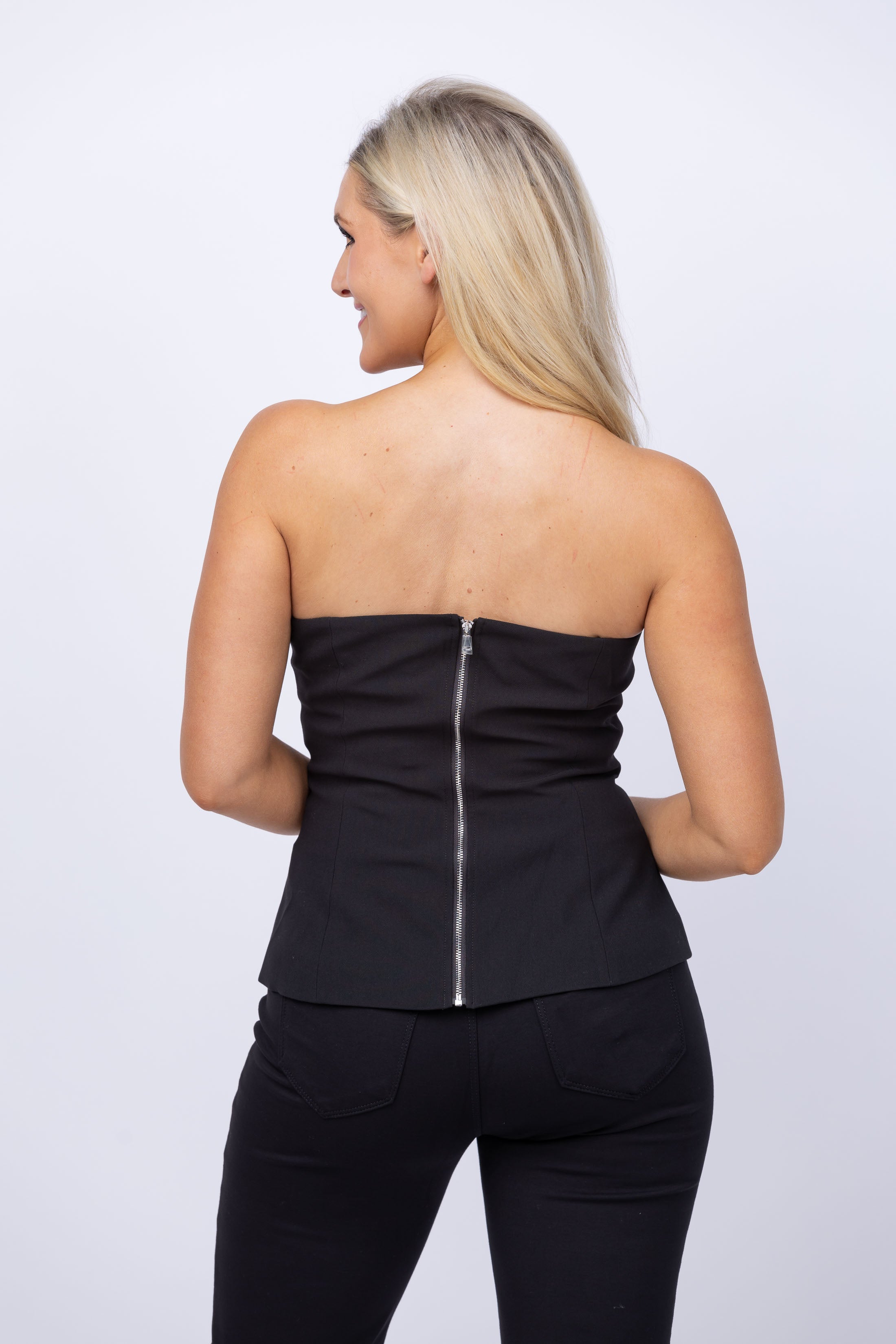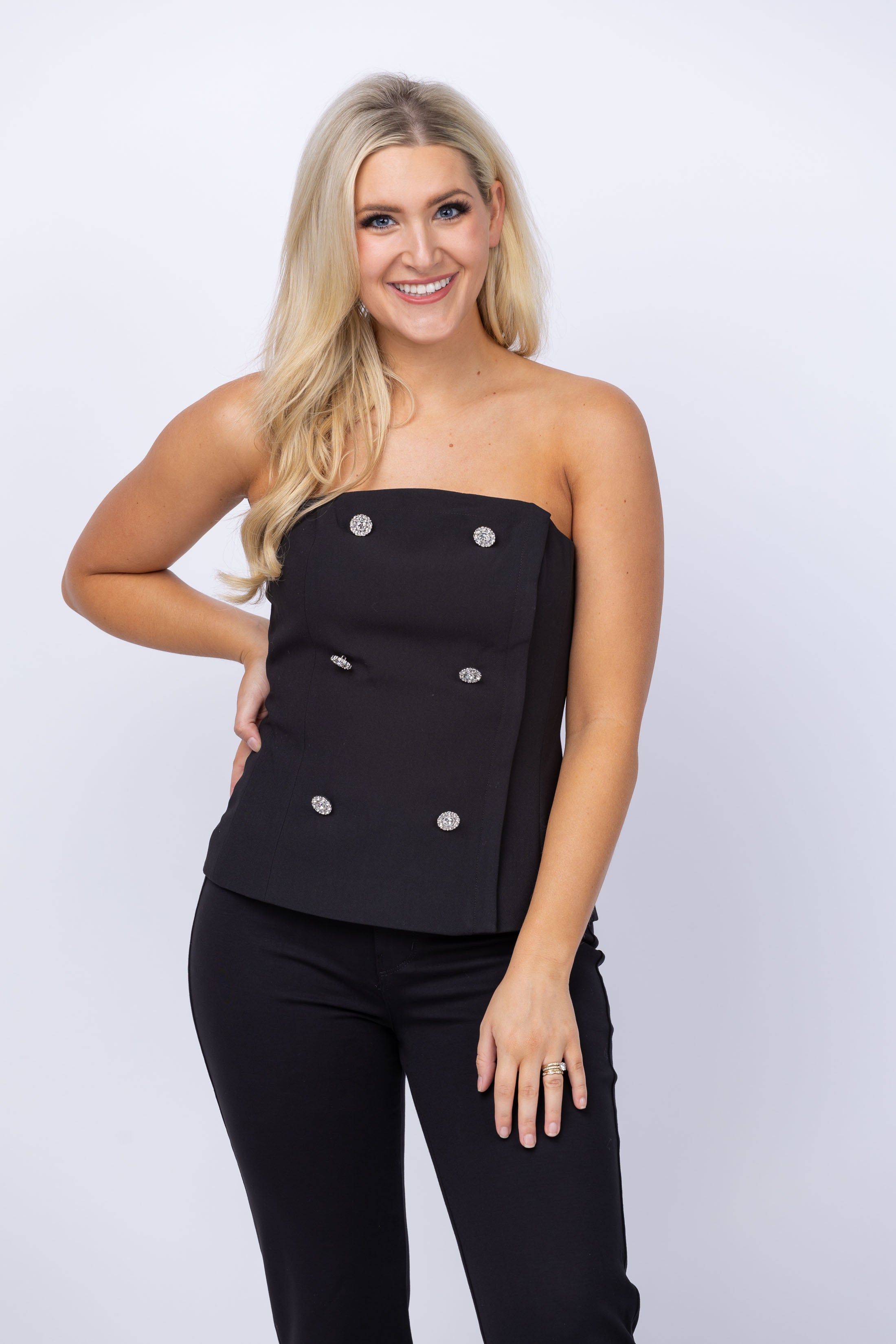 This luscious L'AGENCE strapless bustier in black keeps you looking positively glamorous while providing unparalleled support. Crafted from ultra-stretch suiting fabric to flatter the figure, this stunning piece features a faux lapped front adorned with sparkly crystal buttons and an exposed back zip closure. Appear dazzling and confident in this must-have item!