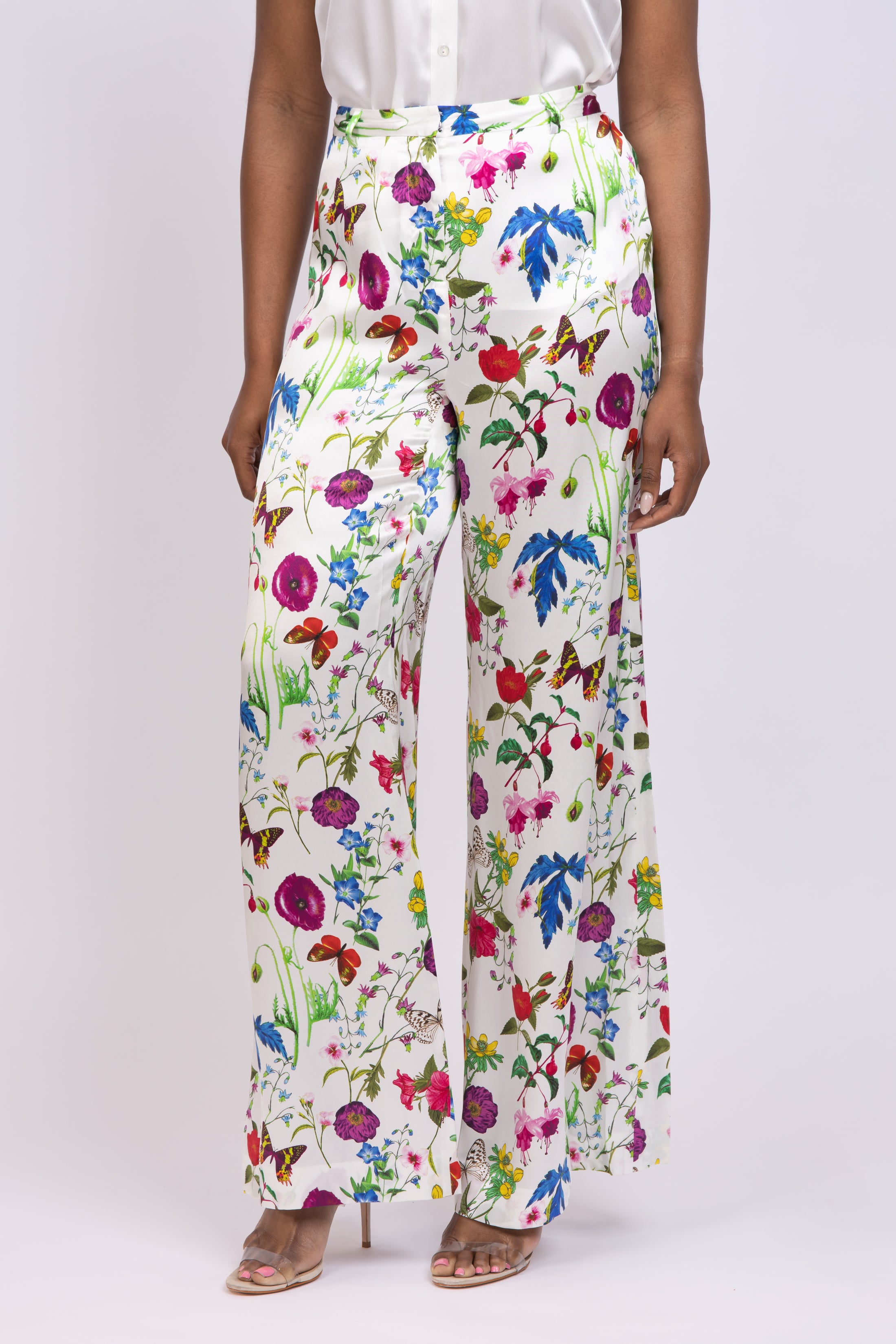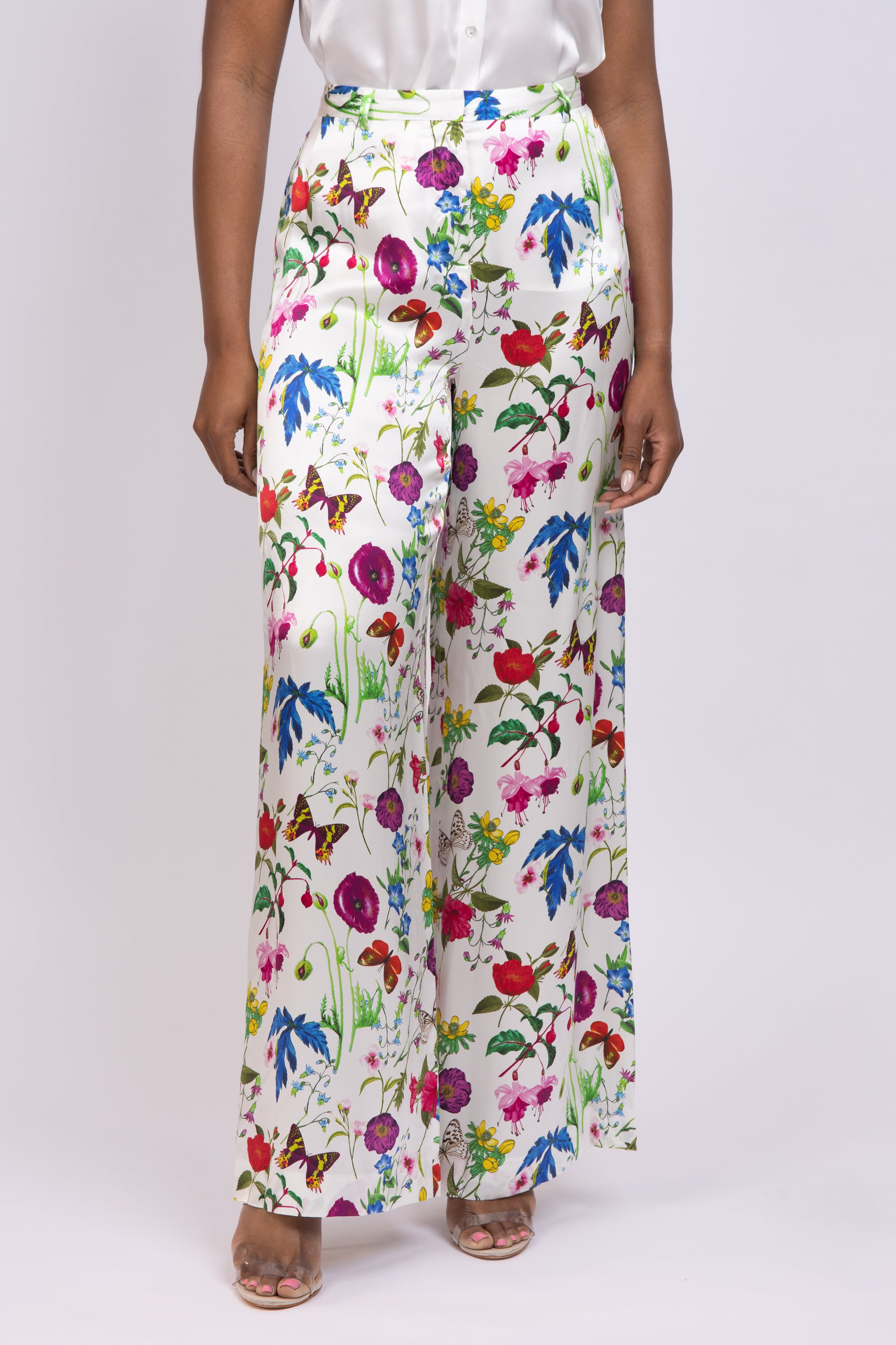 Put some floral flair in your wardrobe with the L'agence Gavin Wide Leg Pant! These comfortable and stylish pants have an ultra-wide-leg fit, and feature a colorful botanical print set against an ivory background. All made with premium silk for sublime drape and flow. Belt loops and side pockets included, plus a discreet zip fly with hidden hook and bar closure.