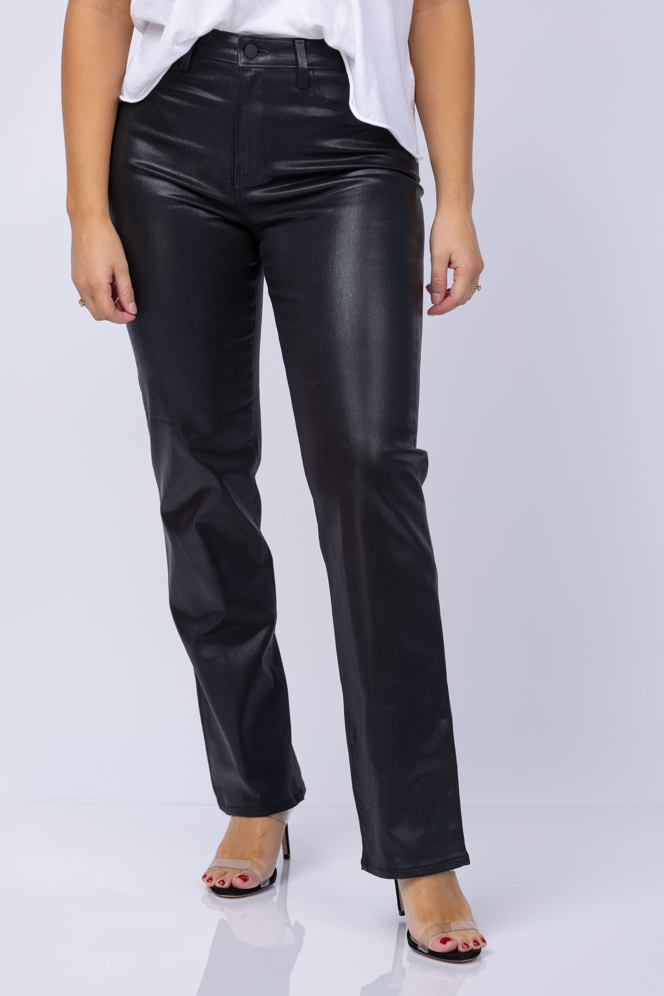 These luxurious, coated black jeans flatter any figure with their contoured waistband and straight leg design. Find an edgy 80s vibe with back seaming and an exposed zip detail. Experience premium stretch denim and a classic five-pocket construction in this must-have design. Make a statement with L'AGENCE Ginny High Rise Back Zip Pants!