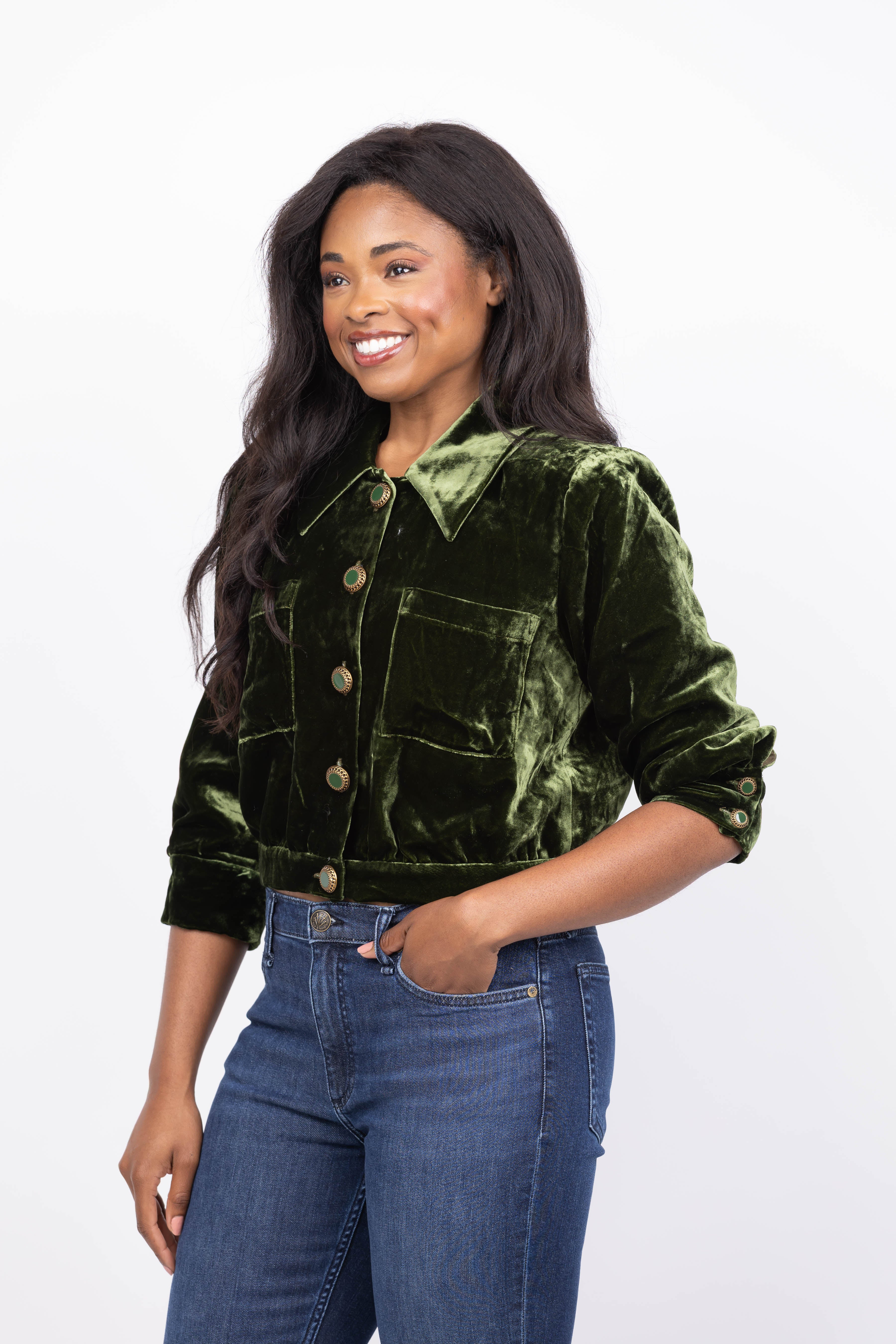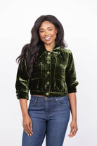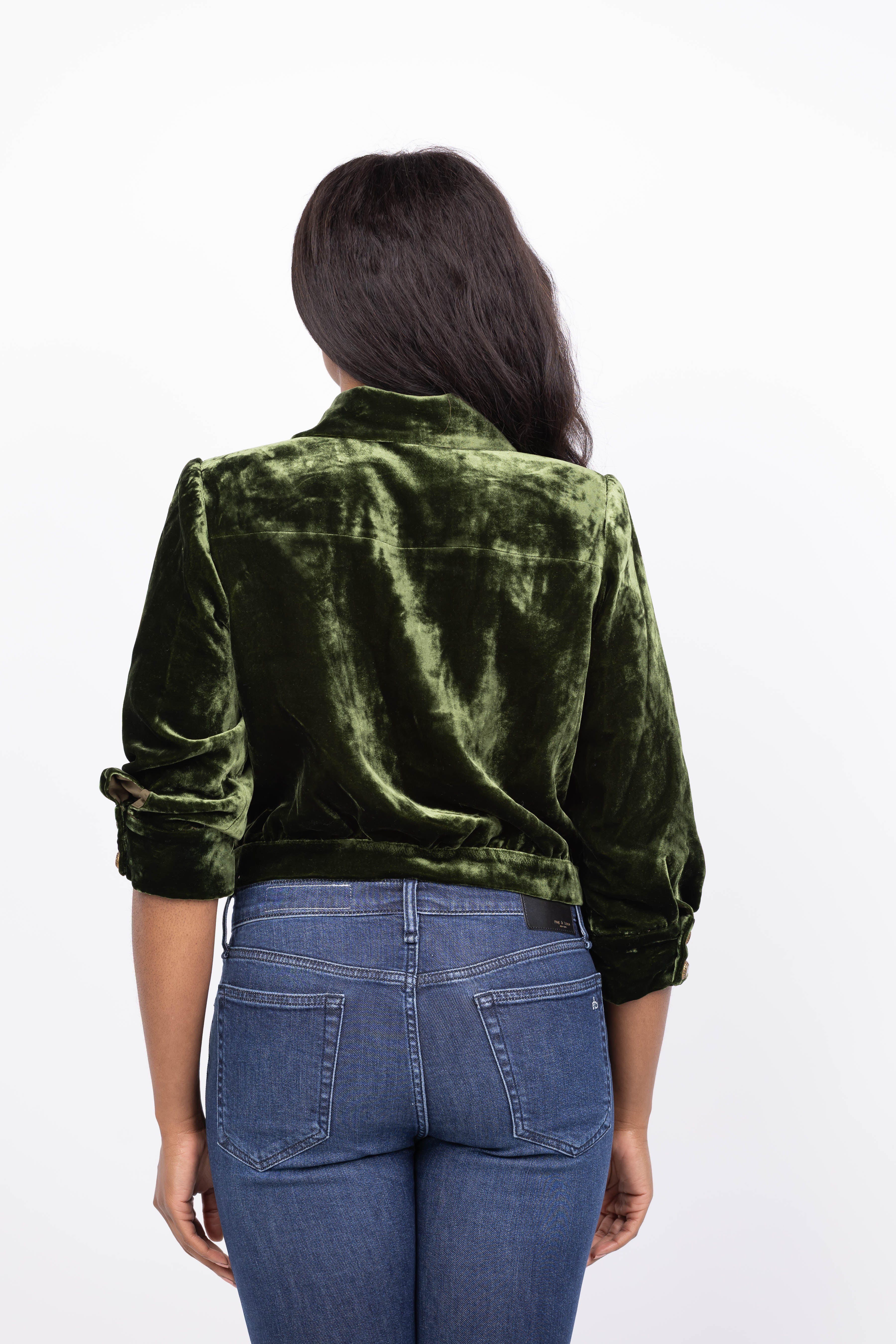 Elevate your wardrobe with the L'Agence Jia Crop Jacket in deep olive. Crafted from silk-infused velvet, this cropped jacket offers a luxurious feel with three-quarter sleeves and structured shoulder pads for a polished silhouette. Fully lined and featuring convenient side pockets and button closures, it’s perfect to wear alone or layered for versatile, sophisticated style.