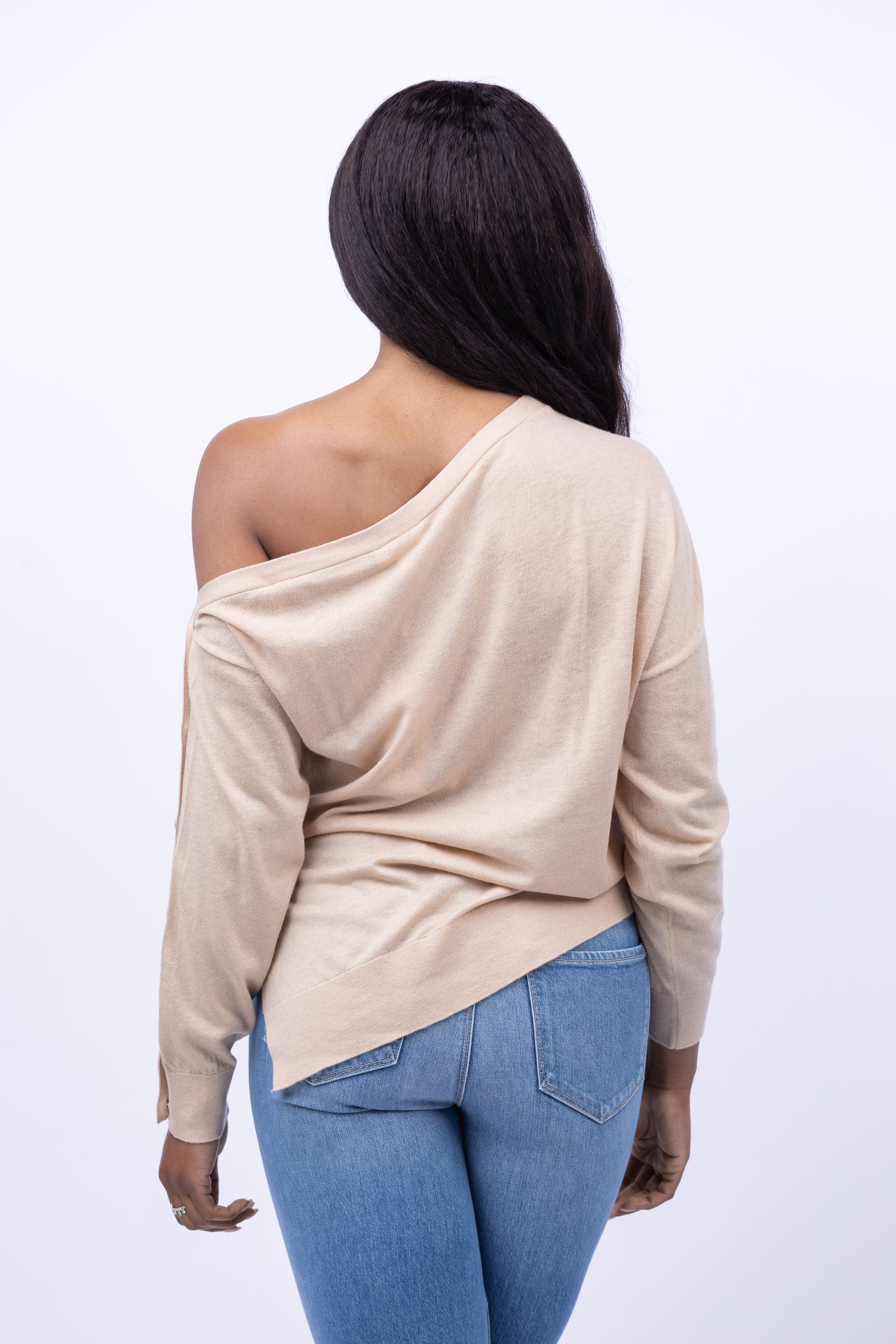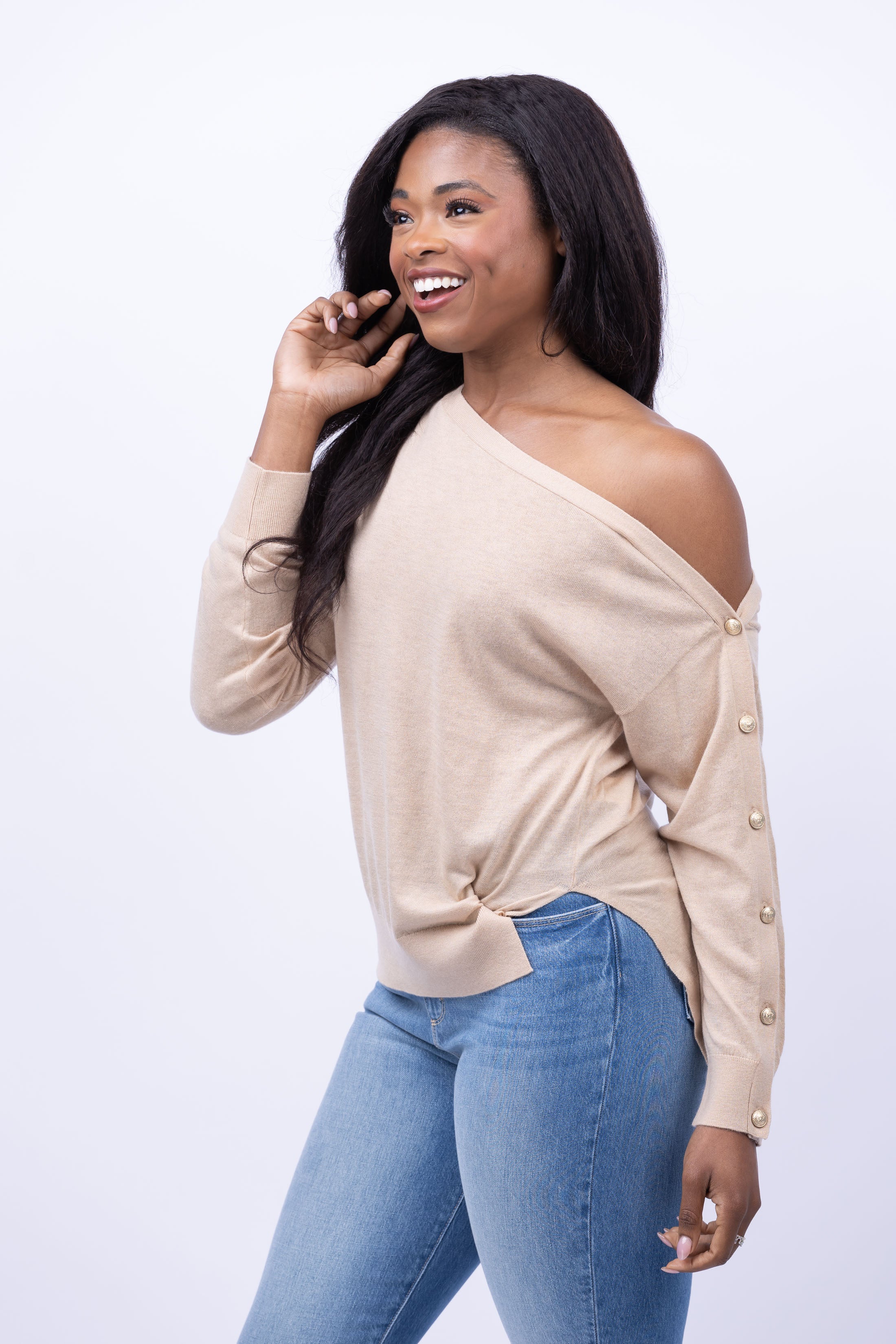 Elevate your wardrobe with the L'AGENCE Ledger Off The Shoulder Sweater in Almond. This sophisticated and sleek sweater features an off the shoulder neckline and long sleeves, with gold dome buttons adorning one sleeve. The lightweight sweater also boasts a side slit, adding an elegant touch to any outfit.