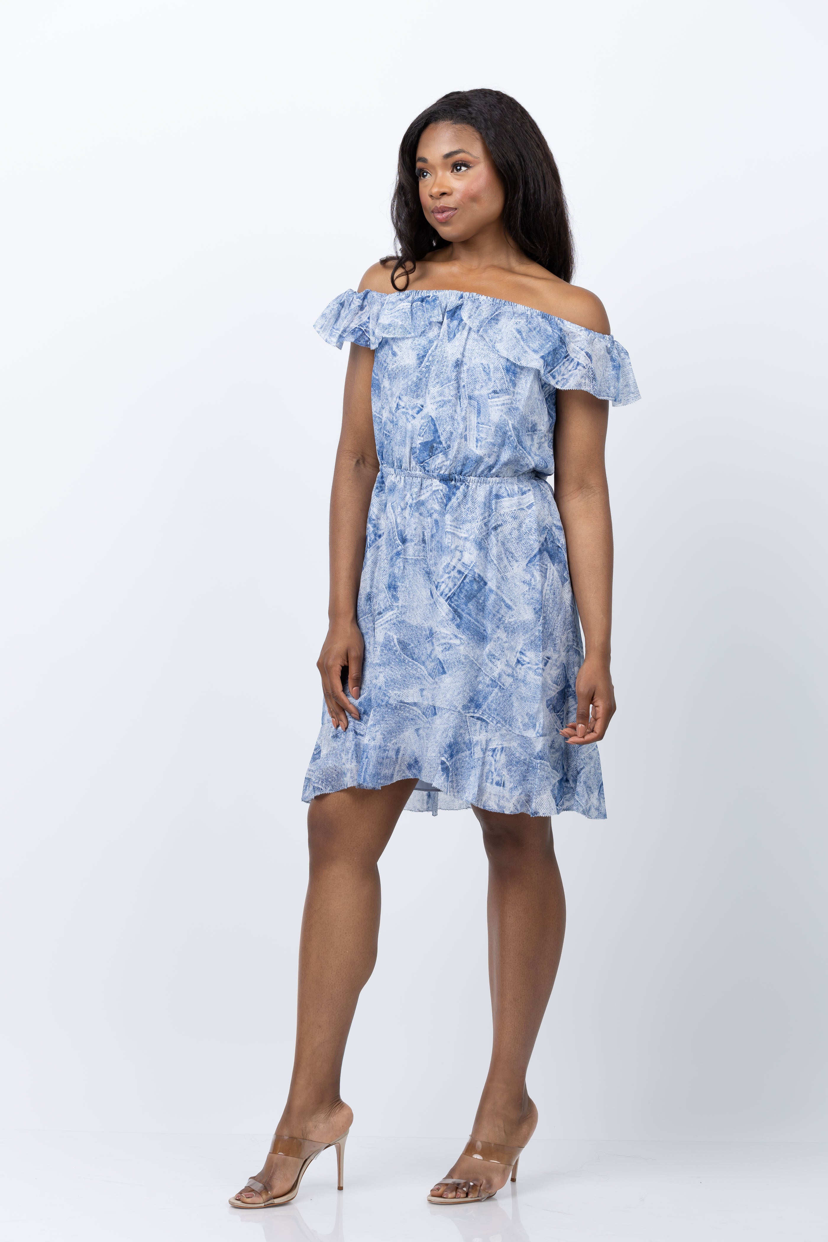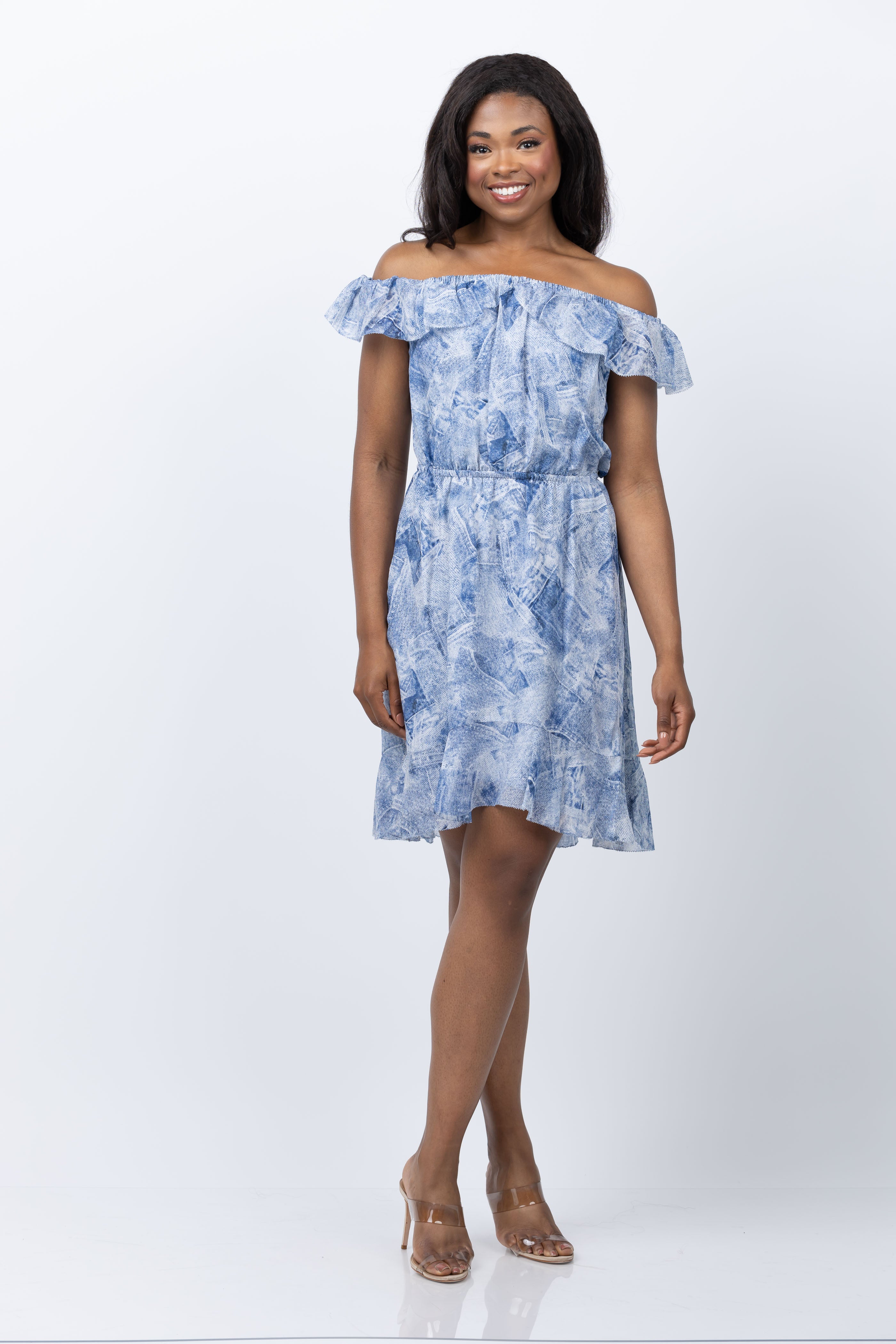 Experience the perfect blend of edge and elegance with our L'AGENCE Leonie Off Shoulder Dress. The unique denim print adds a cool touch to the pure silk fabric, while the off-shoulder style and flounce sleeves and hem provide a flattering and balanced look. The elasticized waist creates a chic blouson effect, making this dress an effortless all-day and all-night option. Complete your look with a coordinating denim heel for a stylish brunch outfit.