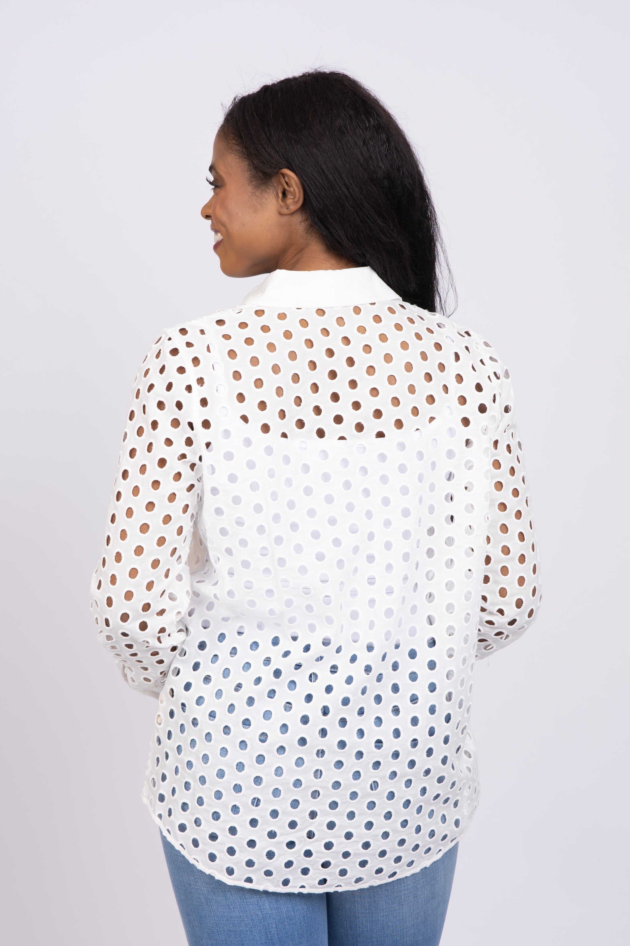 Make an effortless fashion statement with the L'agence Lindy Eyelet Blouse! This beautiful, white cotton eyelet blouse features a relaxed fit and updated details like a sharp trim collar, long button-cuff sleeves, and a shirttail hem. Oversized eyelet adds modernity to this timeless piece - perfect for any chic occasion! Pro tip: size down for a slimmer fit.