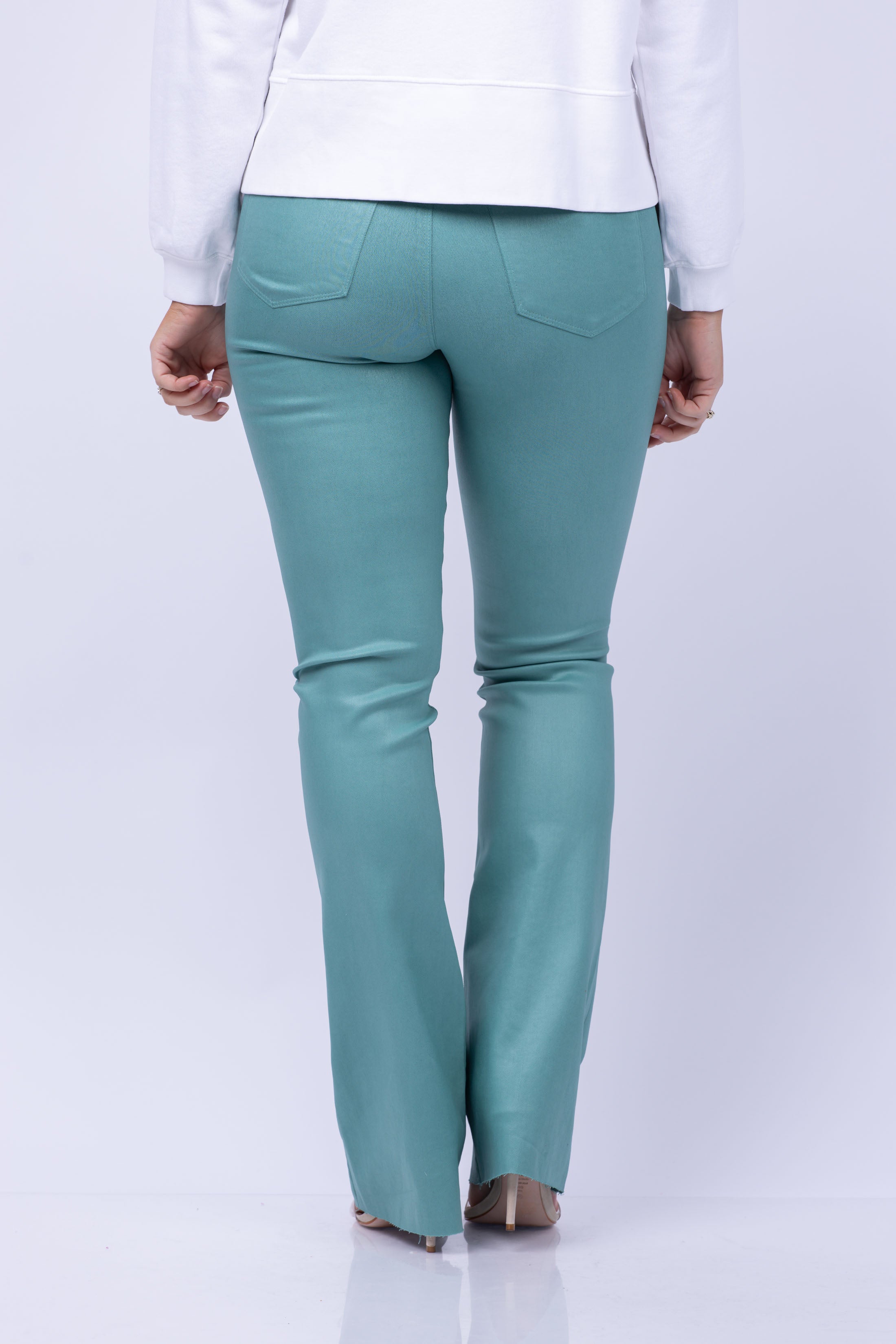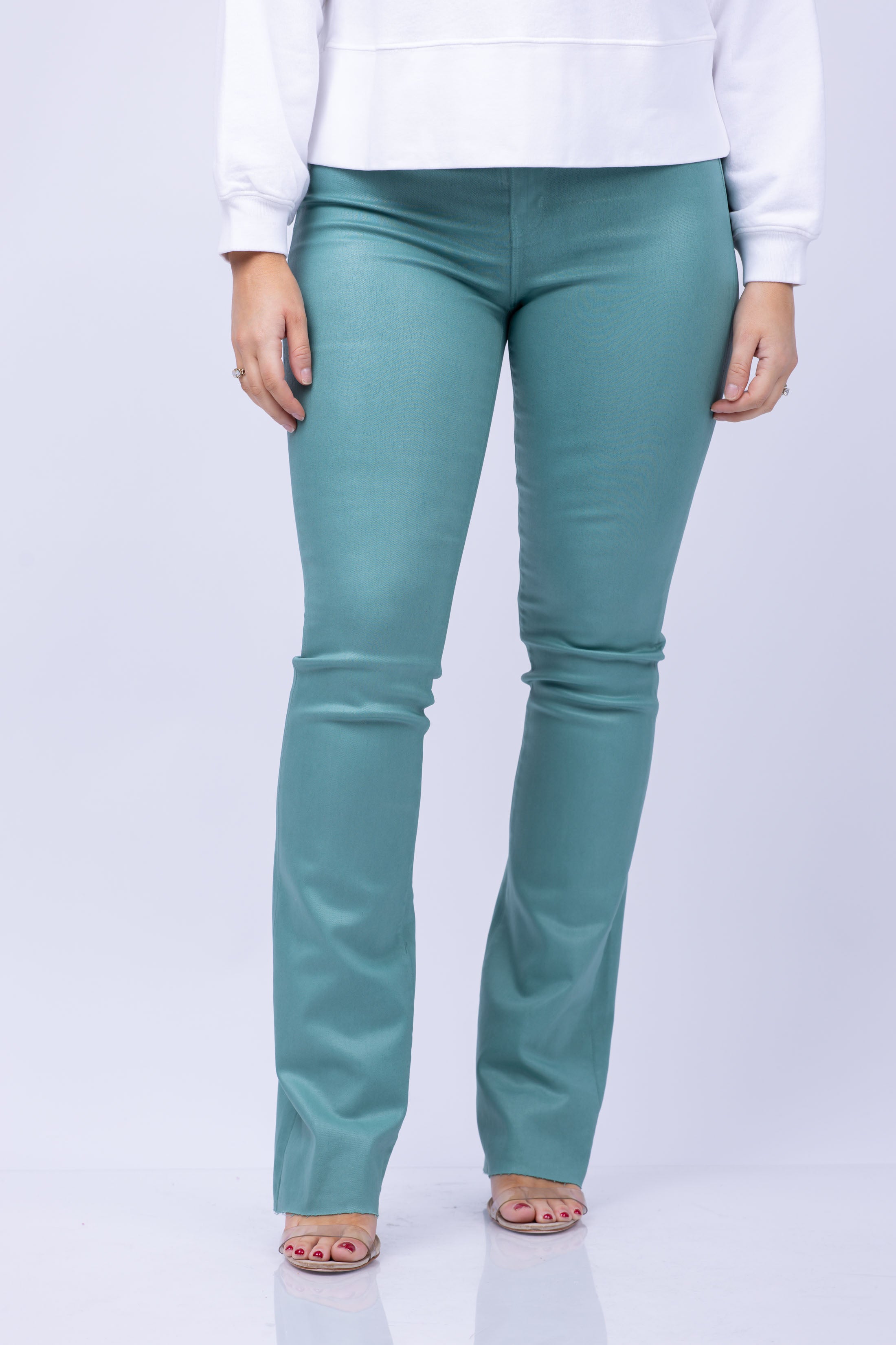 Elevate your denim game with the L'AGENCE Ruth High Rise Straight Raw in Green Jasper Coated. These classic straight-leg jeans feature a high rise for a timeless silhouette and a slim, straight leg finished with a clean raw hem. Perfect for any occasion, dress them down with sneakers and a cropped tee or dress them up with a sleek sandal and silk blouse.