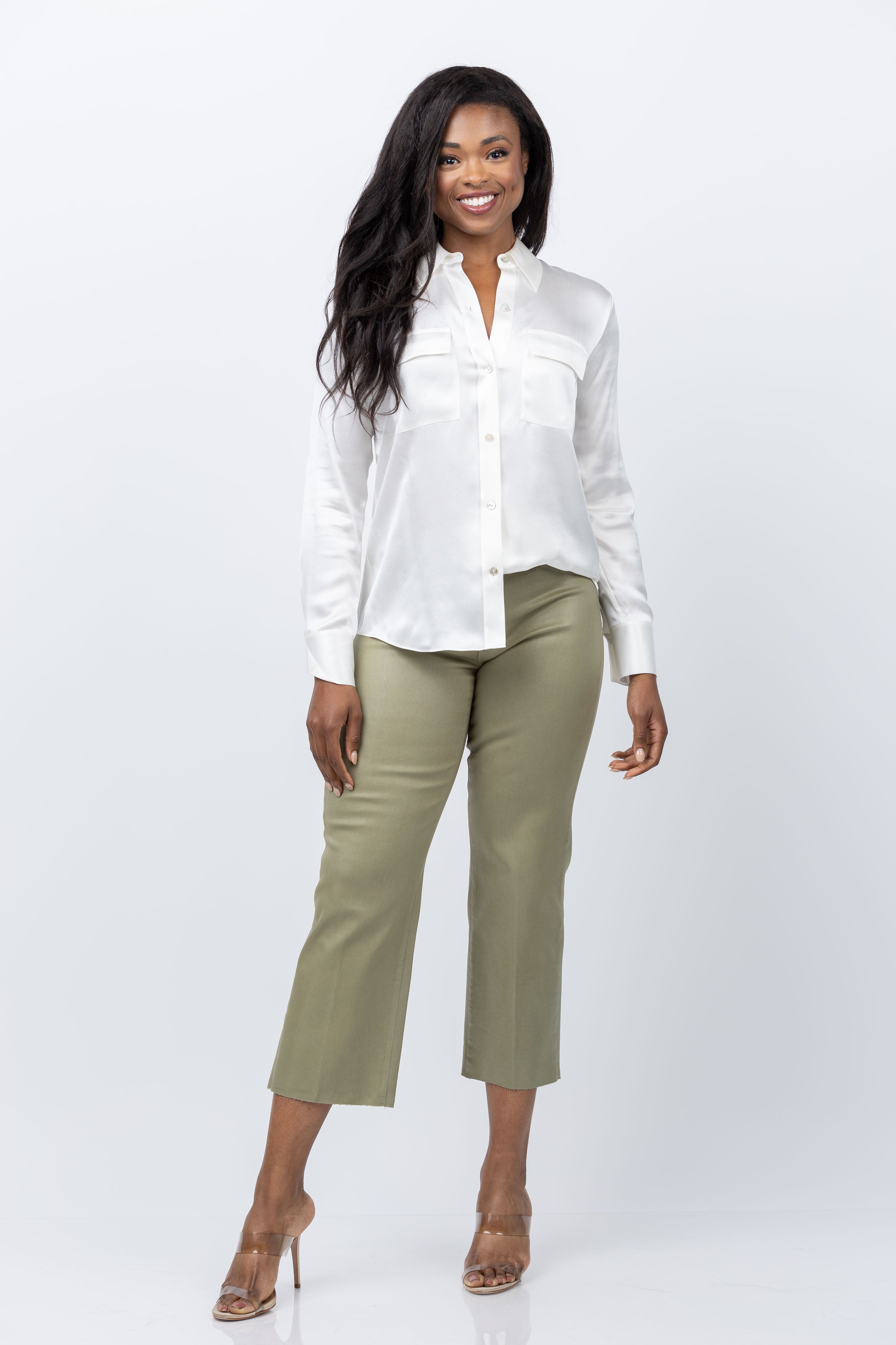 Introducing the L'AGENCE Wanda High Rise Crop Wide-Leg Jean, now available in a chic oil green coated finish. With a contoured waistband, secure fit, and 26" inseam designed for petites, these jeans provide effortless style and comfort. Pair with a tank for day or a blouse and heels for a night out.