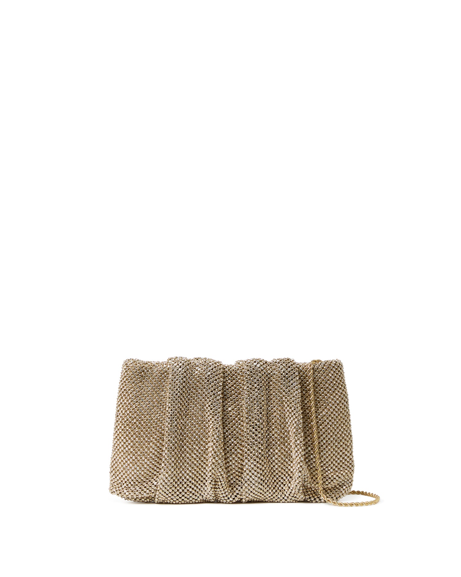 Discover understated glamour with this shadow gold diamanté gathered clutch. The soft, muted sparkle of the rhinestone embellishments creates an sophisticated alternative to traditional metallics, perfect for those who prefer refined elegance. The removable twisted gold chain strap adapts to your needs—detach it for a polished clutch or attach it for hands-free carrying. A secure frame closure safeguards your essentials, while the fully lined interior and interior metal logo plaque showcase meticulous attention to detail. Versatile enough for formal events yet distinctive enough to become your signature accessory.