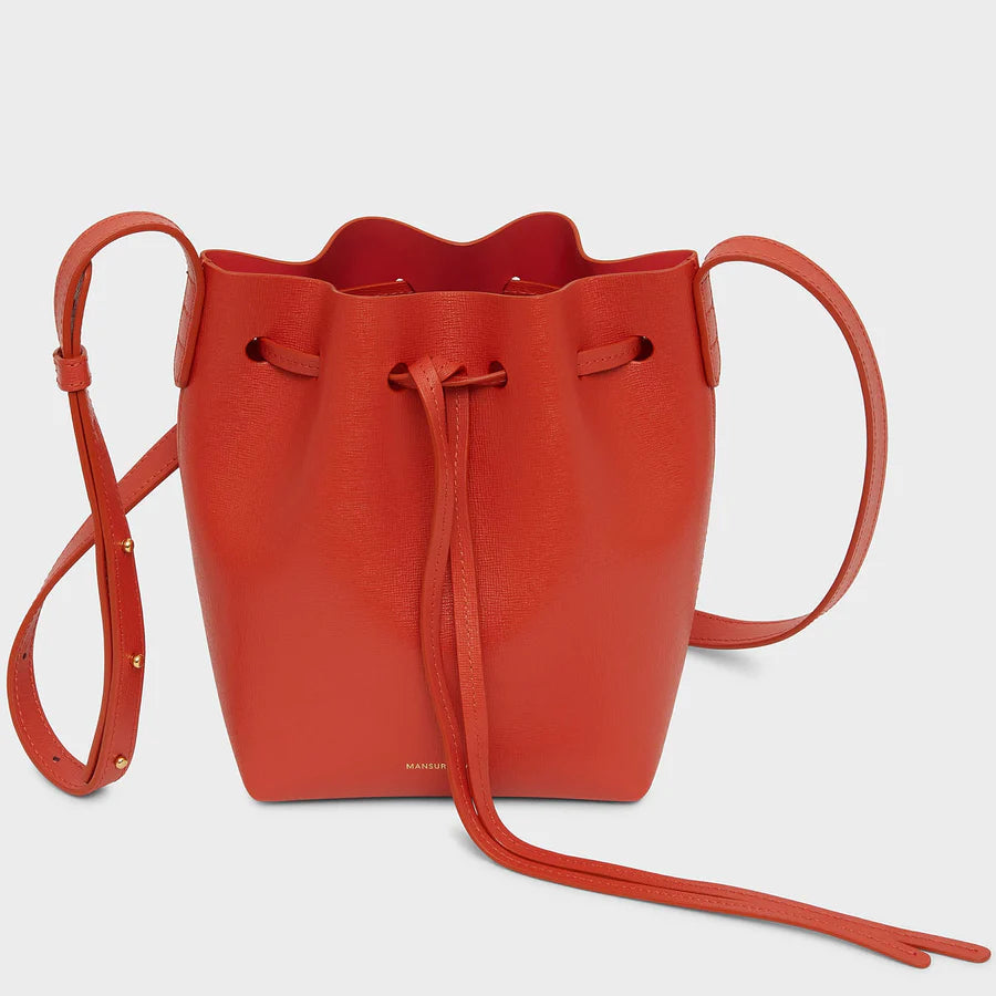 The smallest version of the Bucket Bag keeps its iconic look and feel, even when traveling light. It's made from coated, textured Italian Saffiano leather and features an adjustable crossbody strap and simple cinch closure.