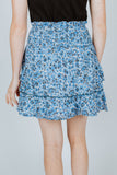 Printed Mini Skirt designed in a delicate cotton and viscose voile that displays a creative pattern depicting a floral with seemingly ikat traces in a tone sur tone composition. Irregular mini skirt with ruffle and pleat details. Smocked waist and contrast piping.