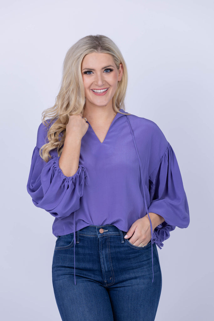 Feel confident and stylish in the Maria Cher Cabrera Cocs Blouse. Vibrant violet creates a striking look that is perfect for fall - and the cinched tie sleeves and V-neck add a classic yet unique touch. Crafted from luxurious silk crepe, this top will become your go-to for an effortlessly chic look!