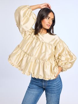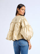 The Mille Mae Top in Almond Taffeta brings bold volume and elegant texture to your wardrobe. Crafted from tiered taffeta, it drapes loosely for a flattering silhouette, while ruffle details at the seams add a touch of playful sophistication. Full sleeves end in fitted elastic cuffs for comfort and style, and the round neckline with a keyhole closure at the back offers a subtle, refined finish. Perfect for making a statement at any event, this top combines dramatic flair with effortless wearability.