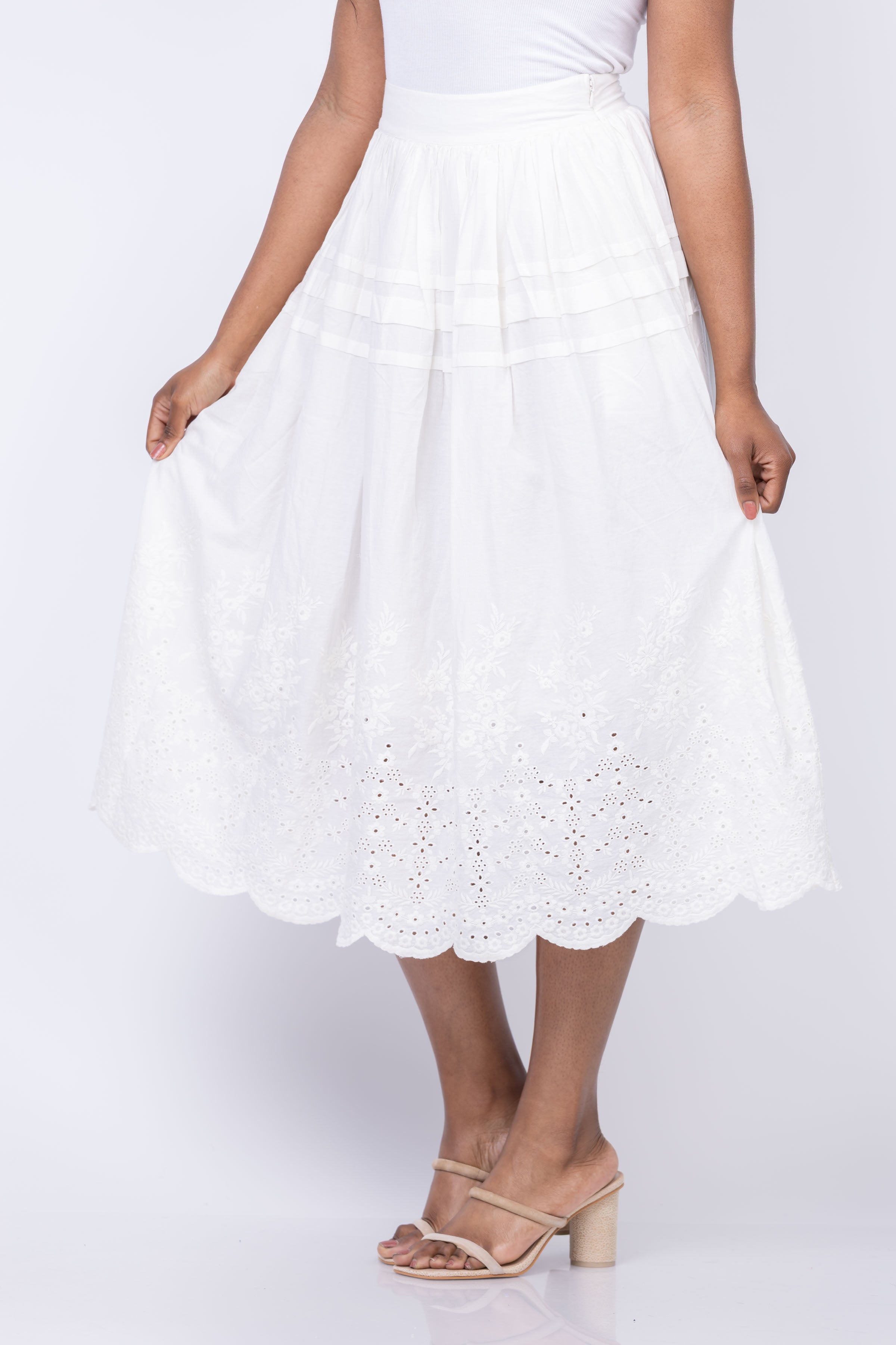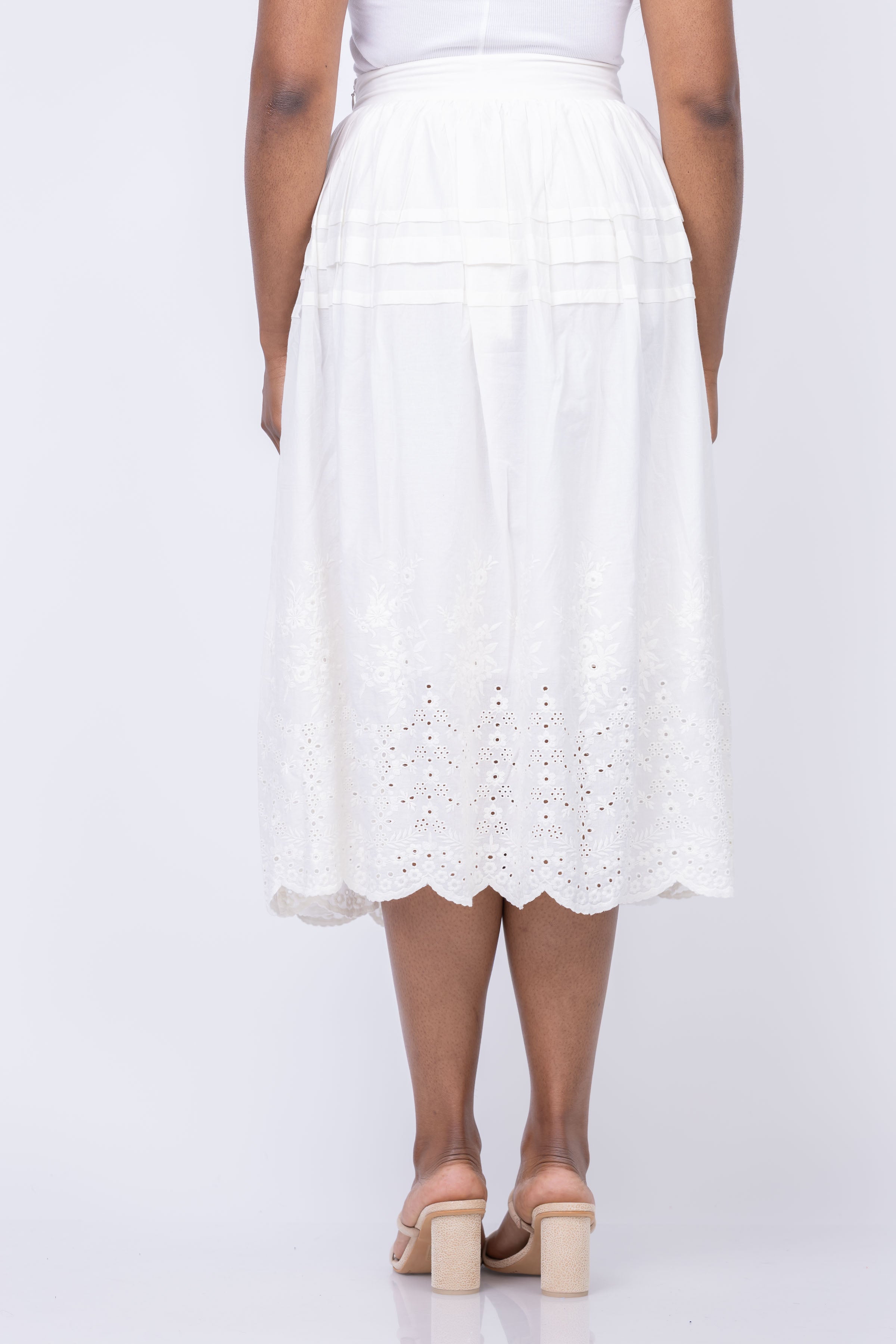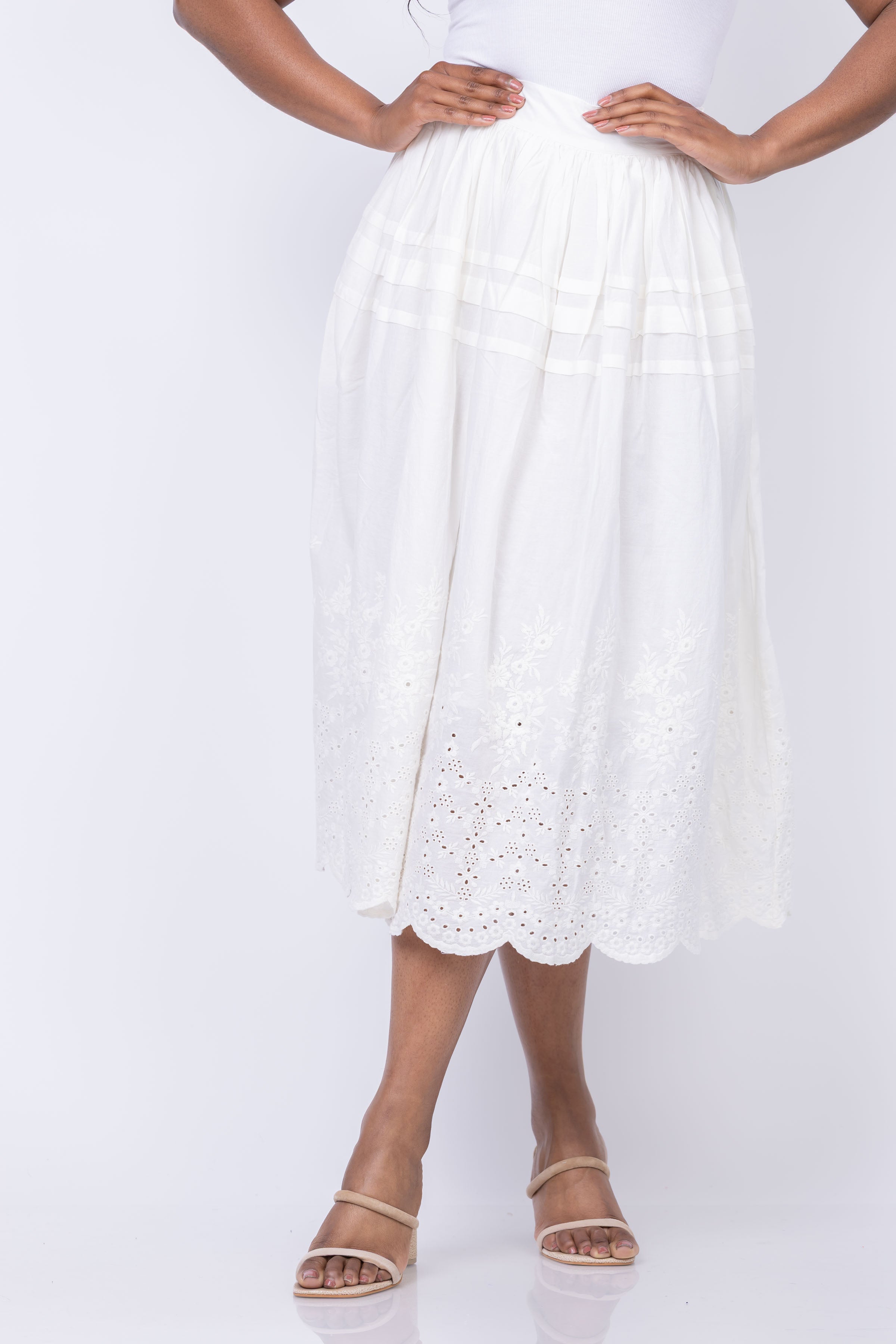 Experience the perfect blend of elegance and modern style with the Mille Leonie Skirt in White Eyelet. The horizontal tiered pintuck detail at the hip adds a touch of sophistication while the scalloped hemline and side slash pockets provide practicality. Fitted at the natural waist with a side zip closure for a flattering fit. Make a statement in this fully lined skirt!
