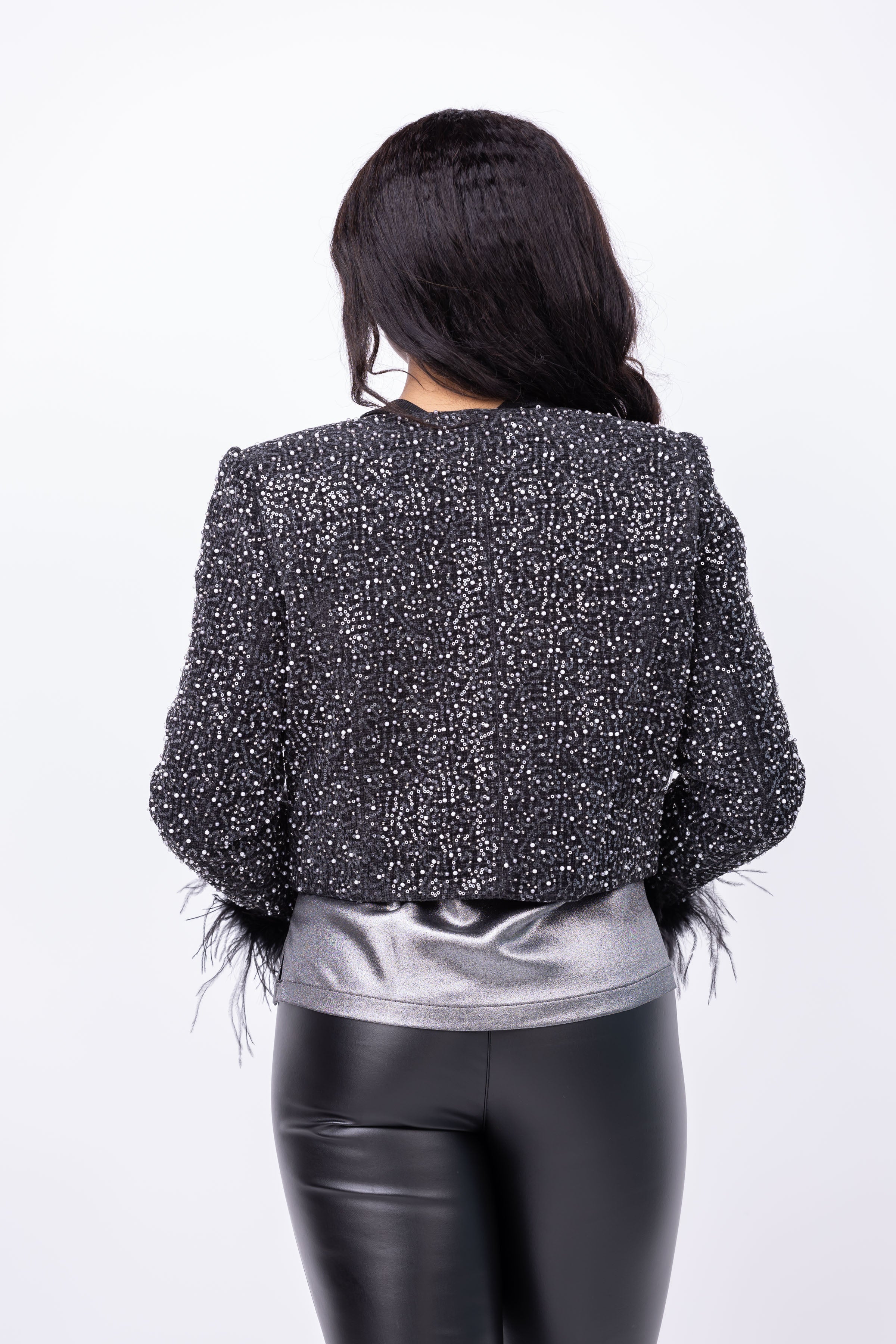 Elevate your style with the Milly Aya Beaded Tweed Feather Cuff Jacket in Black. The boxy silhouette, adorned with beaded sequin embellishment, exudes elegance and sophistication. The front button closure and feather-trimmed cuffs add unique touches. Complete the look with the coordinating Beaded Tweed Modern Mini Skirt for a polished and chic ensemble.