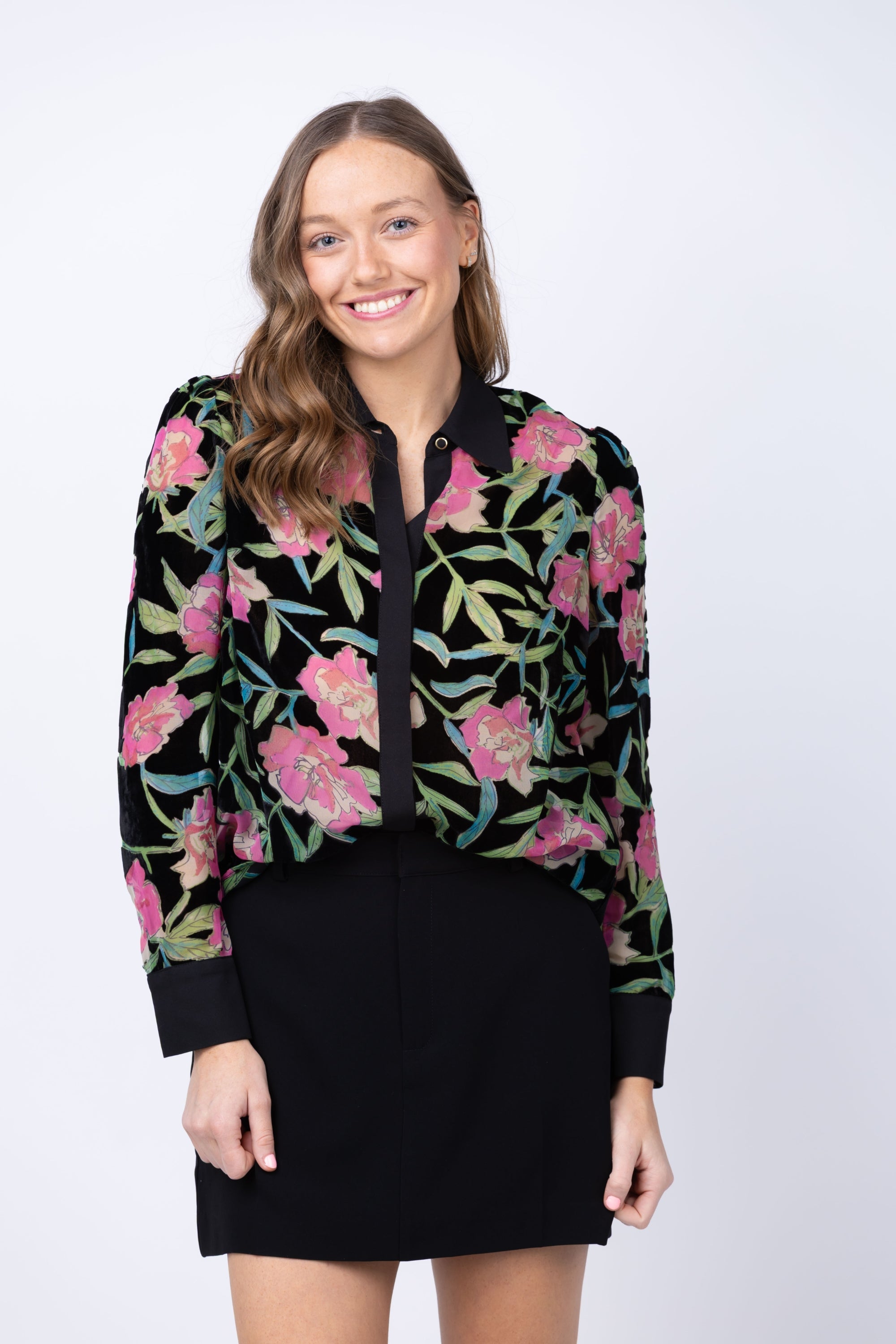 Elevate your everyday look with this stunning devoré collared blouse, where delicate pink florals dance across luxurious black velvet. The burnout technique creates gorgeous texture and dimension that catches the light beautifully. Style it tucked into your favorite pants or skirts for an instantly polished vibe that works from office to dinner. A versatile piece that transforms any outfit into something special.