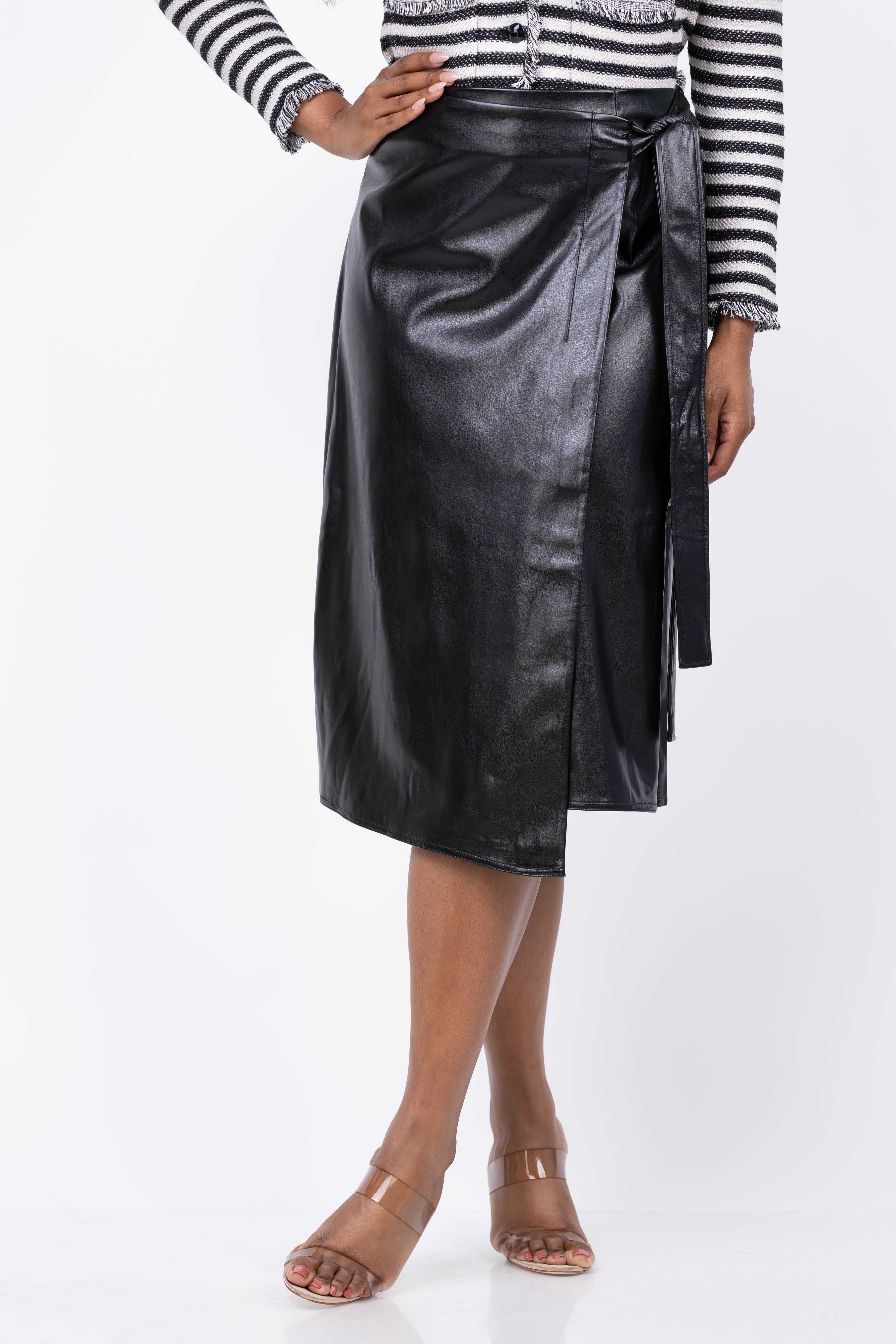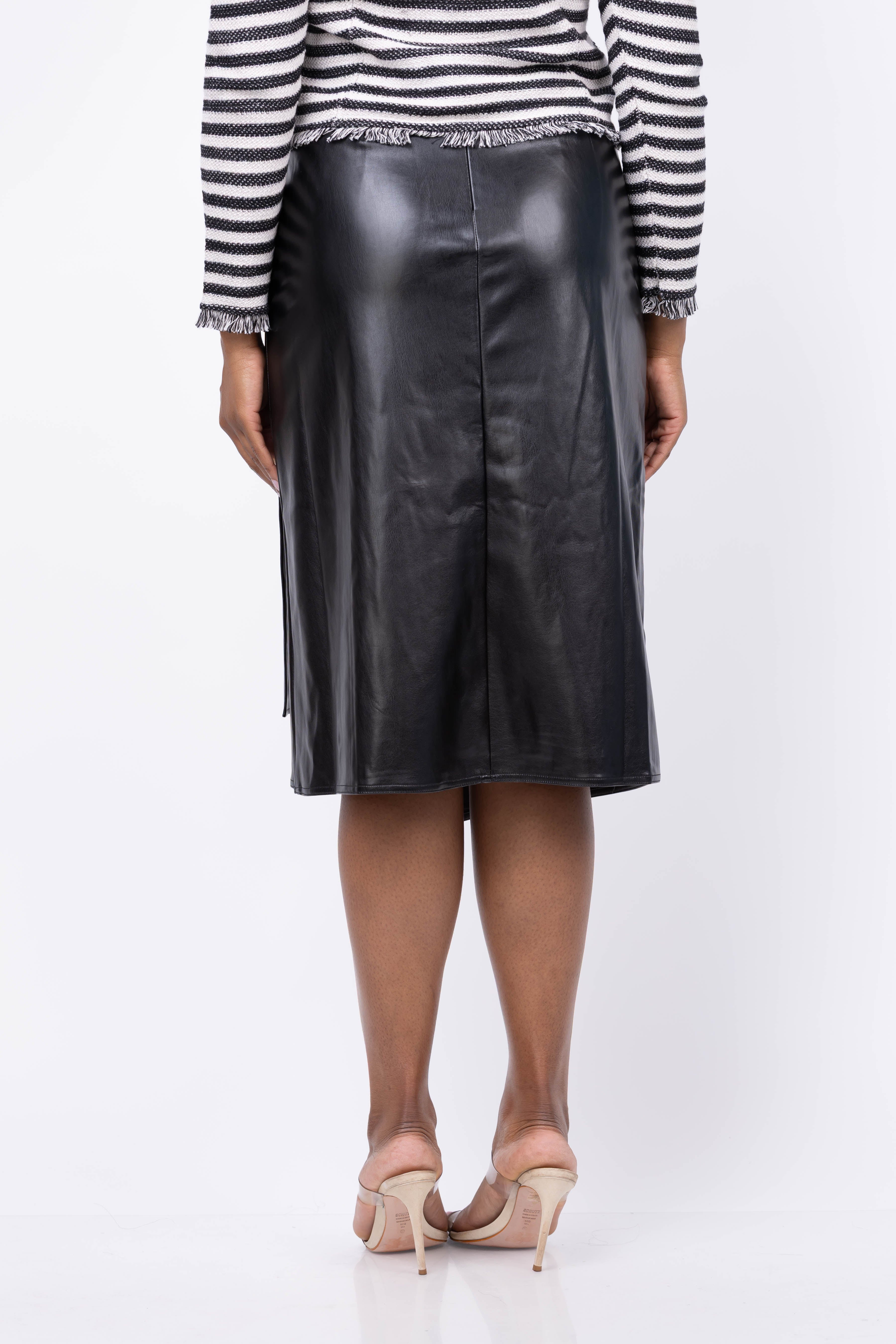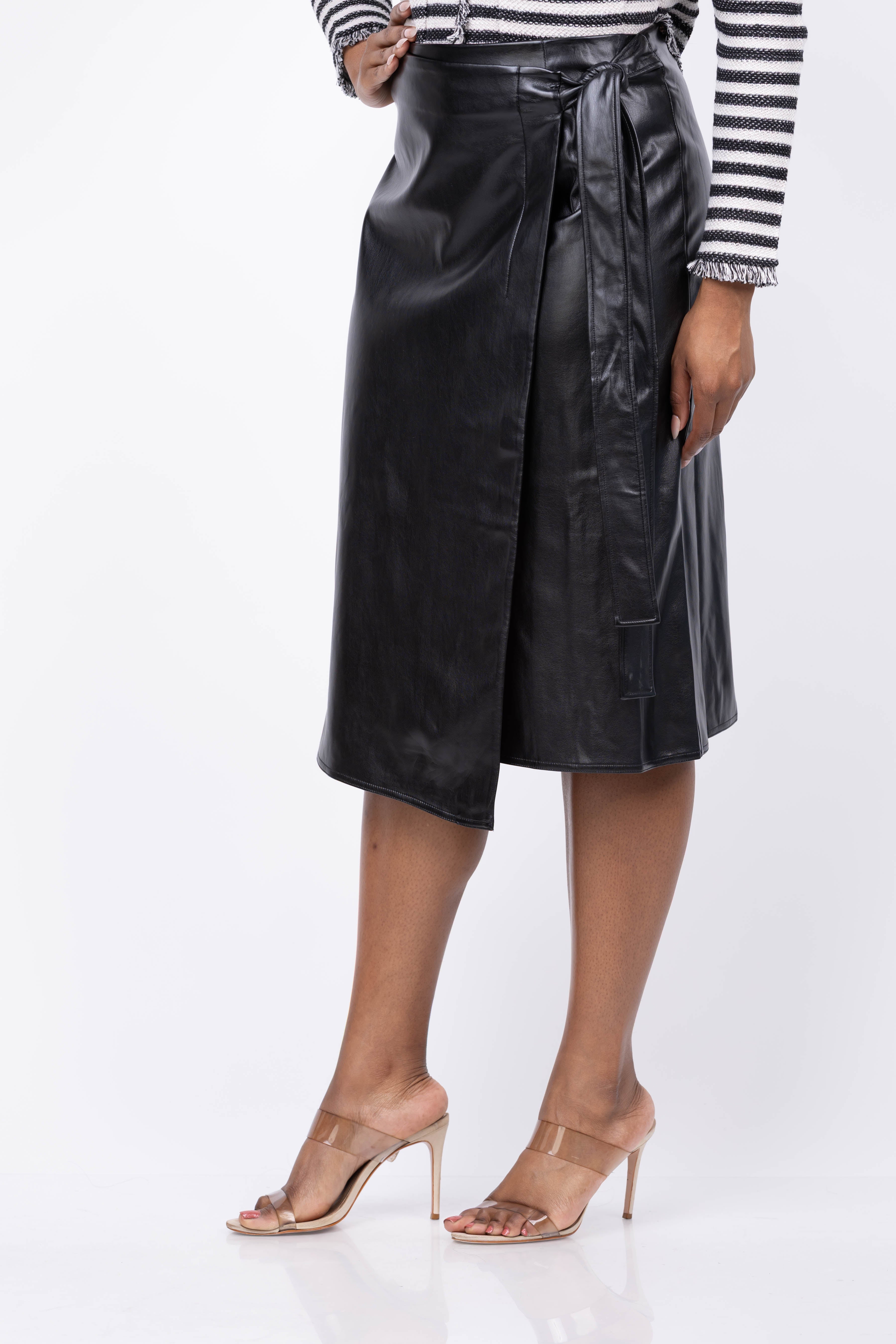Crafted from buttery soft vegan leather that mimics genuine leather, this A-line maxi skirt offers a sophisticated wrap-style silhouette. The elegant bow accent at the waist adds a refined touch, making it perfect for pairing with your favorite MILLY blouse or faux leather top. Embrace cruelty-free luxury and elevate your wardrobe with this versatile and flattering black skirt.
