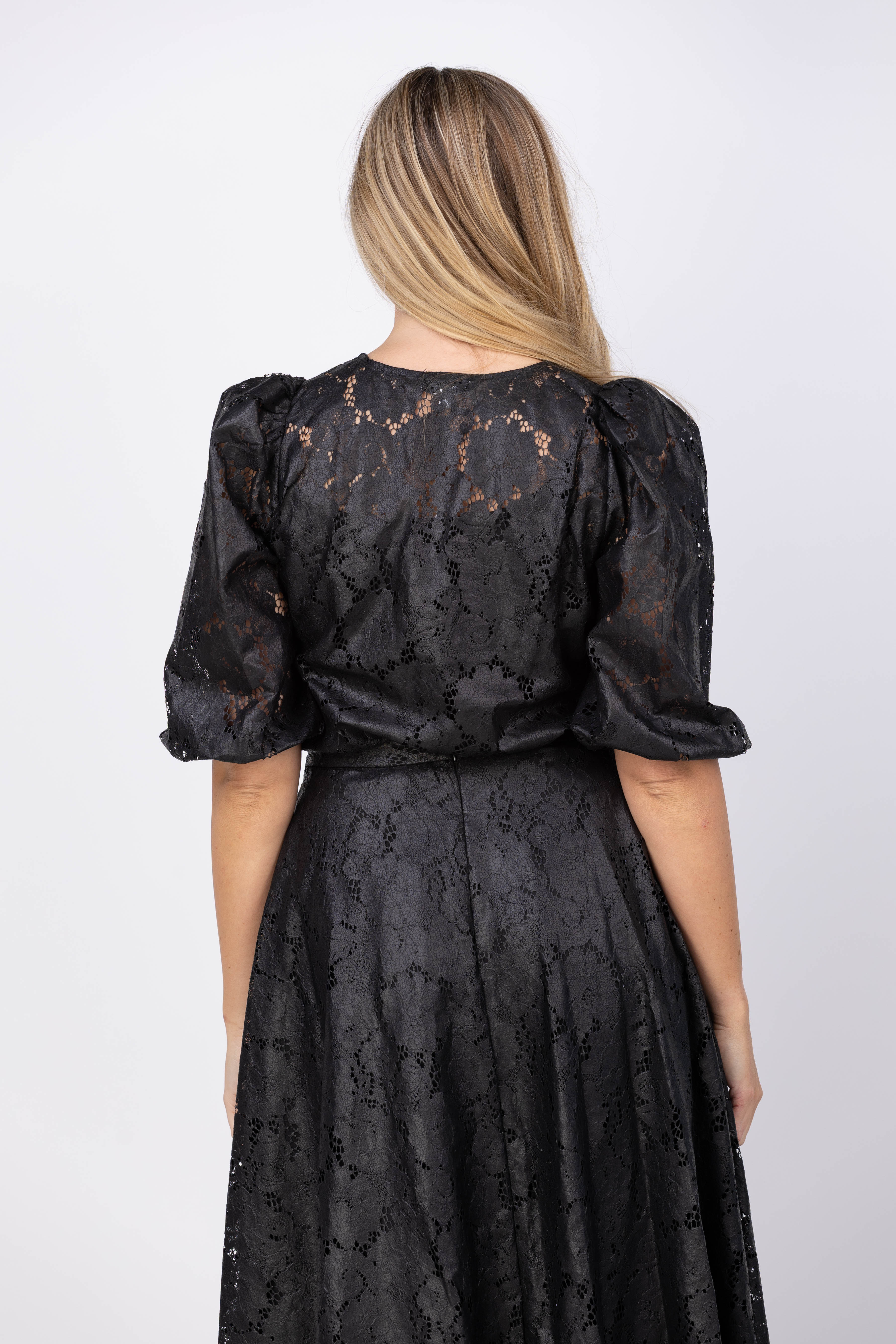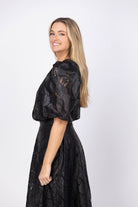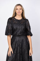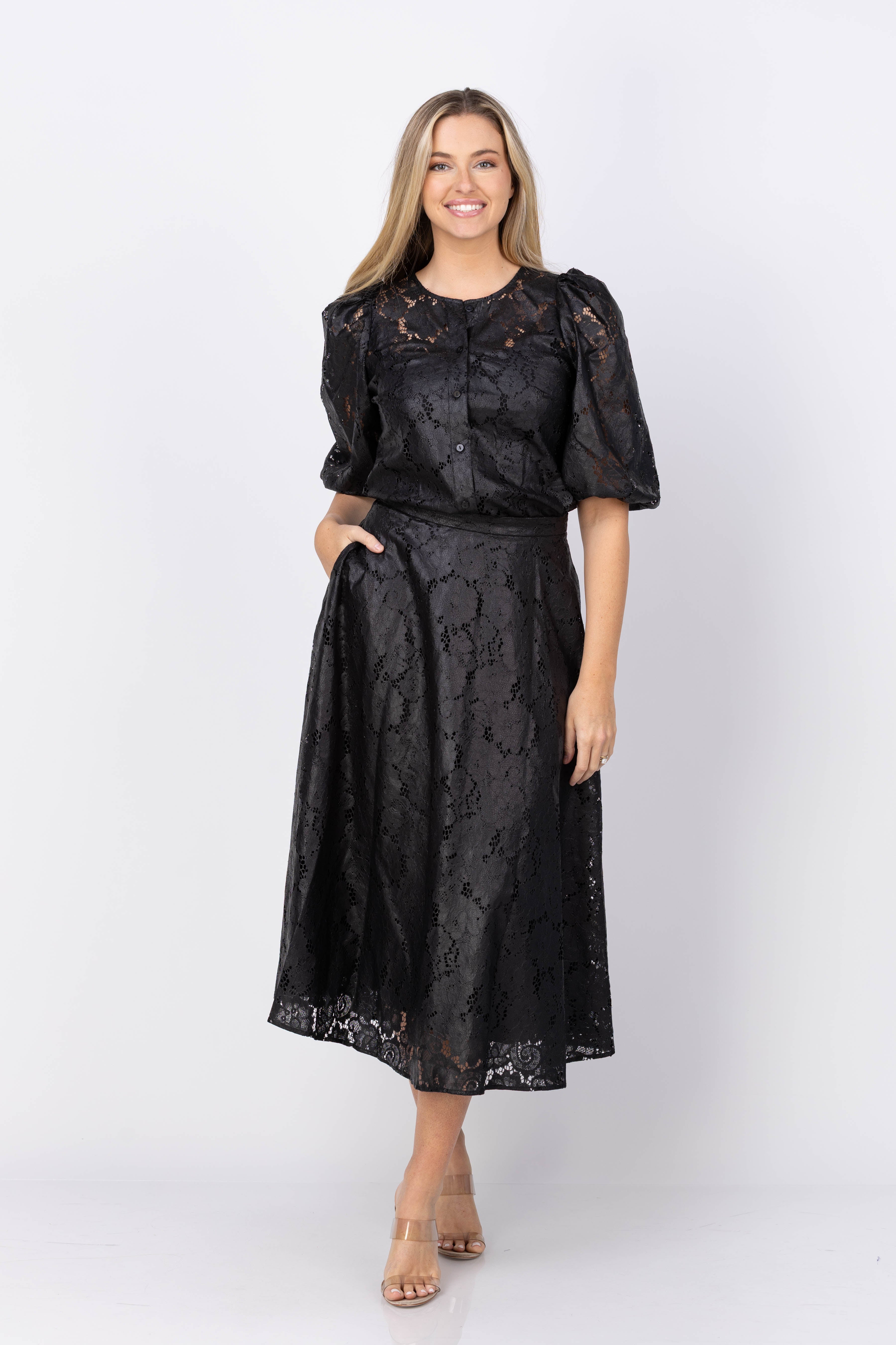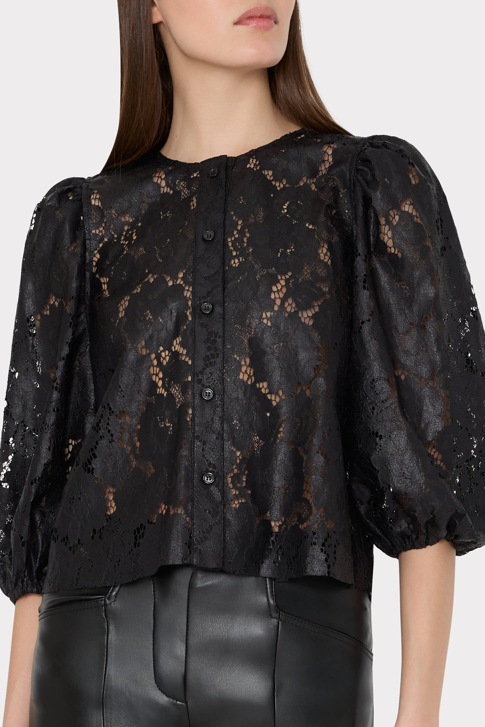 Cut from textured, embossed leather lace, the Milly Nannie Textured Lace Top in Black offers a striking twist on the classic puffed sleeve blouse. Its unique material adds depth and sophistication, making it a standout piece for any wardrobe. Pair it with the coordinating Otha Textured Lace Skirt for a complete, fashion-forward ensemble that commands attention.