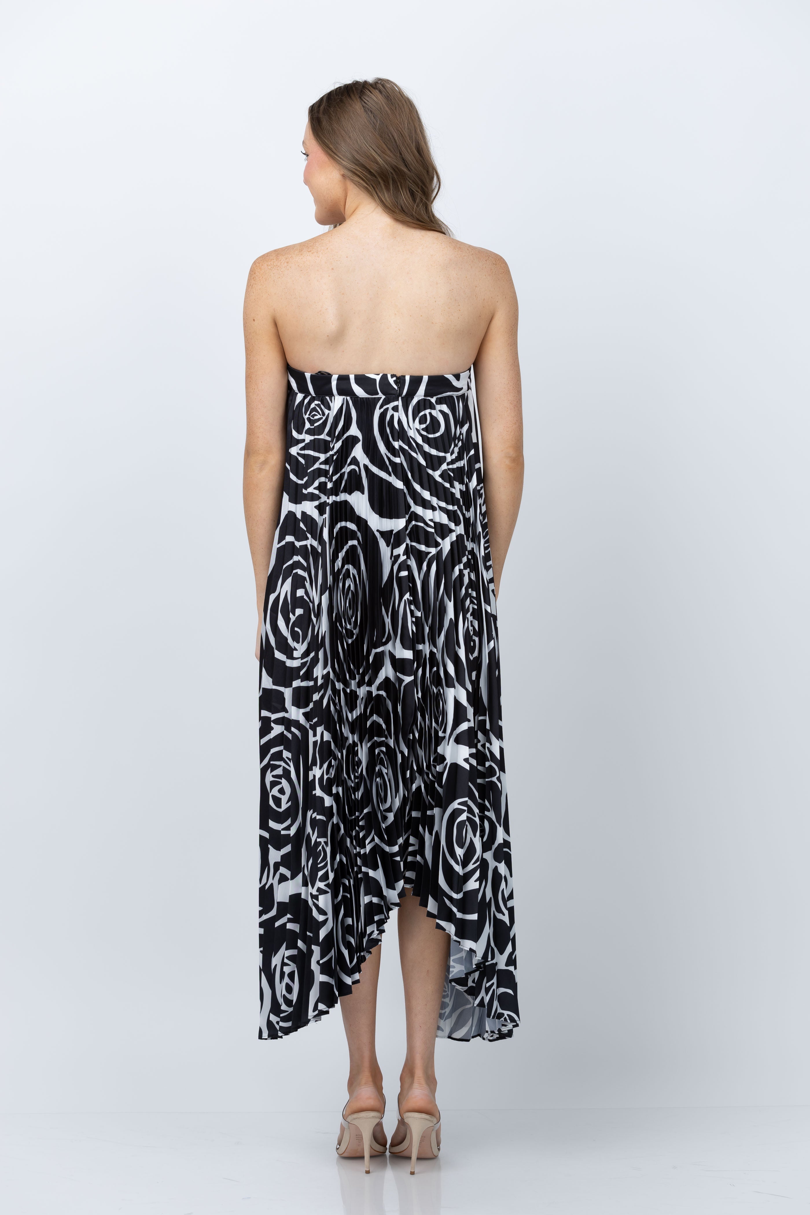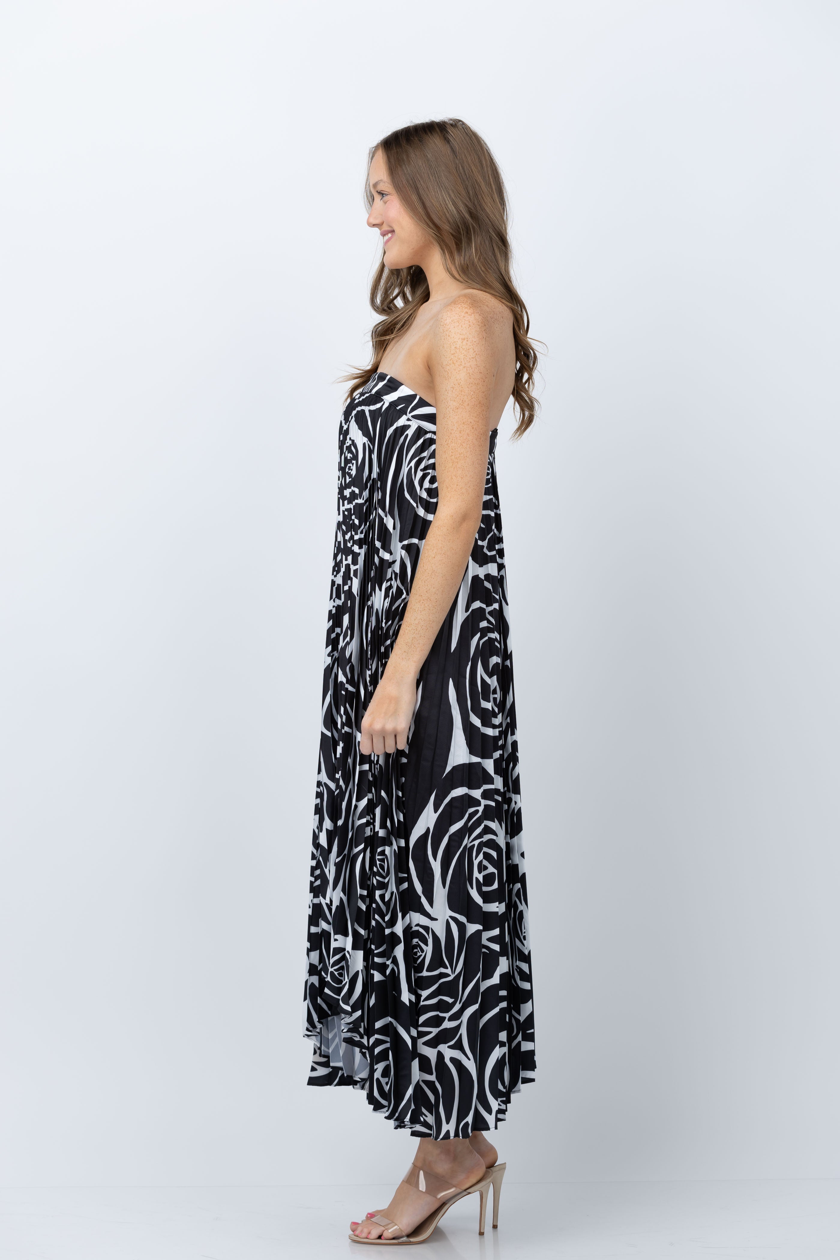 Experience effortless elegance in the Milly Nava Dress in Black Rose. This strapless, flowy maxi dress boasts an atypical, uneven hemline for a unique touch. Made from pleated satin, the corseted bust provides support while still allowing for a comfortable and forgiving silhouette. Perfect for any special occasion, this dress is a must-have for your wardrobe.