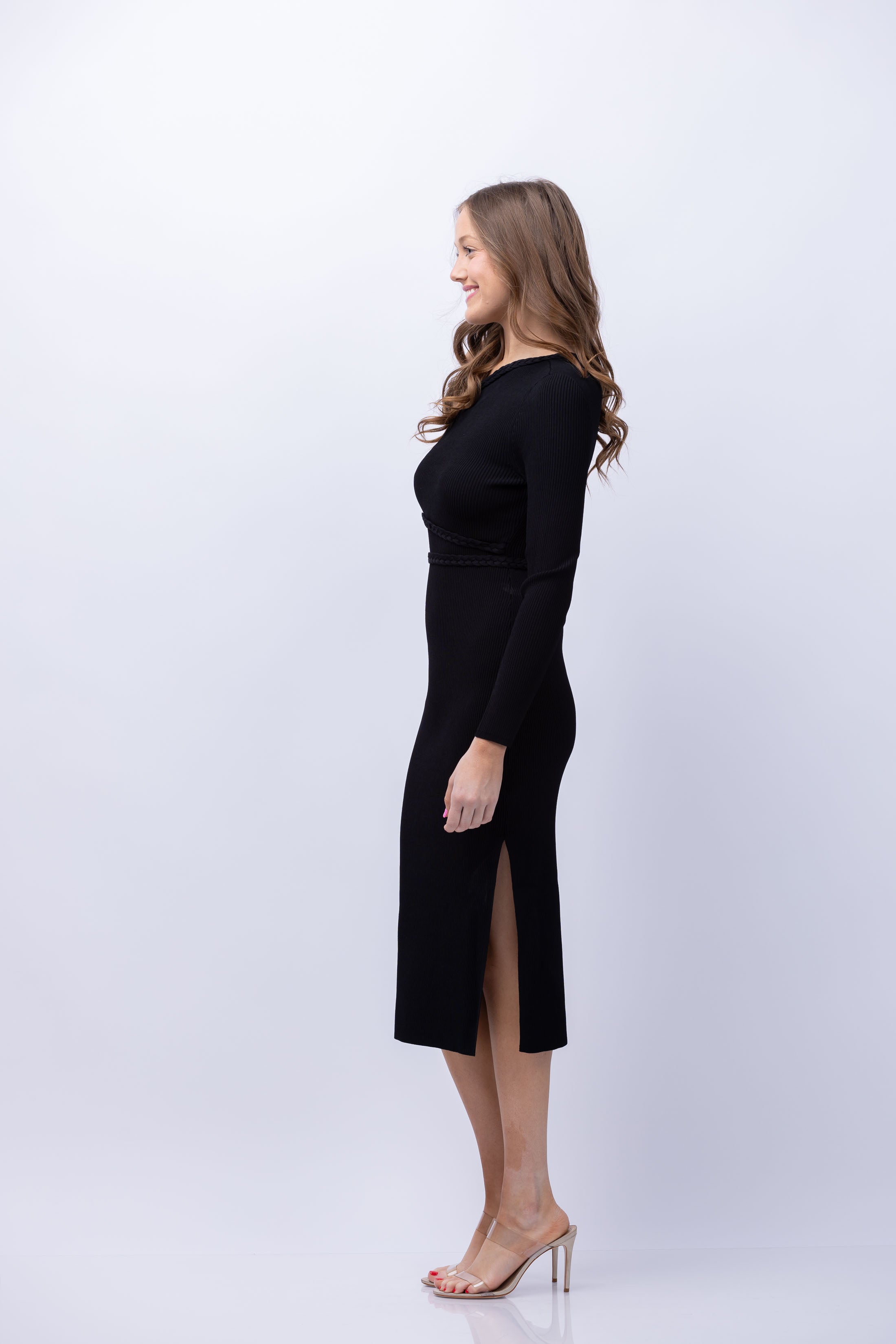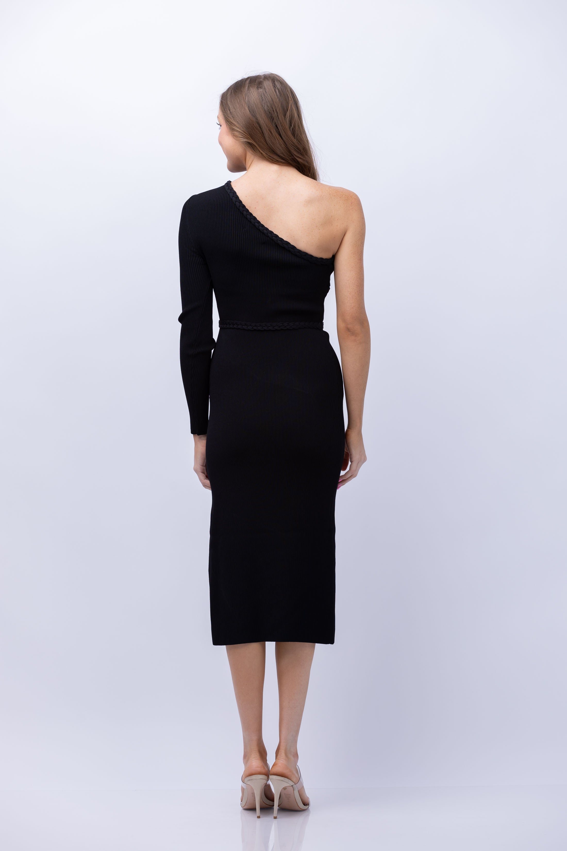 Bring the wow factor to you next event with this simple, but stunning one-shoulder dress that’s finished with a braided detail across the neckline. It fits close to the body and has a flattering side slit for movement. Just add a pair of black ankle strap heels.