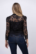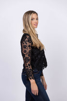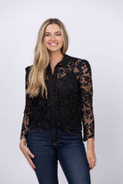 Elevate your wardrobe with the Milly June Rose Mosaic Blouse in Black. Crafted from our signature embroidered rose floral lace, this sheer, soft fabric brings delicate elegance to a sleek, straight silhouette. The slim 3/4 length sleeves feature a hidden zipper at the wrist for adjustable comfort, while pleated shoulders add a subtle puff for a feminine finish. Classic button-up and collar details make it perfect for layering over a lacy bra or a silk cami, ensuring a sophisticated, effortlessly stylish look.