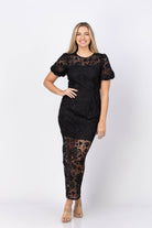 Elevate your style with the Milly Yasmin Rose Mosaic Dress in Black. This elegant dress showcases a delicate sheer overlay adorned with lace rose flowers, creating a timeless floral charm. Its feminine, slightly puffed short sleeves complement the long, flowing ruffled skirt, delivering grace and movement. Designed to make a statement with minimal accessories, it’s the perfect choice for cocktail parties or formal events where effortless sophistication matters.