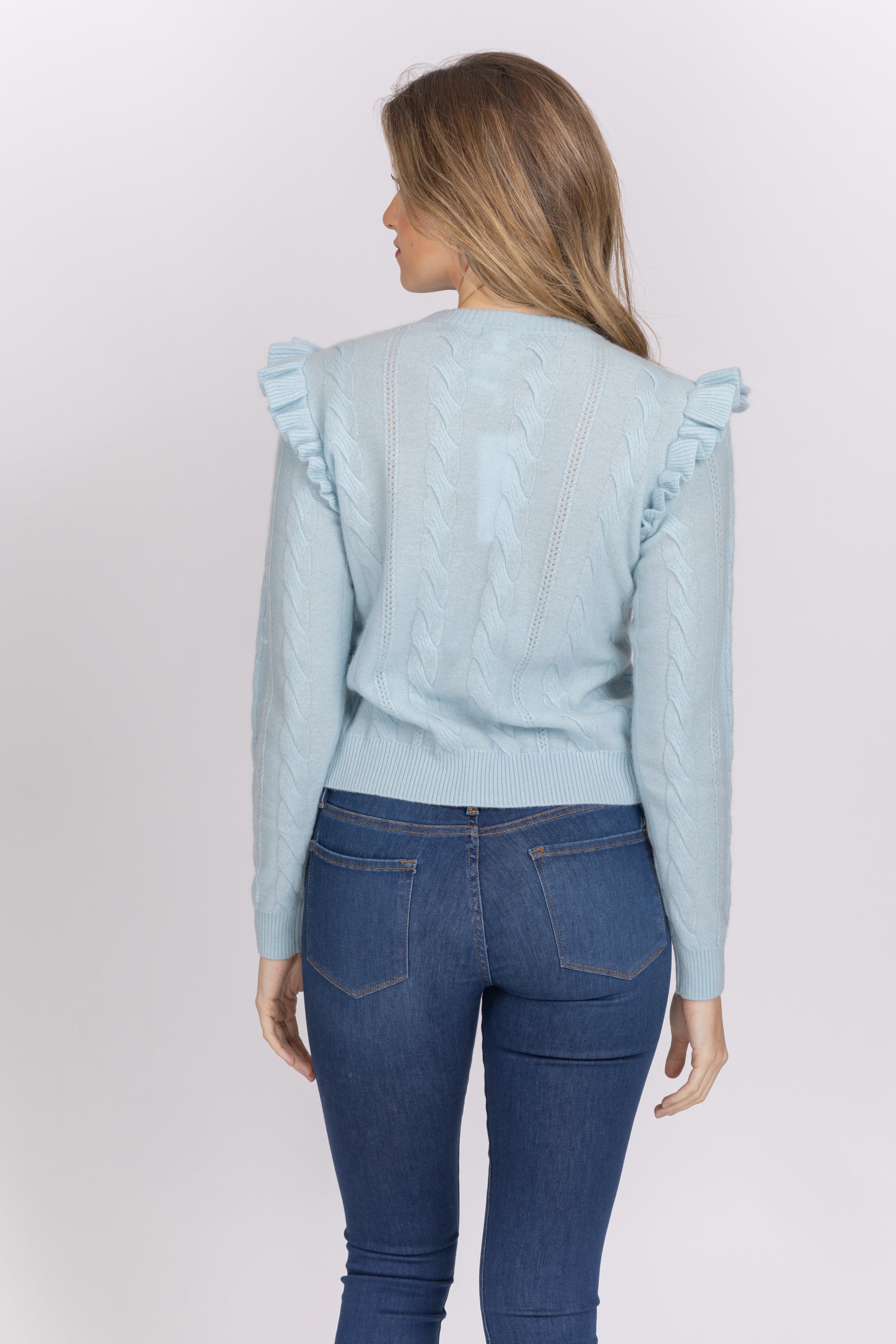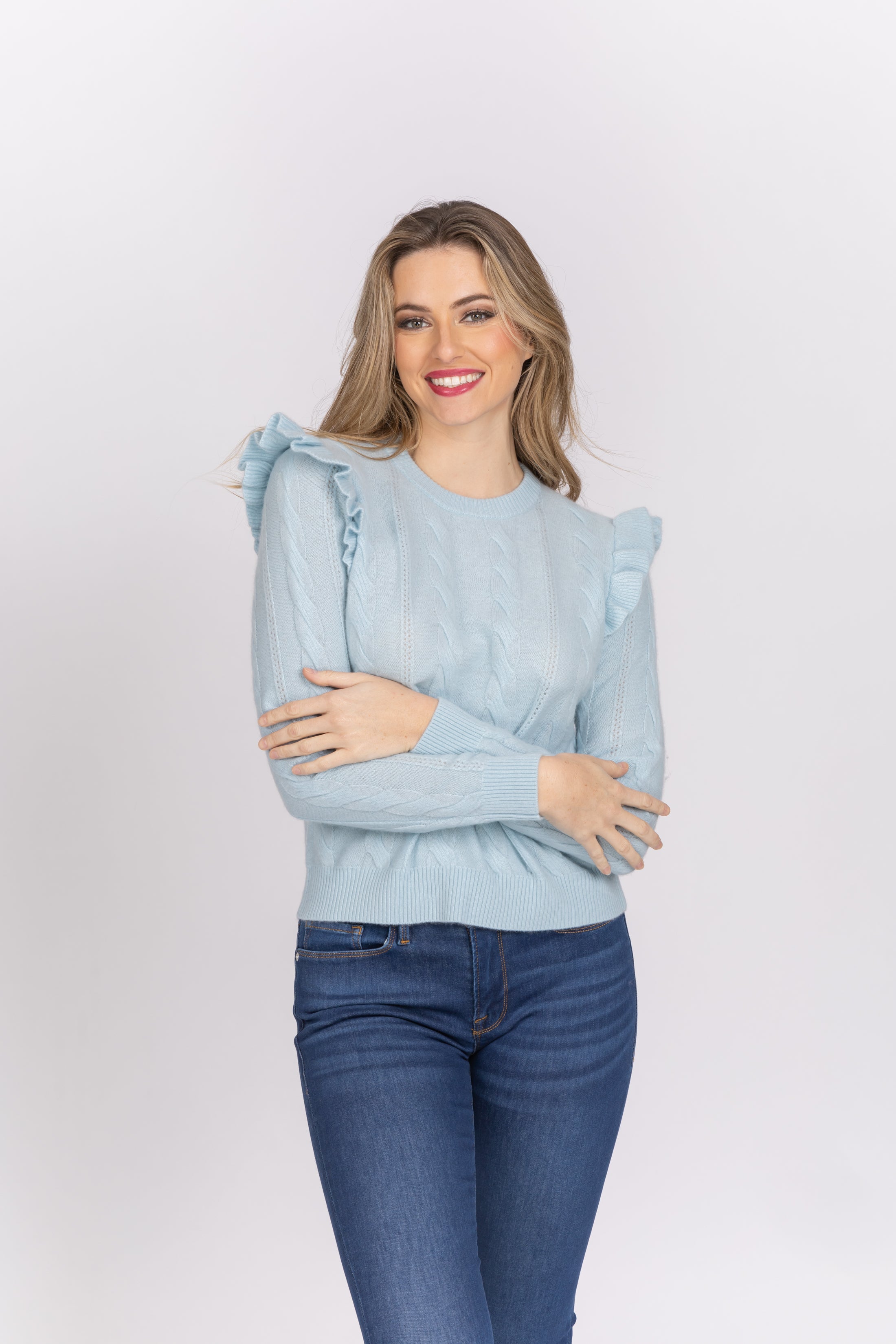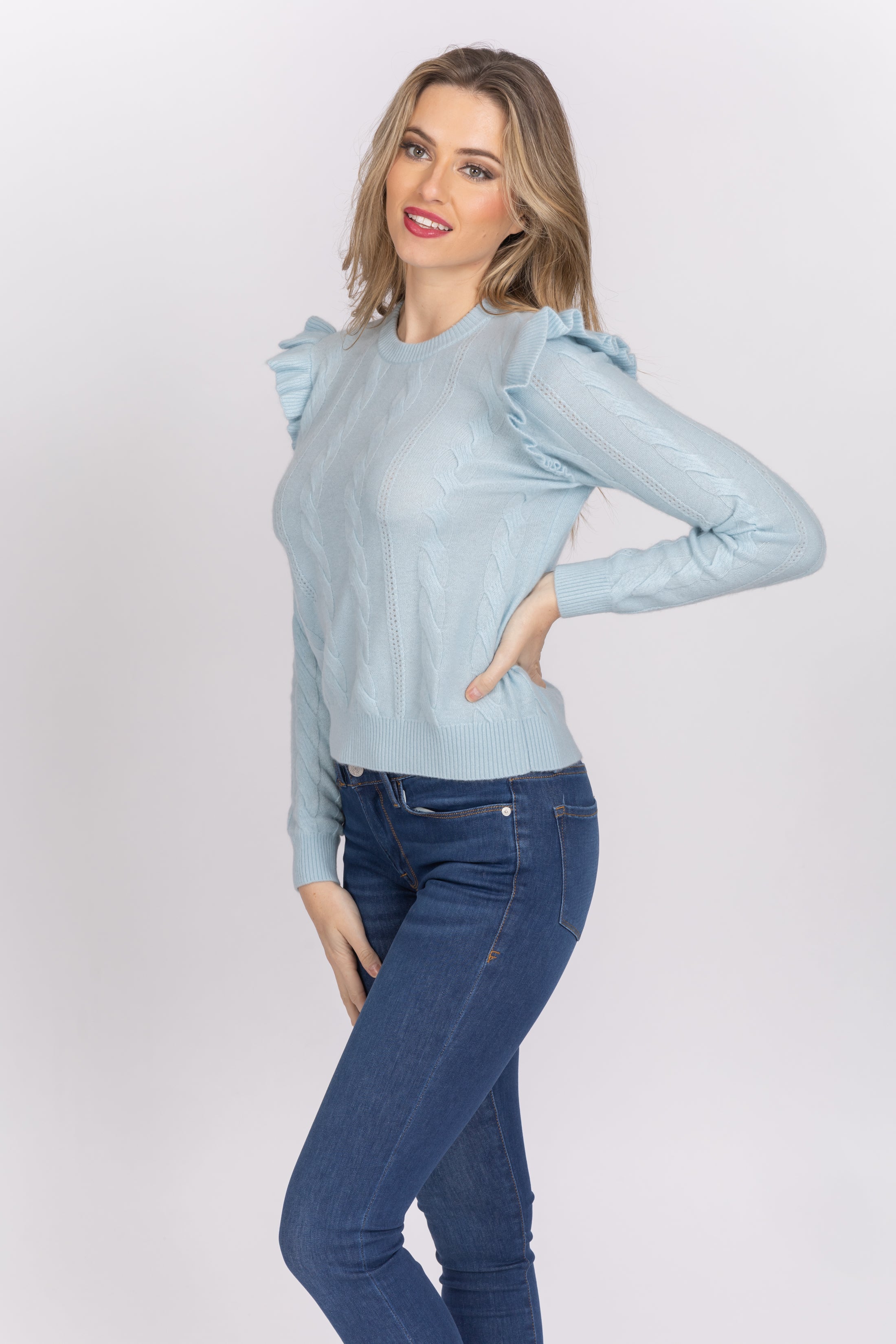 Sweetness is in style and our classic cable knit is updated with all things sweet. The addition of the ruffle bold shoulder makes for an anything-but-basic holiday ready look.