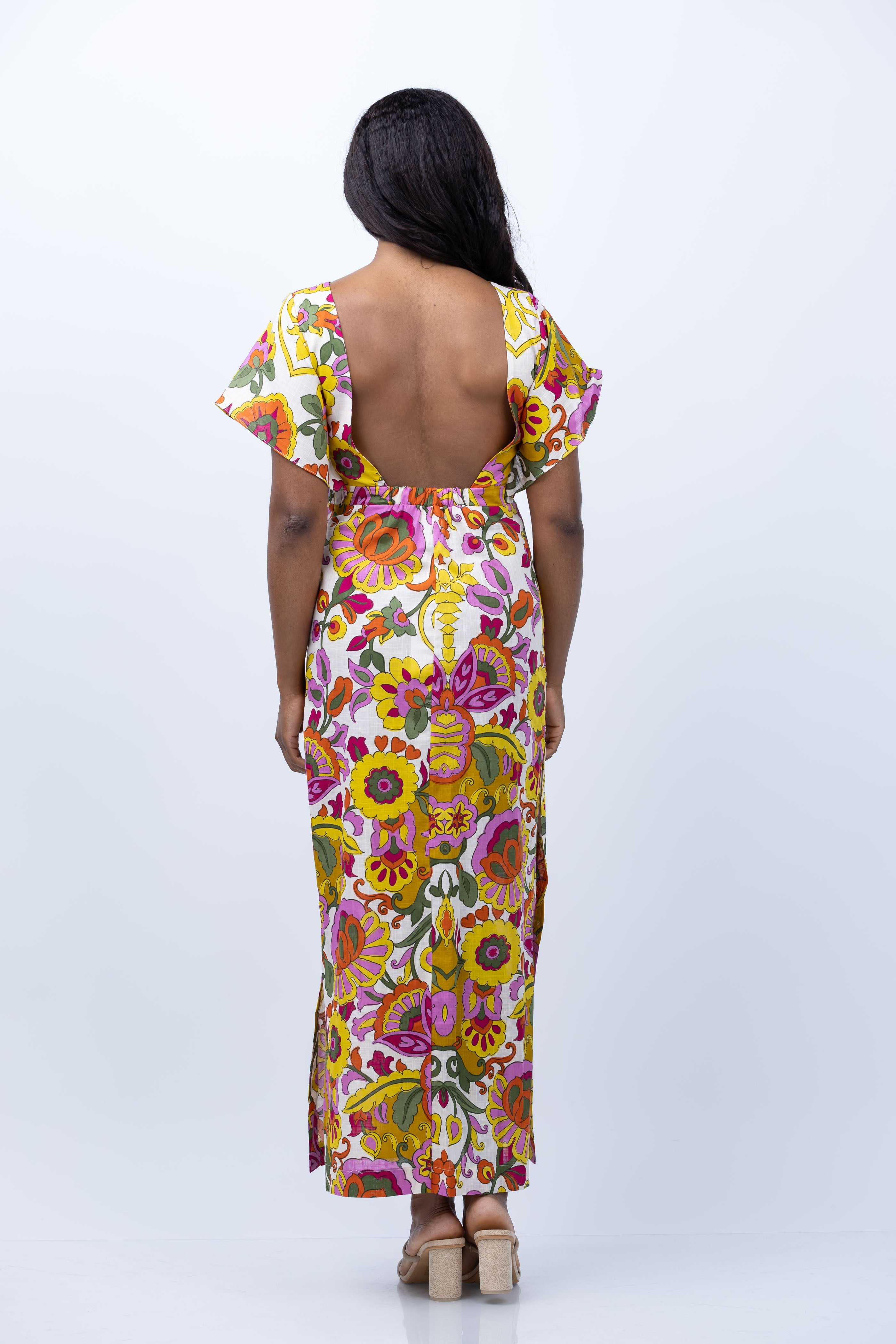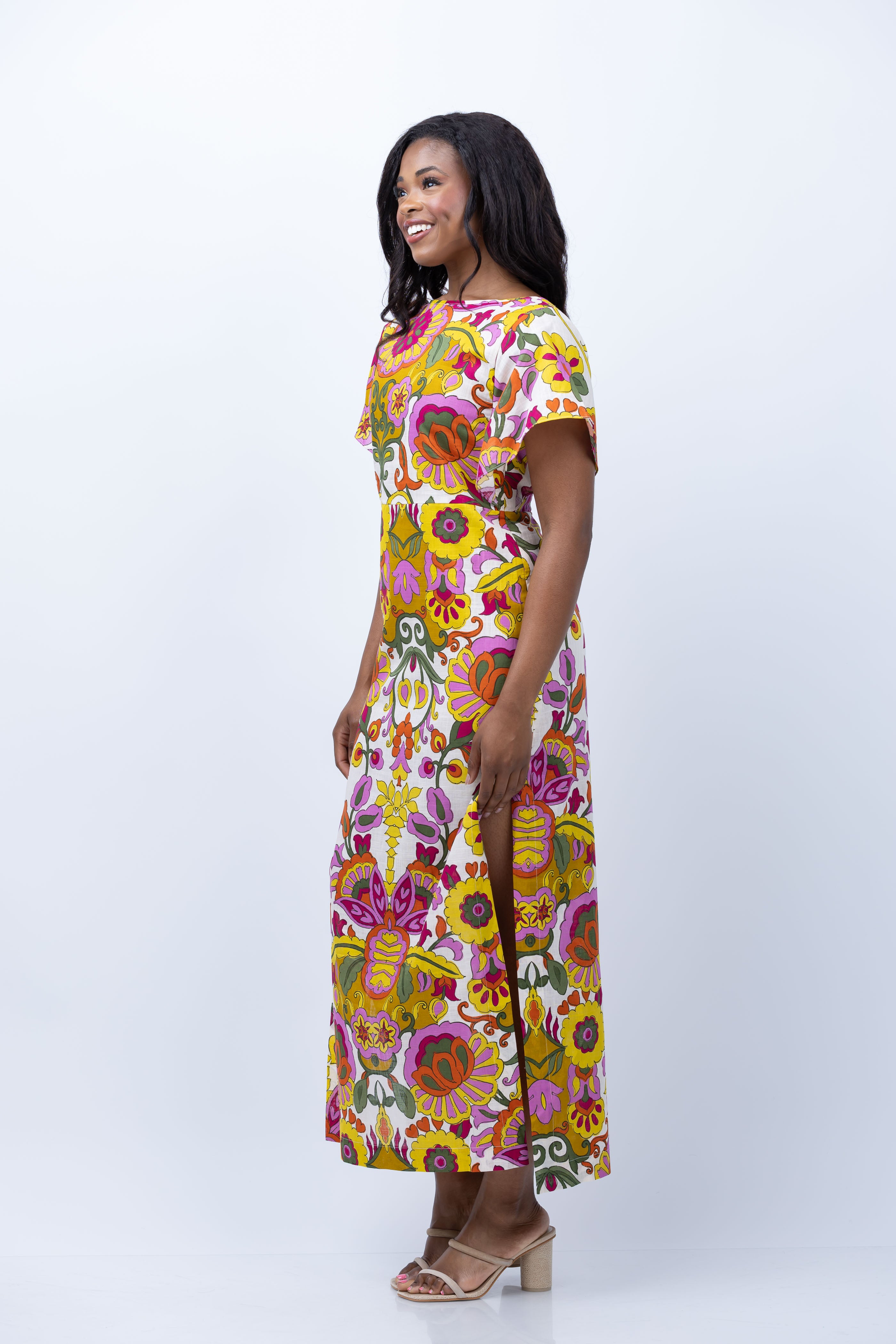 Show off your summer style with the Misa Lalita Dress in Floral Corsica. Cut from a beautiful floral chiffon, this maxi dress features a bateau neckline and short sleeves, with a playful low cut back and side split. With a concealed zip closure, it's perfect for any occasion. Elevate your look with simple flat sandals.