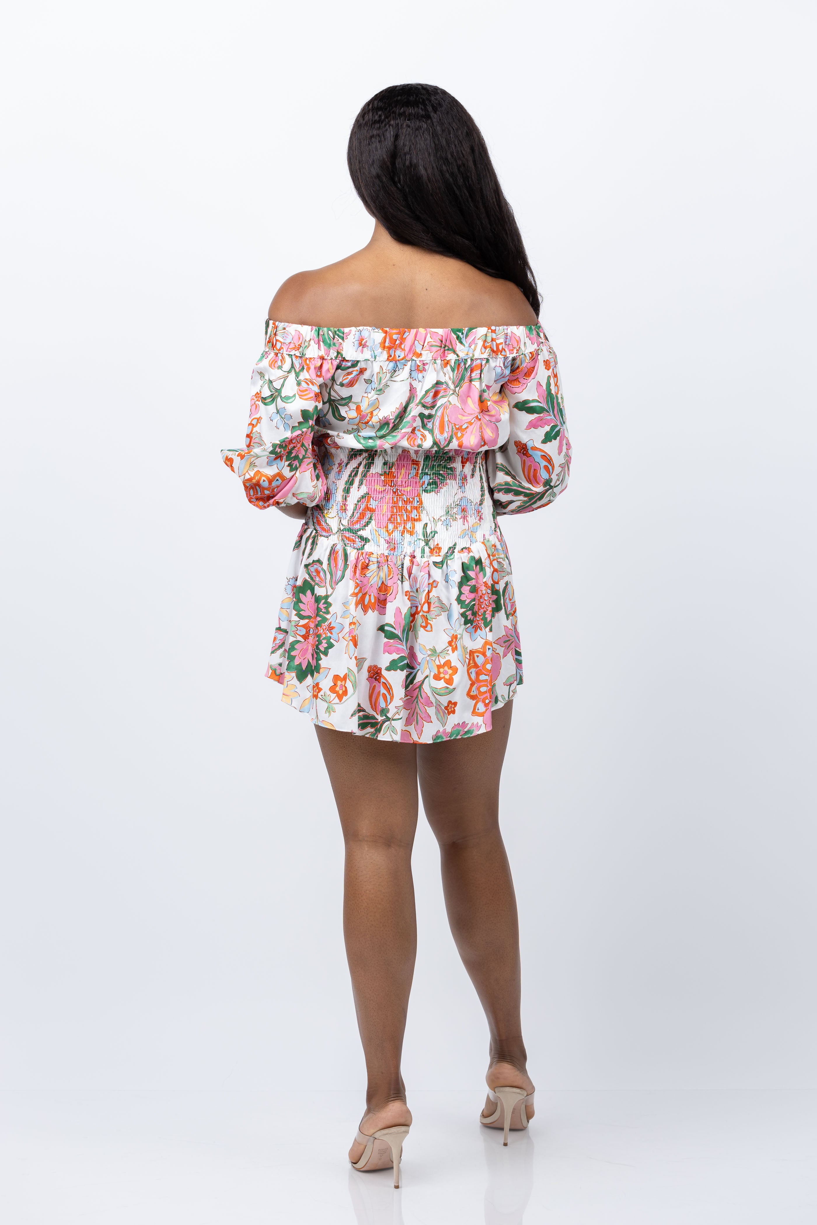 Introducing MISA Los Angeles' Marta Dress in Casablanca Floral. Perfect for any occasion, this vibrant off-the-shoulder mini features blouson sleeves and a flattering smocked waist. Made from breathable cotton poplin, it's both stylish and comfortable. A must-have for the season.