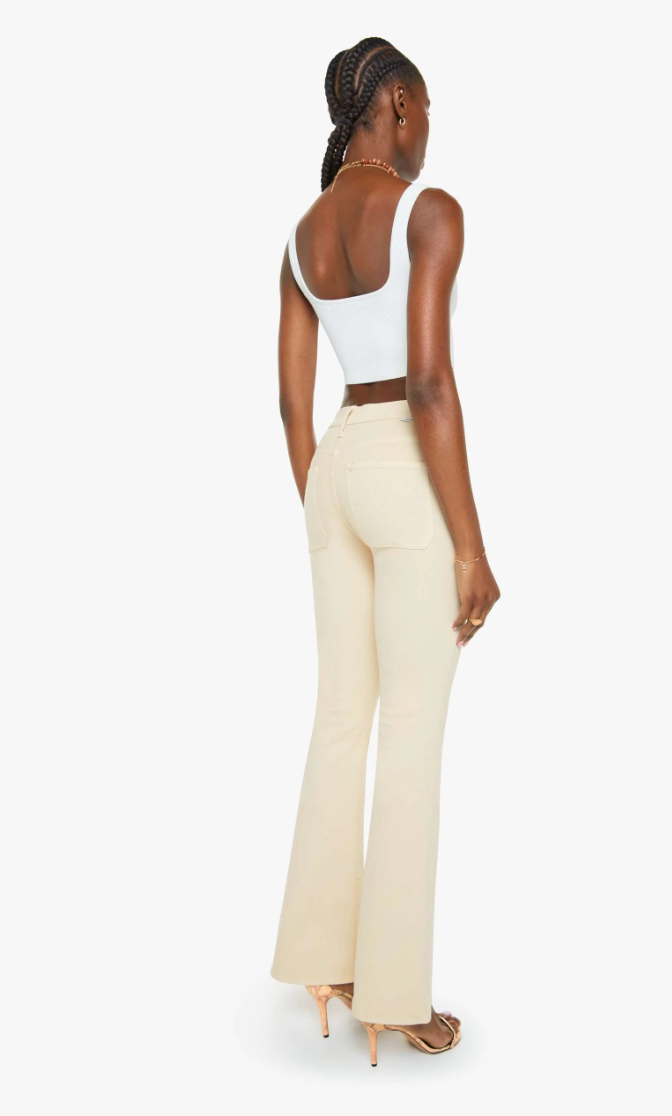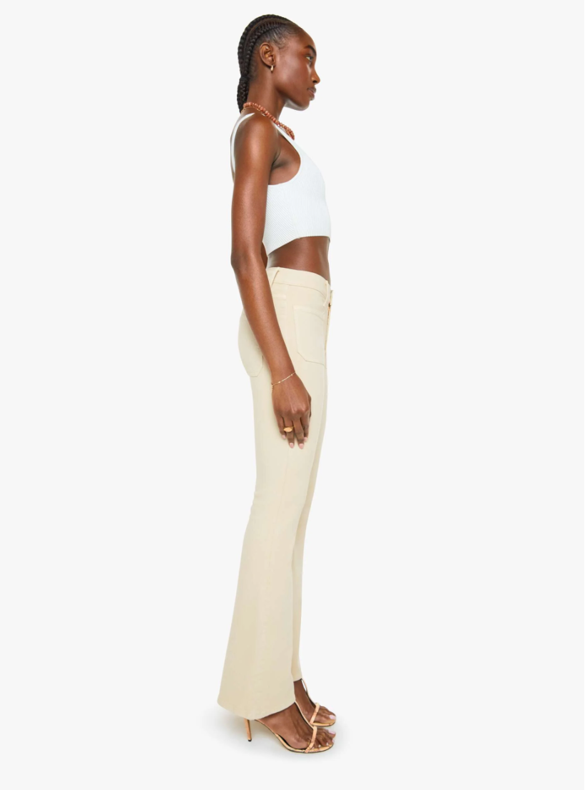 Mother Denim’s Patch Pocket Weekender Jean in Wacky Khaki combines comfort and style with its mid-rise fit and flattering flare silhouette. Crafted from stretch cotton, this jean offers ease of movement while maintaining a clean, polished look. The sandy off-white Wacky Khaki shade with tonal hardware makes it a versatile wardrobe staple. Featuring practical patch pockets and a 31-inch inseam with a neat hem, it effortlessly transitions from day to night for any occasion.