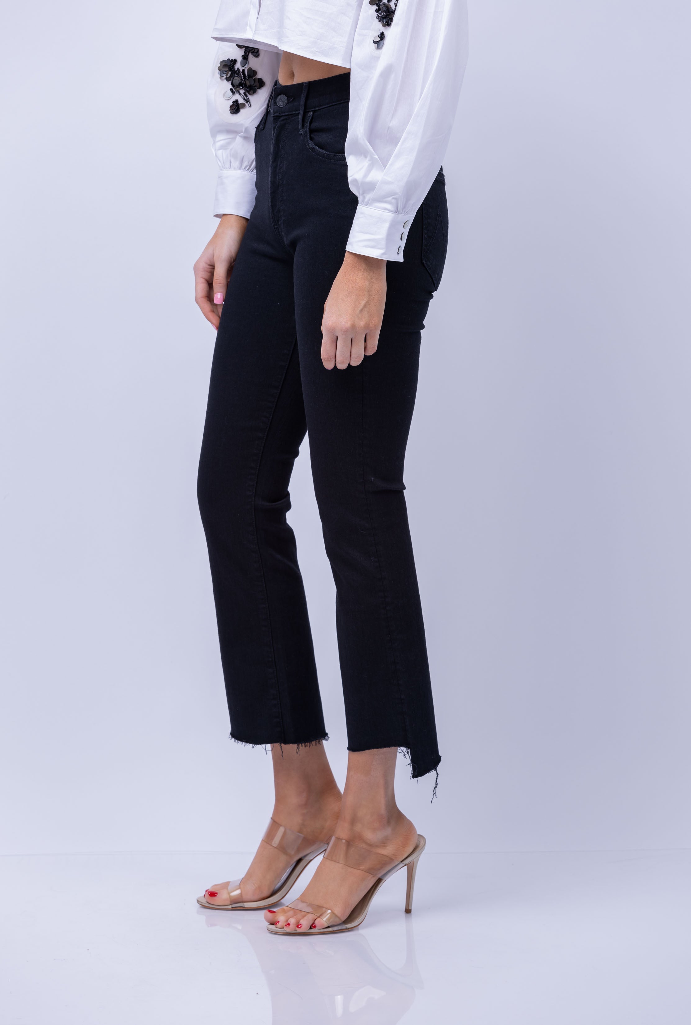 Elevate your style with Mother Denim's The Insider Crop Step Fray in Not Guilty. The high-waisted bootcut flatters your figure while the frayed step-hem adds an edgy touch. Made from stretch denim, this dark black wash is perfect for any occasion. Upgrade your denim game now!