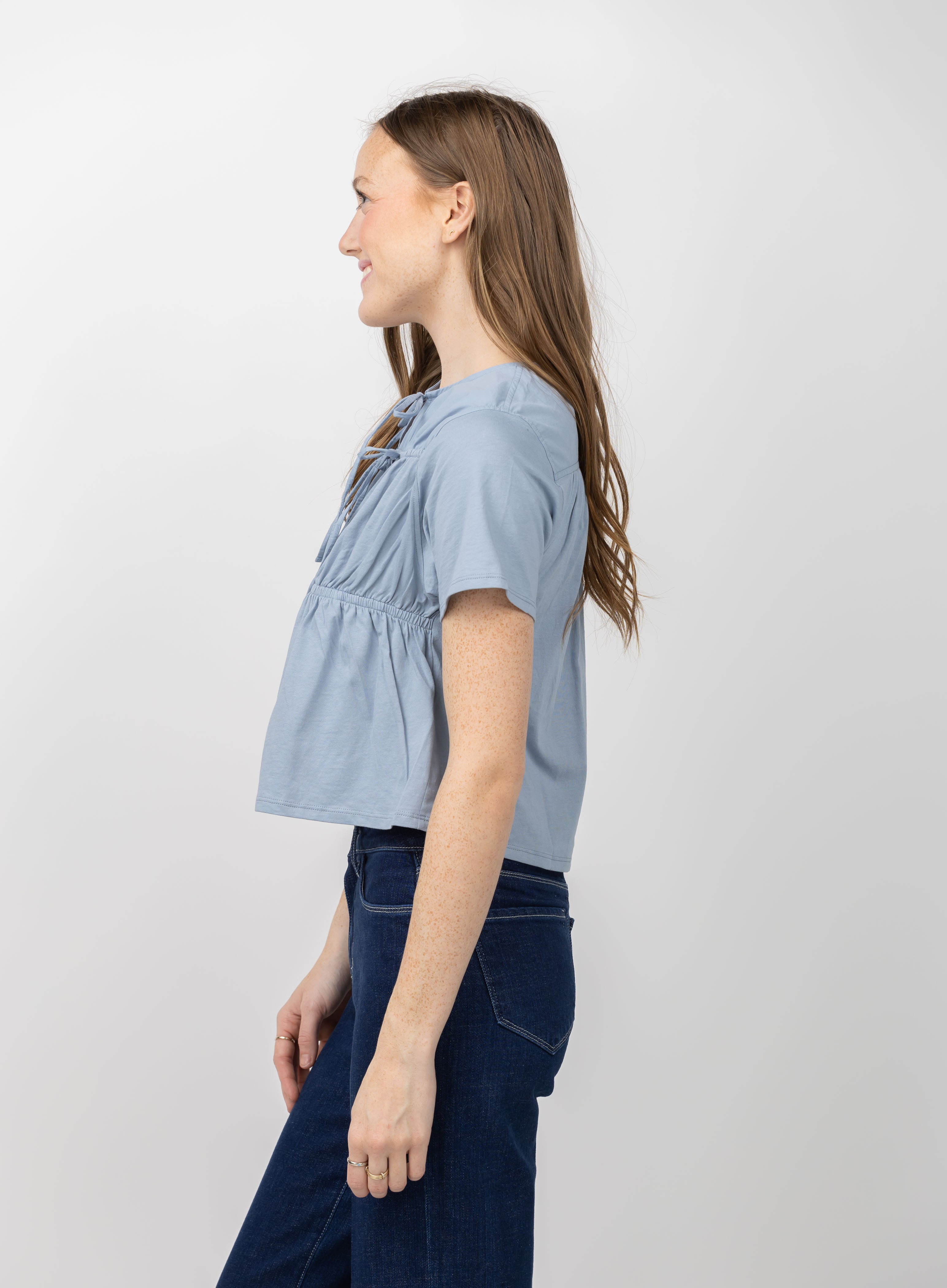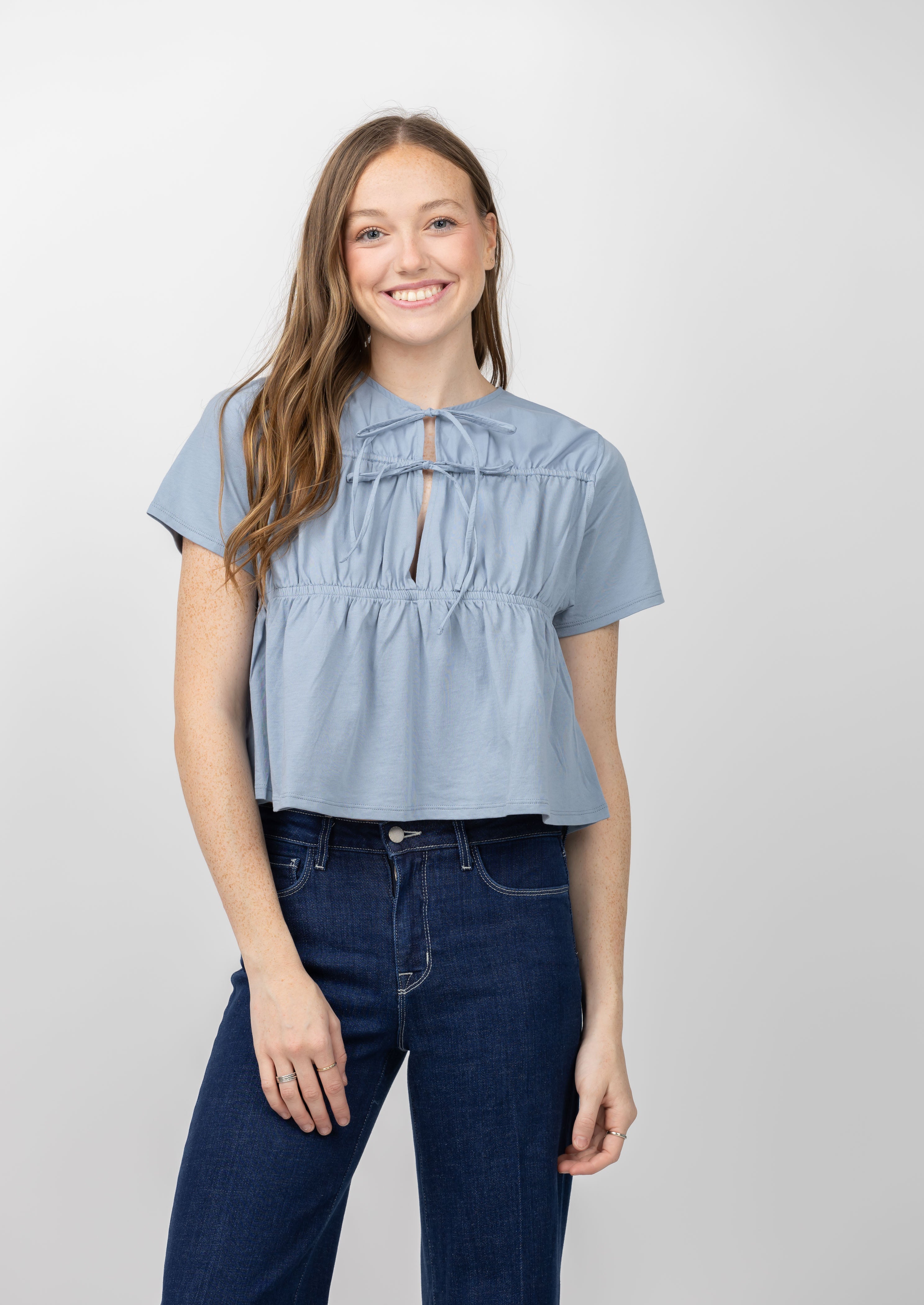 Experience effortless style with the NATION LTD Robin Tie Front Tee in Faded Denim. Let the details speak for themselves with a charming front neck tie, a keyhole closure at the back, and shirred tiers for a relaxed yet put-together fit. Embrace the perfect balance of ease and sophistication.