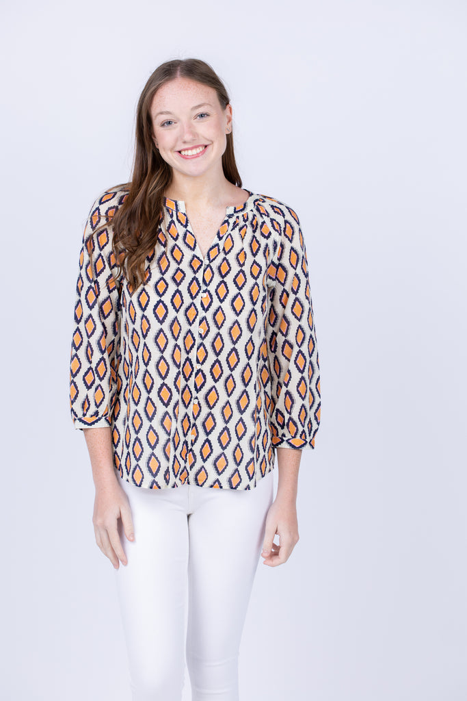 Bring color and style to your wardrobe with the Nic + Zoe Falling Diam Top. This gorgeous orange top pairs three-quarter-length sleeves for a modern, yet modest look. Perfect for casual days with friends or a night out, you'll love making a statement with this bold top!