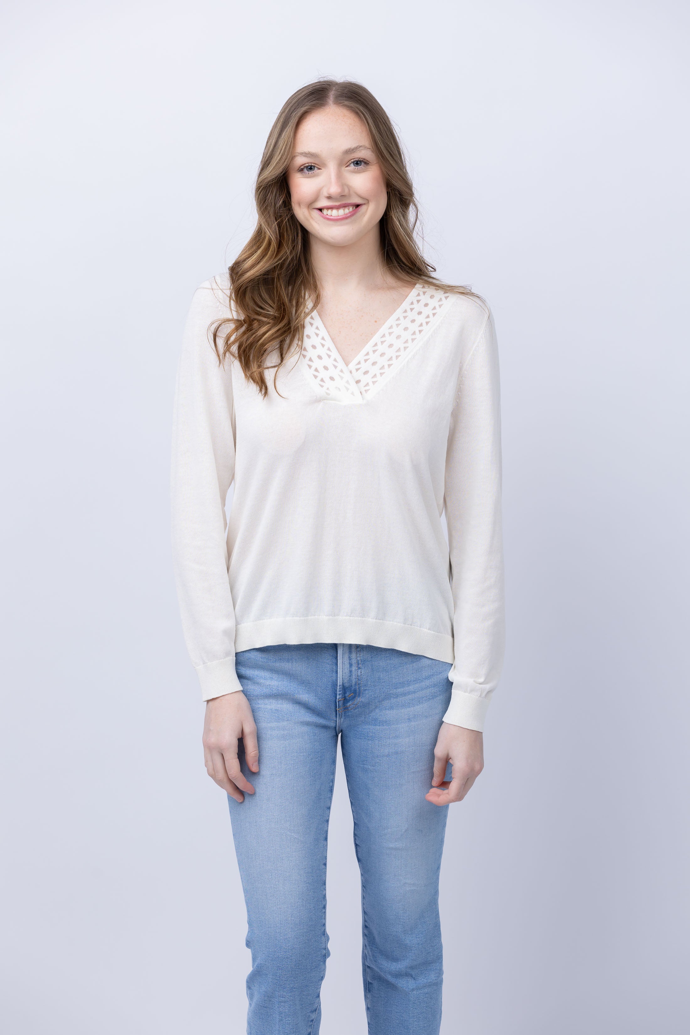 The Nic + Zoe Polished Up Sweater is a must-have for any wardrobe. Crafted from a soft cotton blend, it features a beautiful patterned V-neck and long sleeves. Versatile and timeless, this sweater can be effortlessly dressed up or down for any occasion. You'll find yourself reaching for it every day of the week!