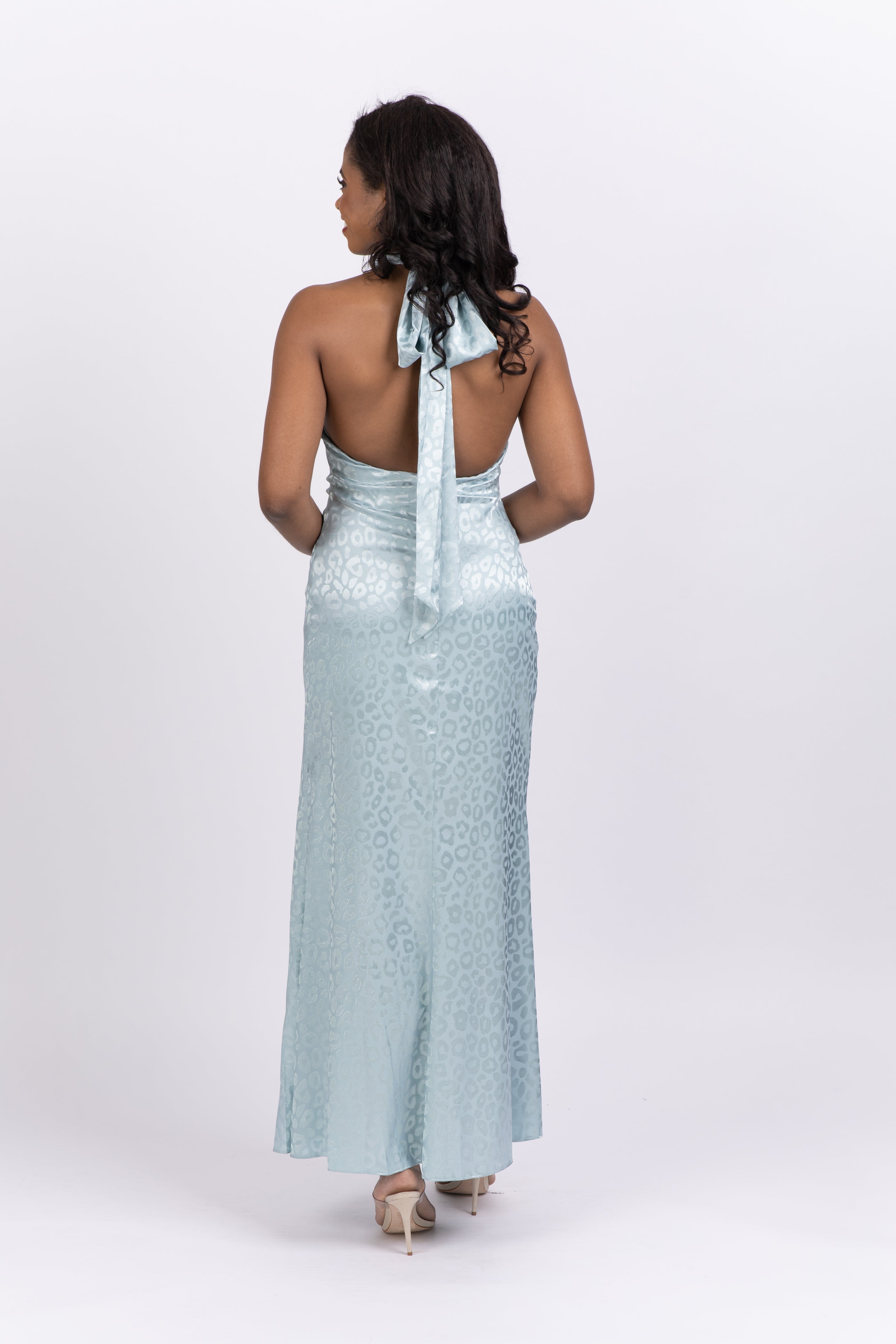 Sky blue leopard animal jacquard high-neck halter gown with tall side slit.