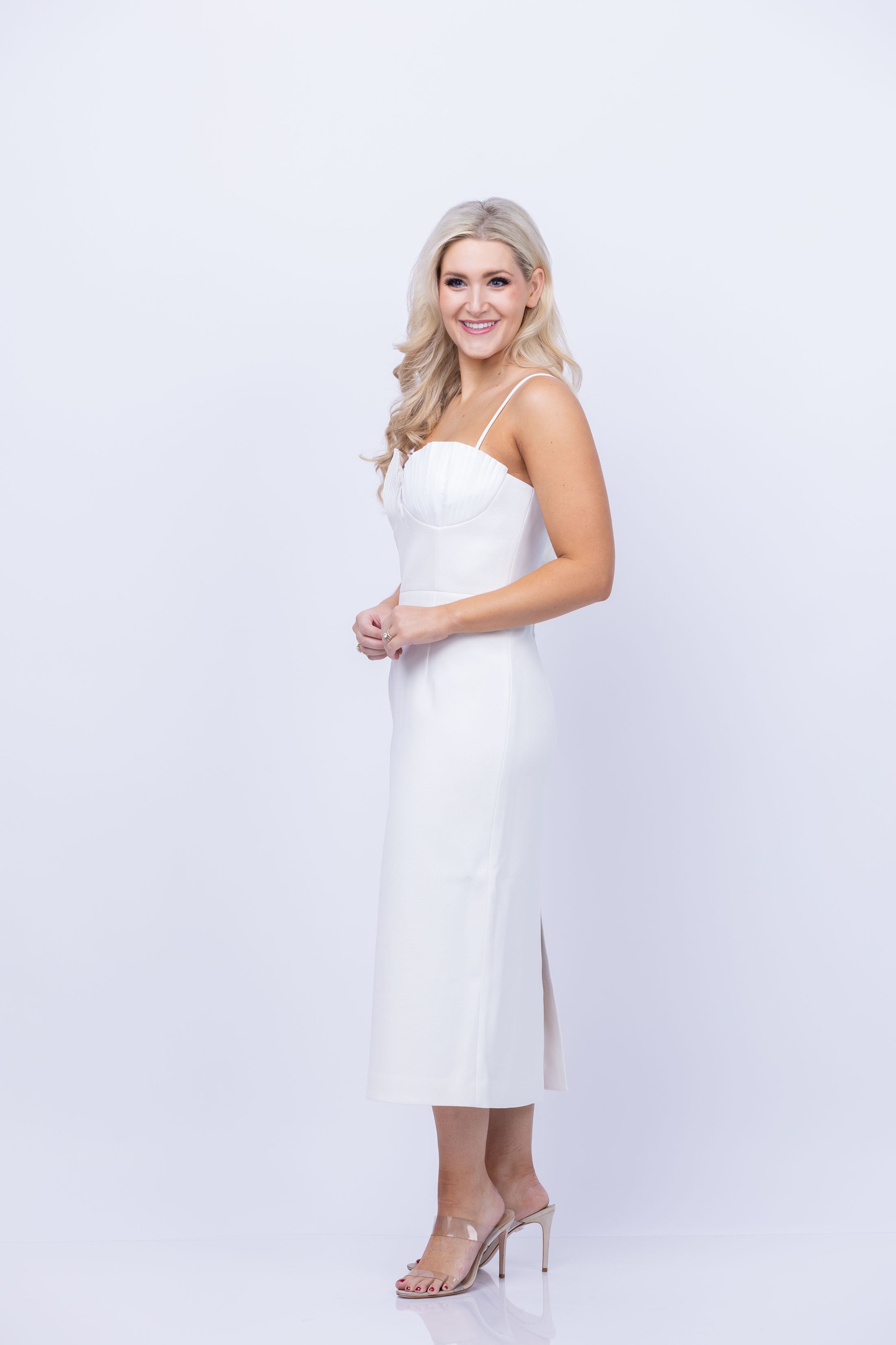 This Rebecca Vallance Cora Midi Dress is perfect for special occasions. The combination of crepe and taffeta fabric gives it a luxurious feel, while the spaghetti straps and plunge neckline create a sophisticated look. Its fitted bodice with pleated cups, cinched waist, pencil skirt and back split enhance the feminine silhouette and provide a great fit. Feel empowered and stunning in this beautiful dress!