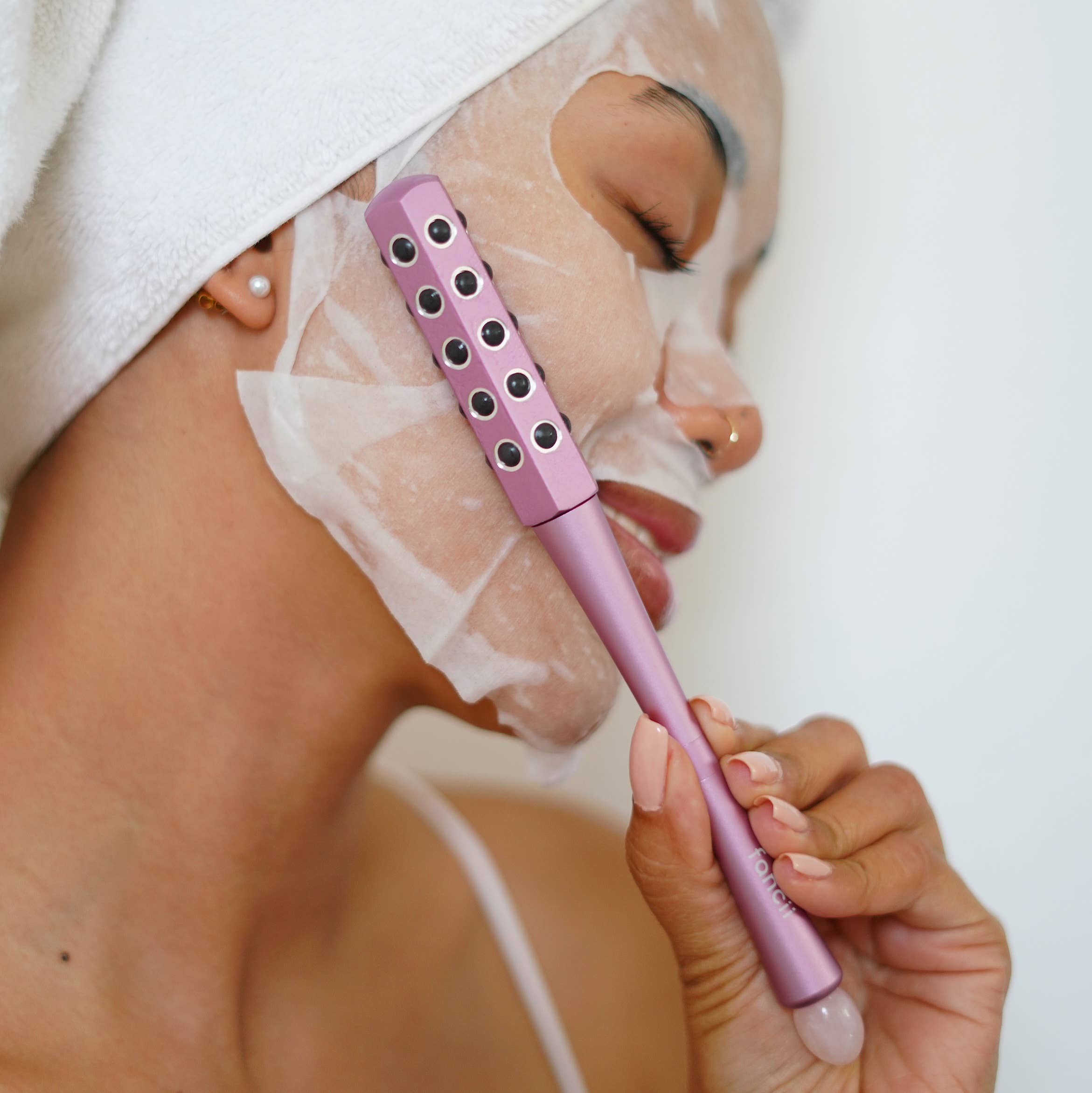 Discover the innovative facial massage device that’s taking Hollywood by storm! Remi is embedded with 30 germanium-infused stones and a rose quartz stone. When rolled over the skin’s surface it stimulates blood circulation increasing collagen production and improving texture, firmness, and elasticity. The germanium stones attract harmful positive electrons from the skin caused by our overexposure to phones, and other electronic devices which contribute to our skin prematurely aging. Remi can be used all over the body to deliver an invigorating massage and relieve tension and stress. Use the rose quartz stone on the end to gently massage around the eyes and temples for the ultimate soothing at-home massage.