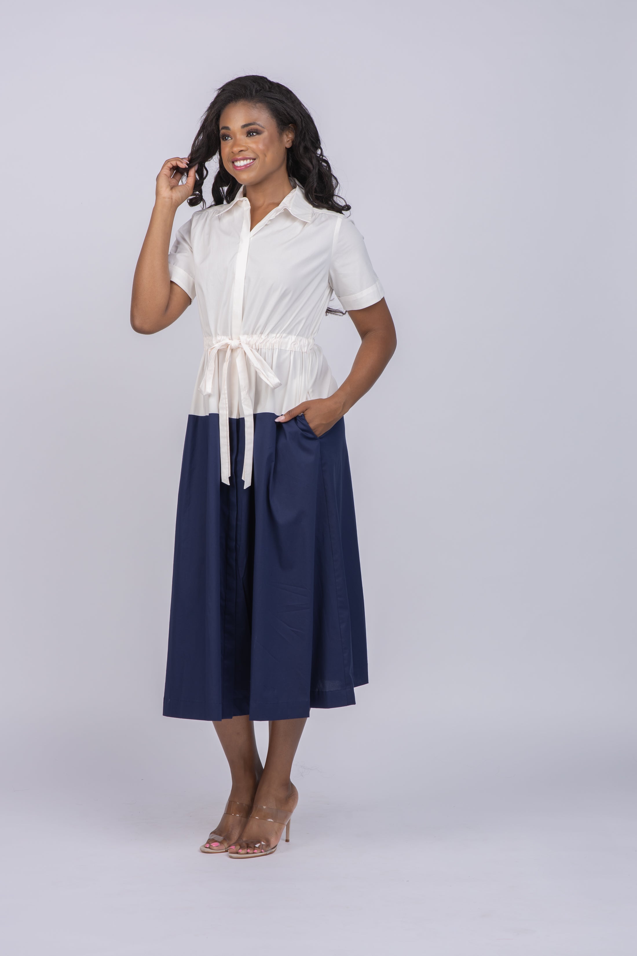 Look great in any season with Shoshanna's Amelie Dress in Navy/White. Crafted of stretch cotton with a point collar, this maxi-length style features a scrunched self-tie waist and colorblocked skirt for a classic look that flatters any silhouette. Take your style game to the next level!