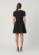 Make a striking entrance with the Shoshanna Andie Dress in Jet/Green/Silver. This textured jacquard cocktail dress features a flattering form-fitted bodice, a round neckline adorned with sparkling jewel embellishments, and charming short puffed sleeves. The shirred full-volume mini skirt adds playful movement and includes convenient side pockets. Fully lined for comfort, it also has a hidden back zipper for a sleek finish. Ideal for evening events, it blends elegance with modern flair.