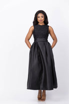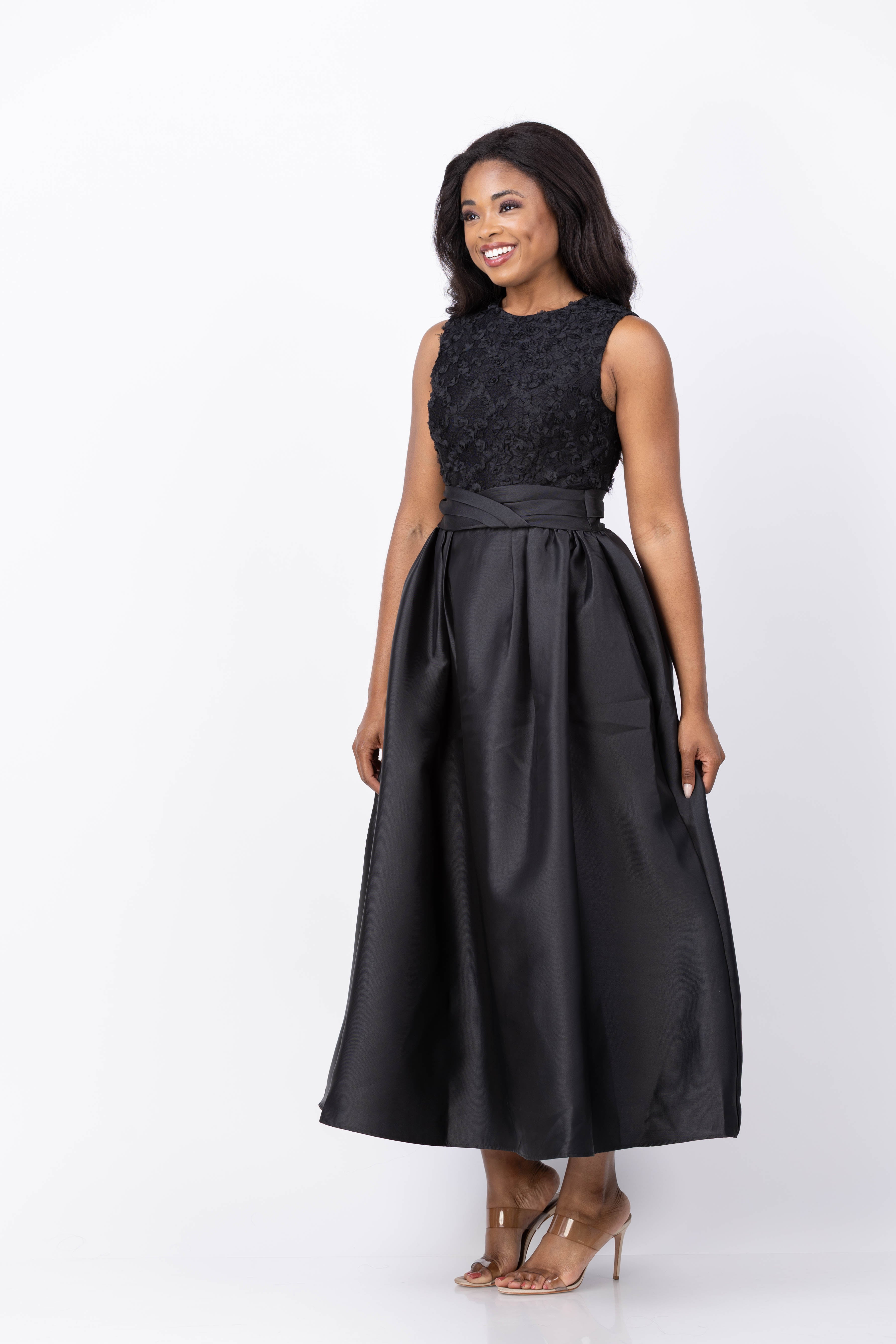 The Shoshanna Beth Dress in Jet is a stunning mixed media cocktail dress featuring a round neckline and a sleek, sleeveless bodice crafted from textured mesh lace. Its beautifully draped waistband accentuates the waist, flowing into a full-volume skirt made from luxurious Mikado fabric. Fully lined with a hidden back zipper, this dress combines elegance and comfort for an unforgettable evening look.