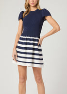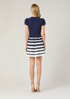 The Shoshanna Colette Dress in Navy/Ivory combines classic charm with playful style. Featuring a solid navy fitted bodice and a flared A-line mini skirt adorned with horizontal ivory stripes, this dress offers a flattering silhouette. Its round neckline and short flounce sleeves add a feminine touch, while the unlined design ensures lightweight comfort. Easy to slip on, it’s perfect for effortless elegance at any casual or semi-formal occasion.