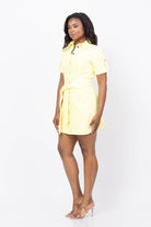 Brighten your wardrobe with the Shoshanna Corie Dress in Sunburst, a charming yellow denim mini shirtdress designed for effortless style. Featuring a classic shirt collar, silver snap front placket, and cuffed short sleeves with button tabs, it offers both comfort and flair. The shift silhouette is enhanced with belt loops and a separate tie belt for a customizable fit. Detailed topstitching and multiple pockets add practical elegance, making this unlined dress perfect for sunny days and casual outings.